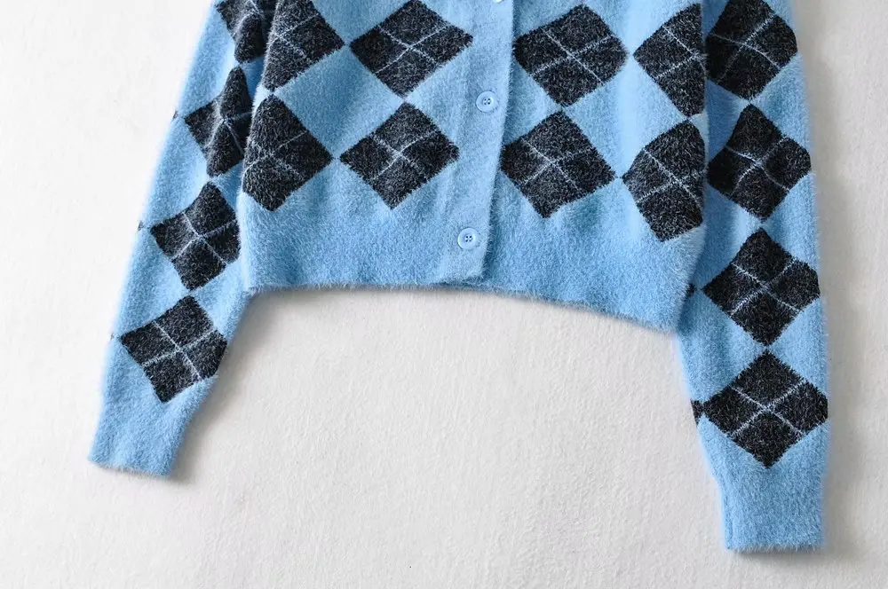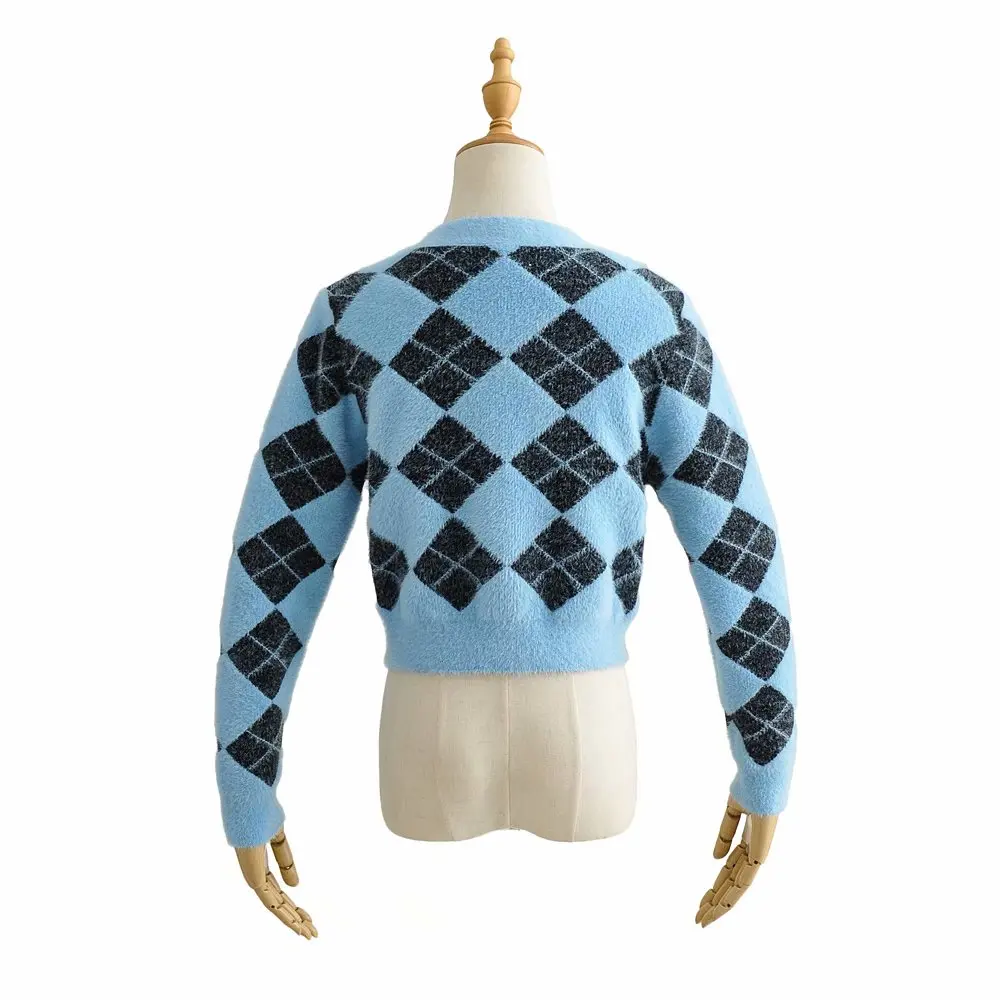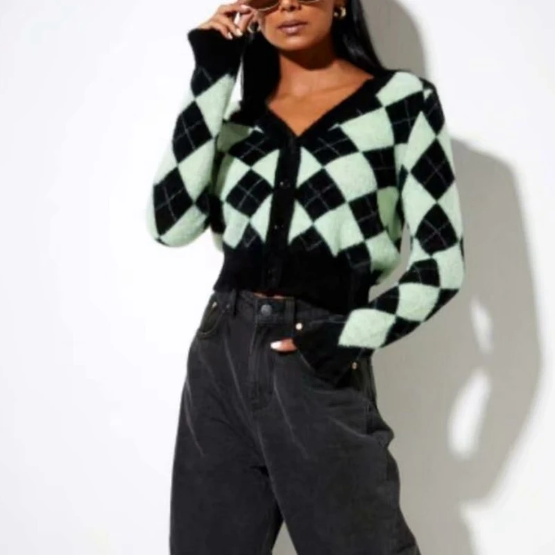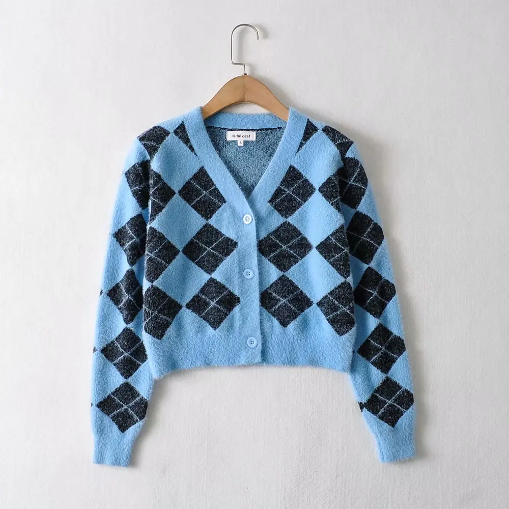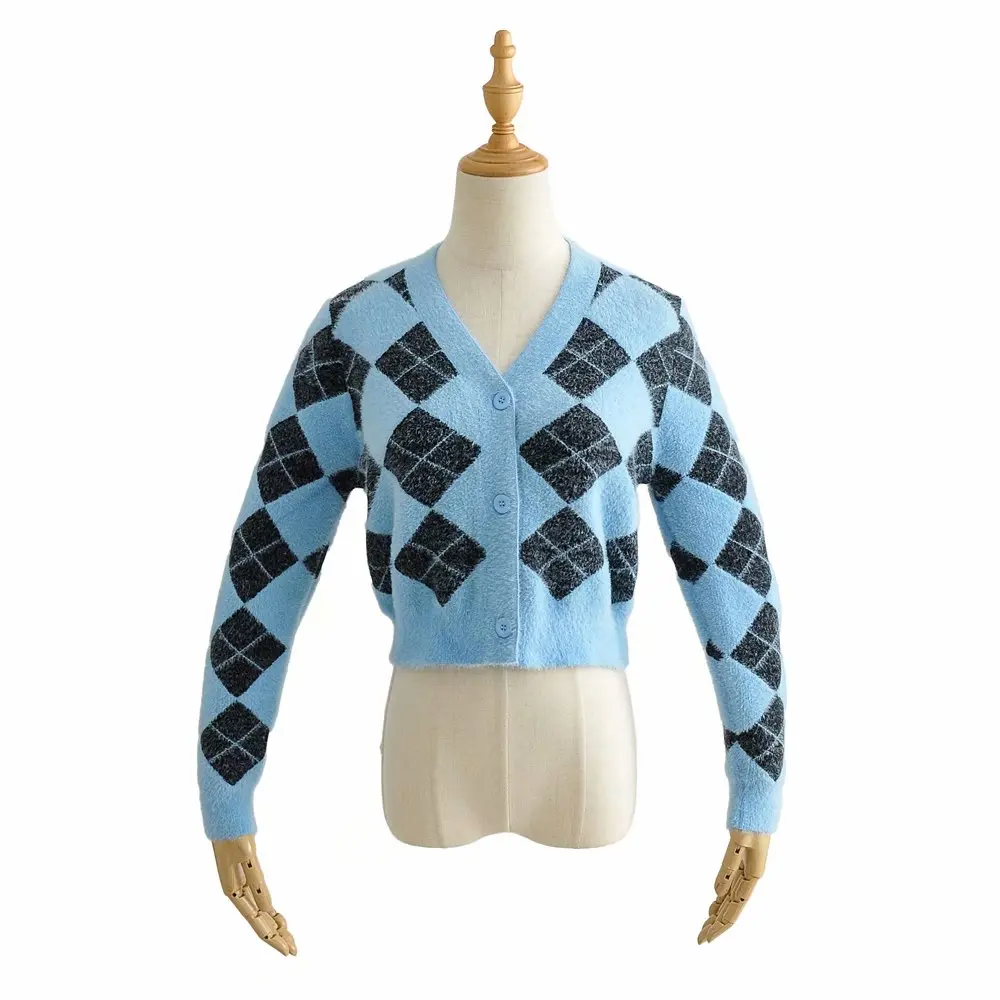 Fall woman sweaters knitted argyle sweater vintage long sleeve crop top cardigan sweater winter tops korean v neck sweater green