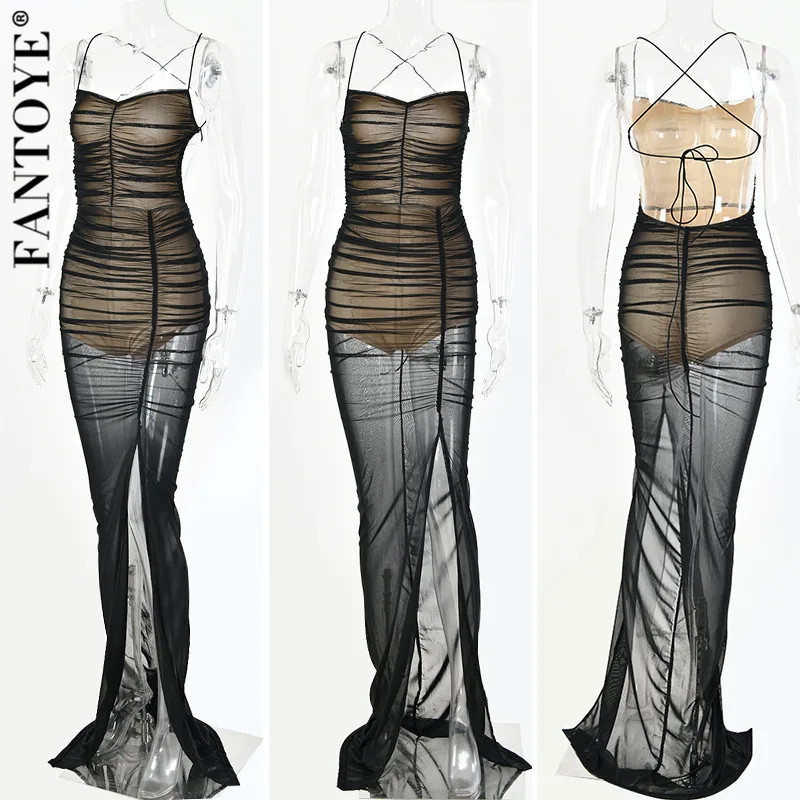 FANTOYE Double-Layer Mesh See-Through Dress With Inner Women Sexy Backless Maxi Bodycon Party Dress Summer Beachwear Dresses