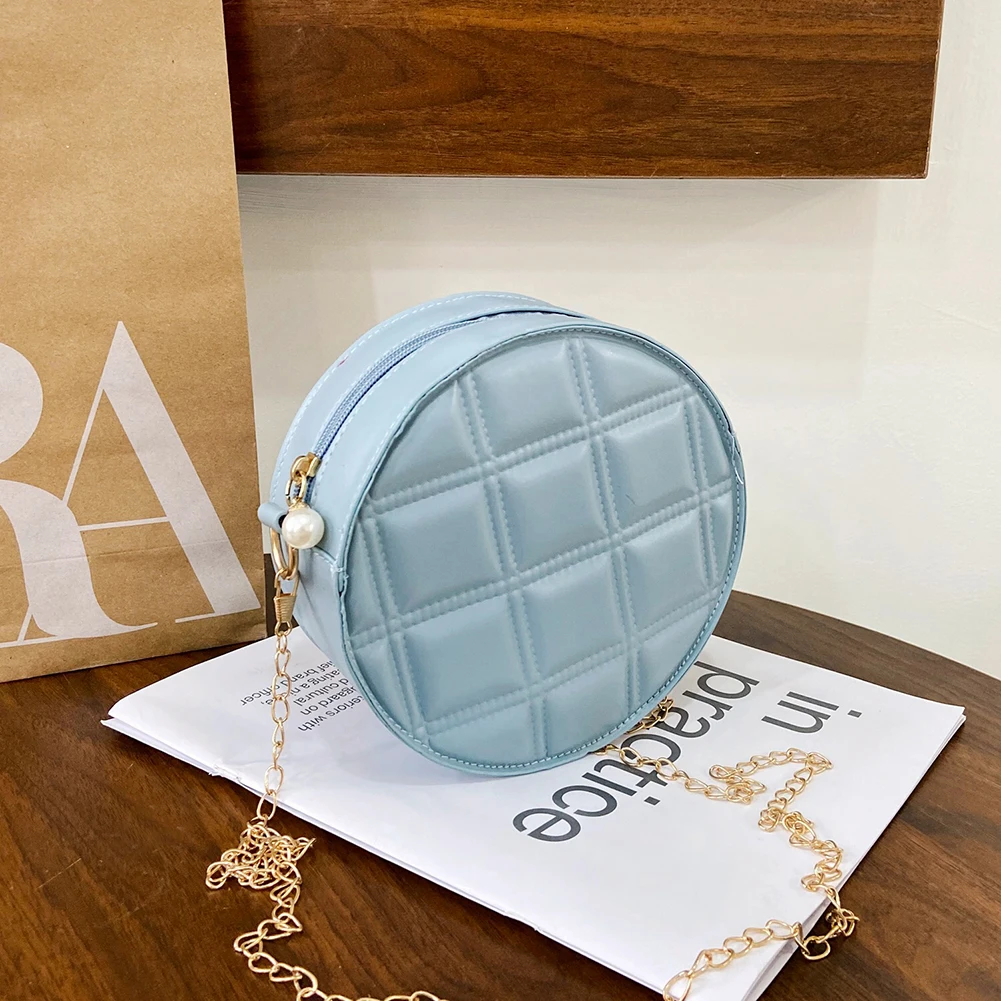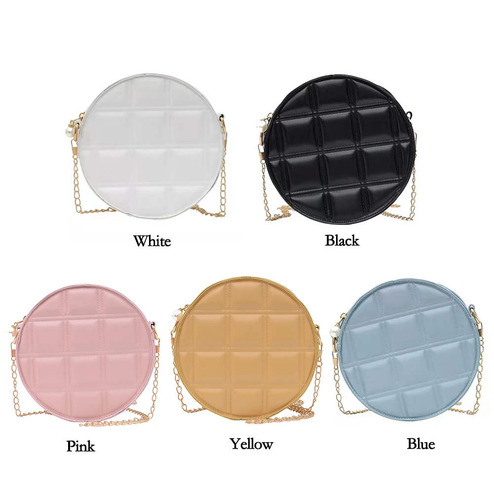 Fashion Women Plaid Shoulder Bag Round Circle Purse Lady PU Leather Chain Small Zipper Solid Color Crossbody Messenger Satchel