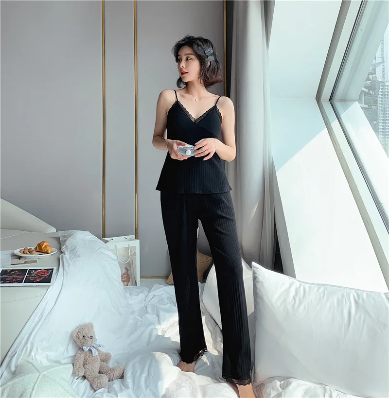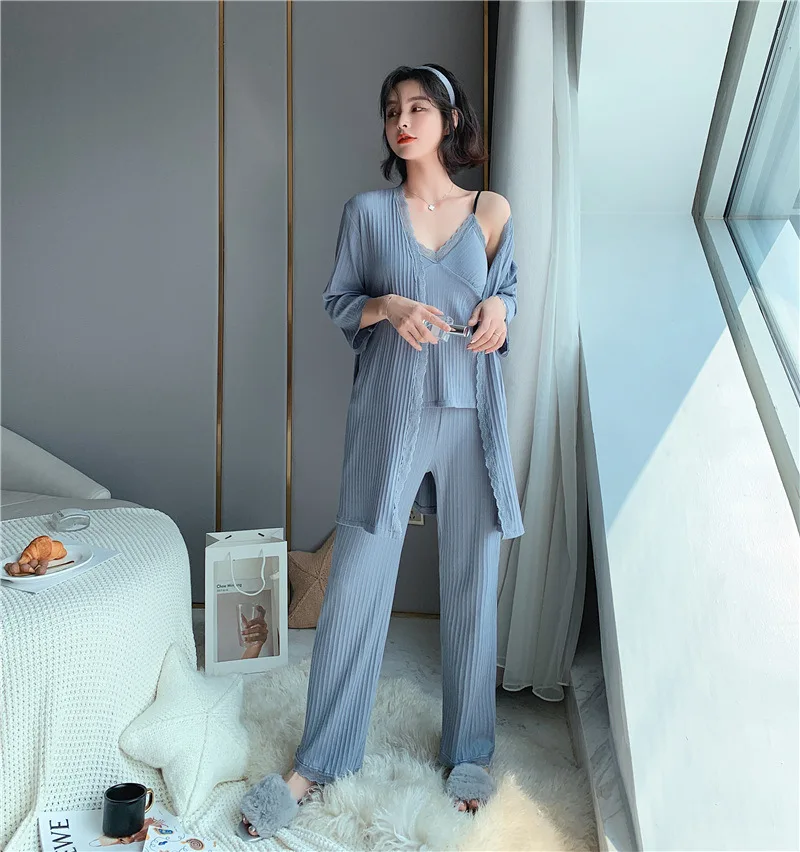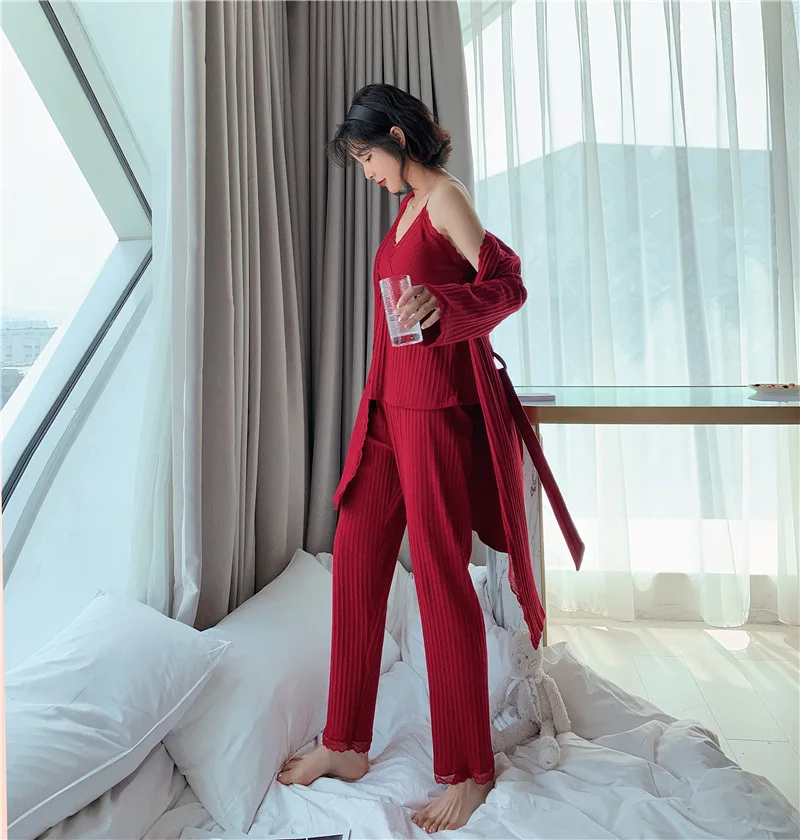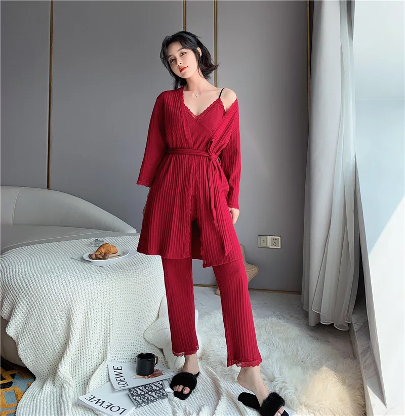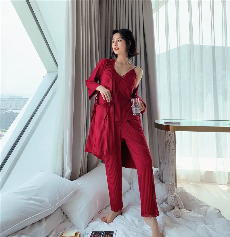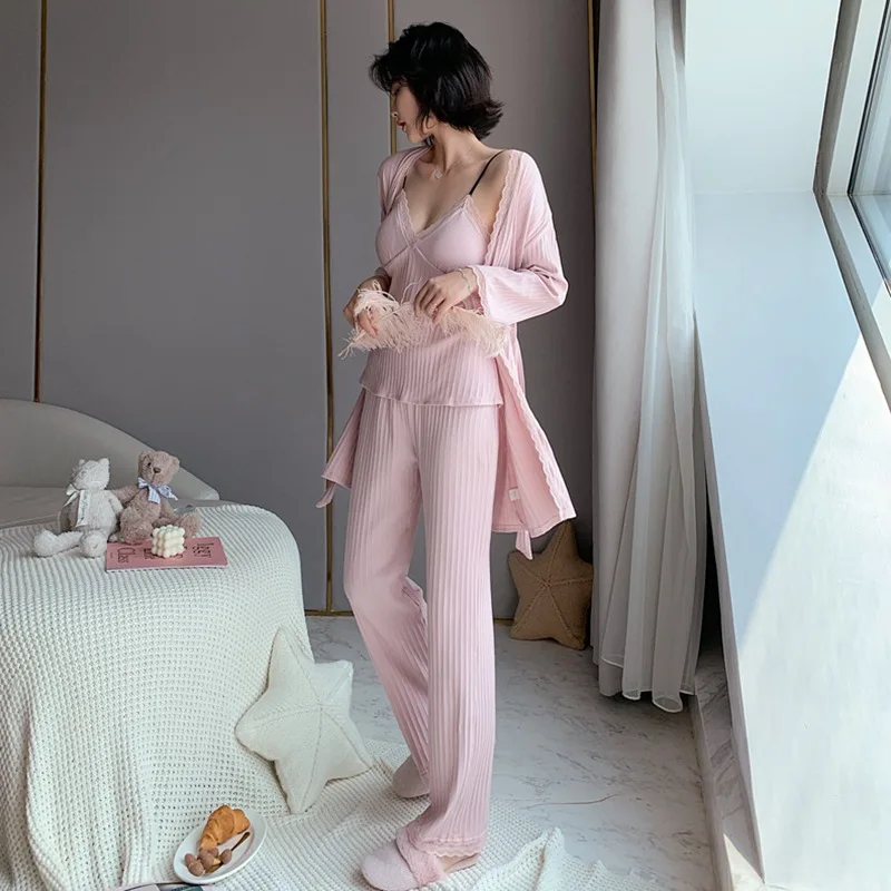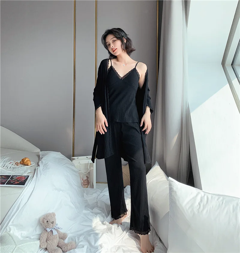 Fdfklak 100% Cotton Pajama Sets Women 2022 Spring New Sexy 3Pcs Elegant Sleepwear Home Suit Lady Pink/Black Pijama Feminino