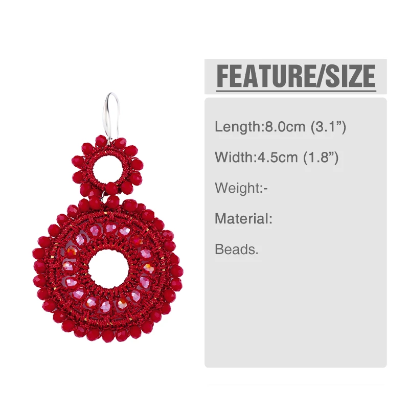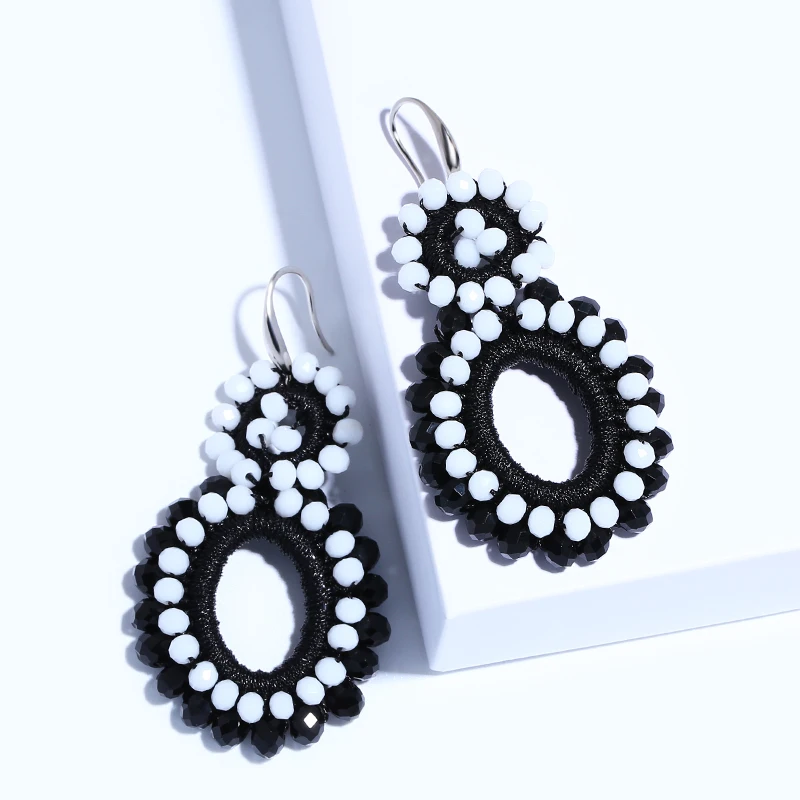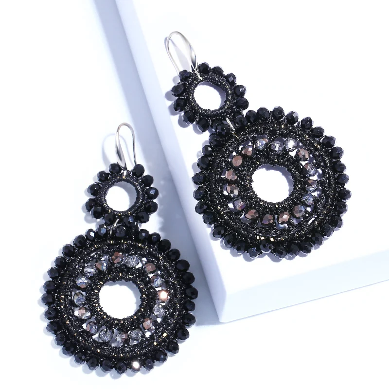 FLOLA Bohemia Crystal Beads Woven Earrings Woman Handmade Black Beads Big Earrings Ethnic Oorbellen Big Drop Earring ersm93