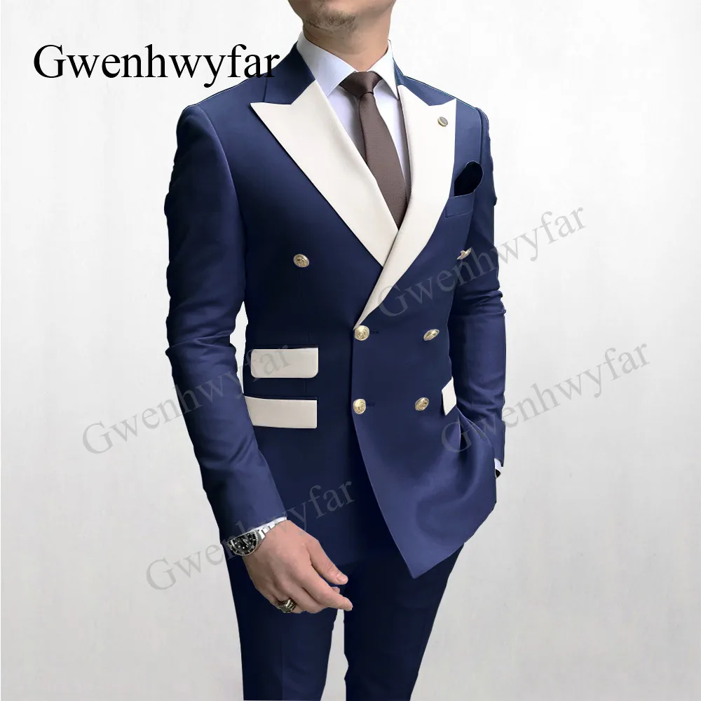 Gwenhwyfar Solid Navy Men Party Tuxedos Suits 2 Pieces Latest Mix Color White Lapel Men Suits Gold Buttons Fashion Style Suits