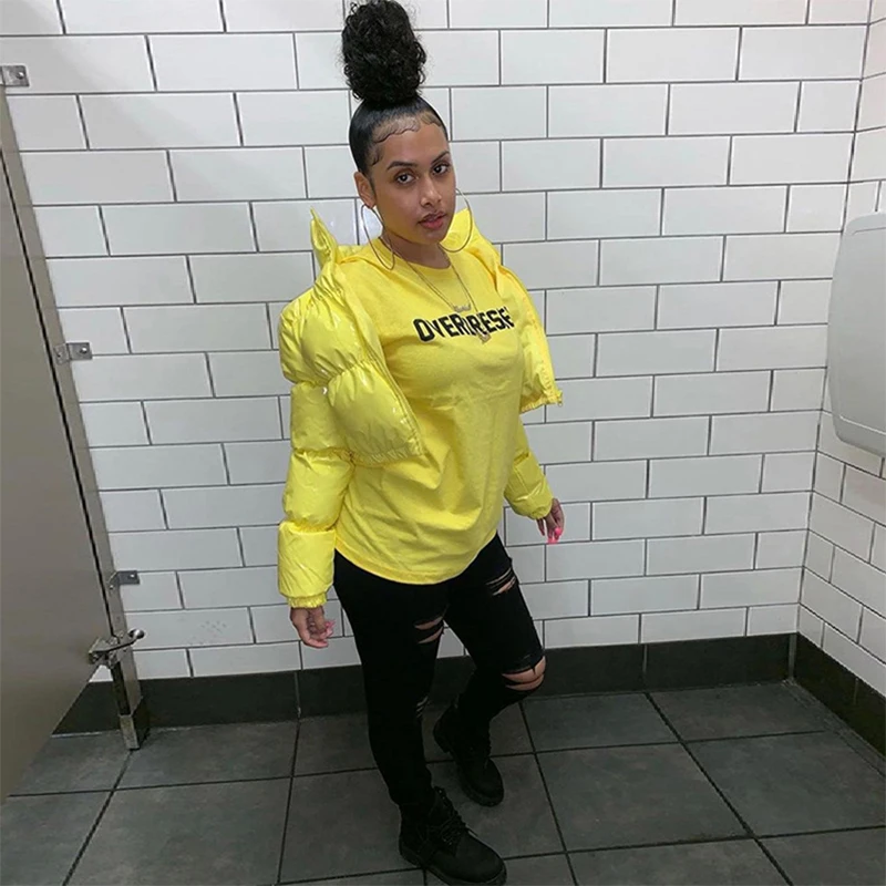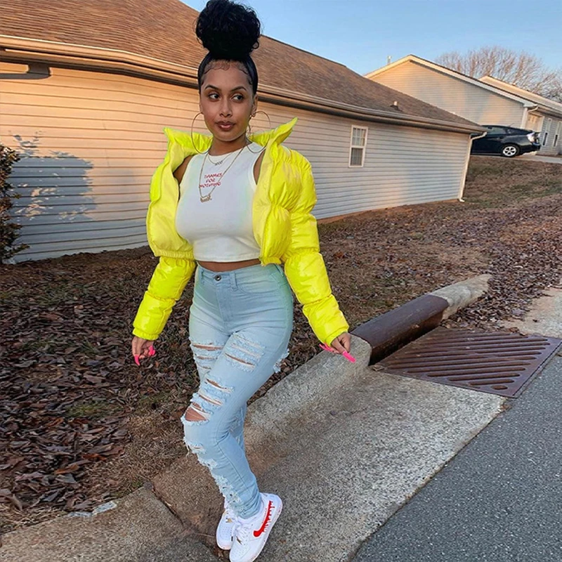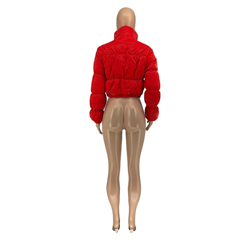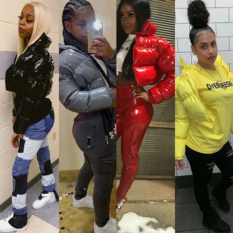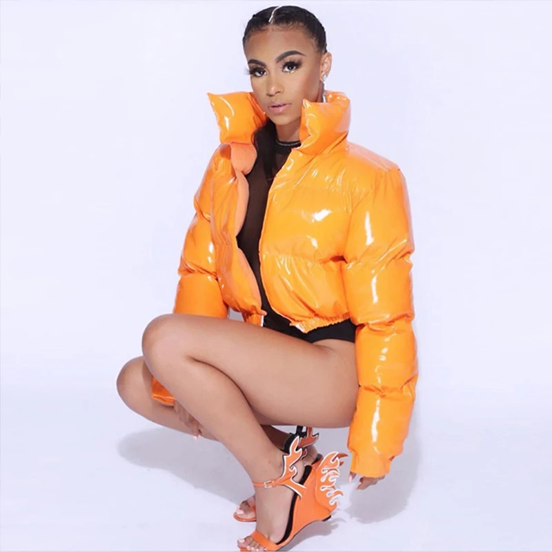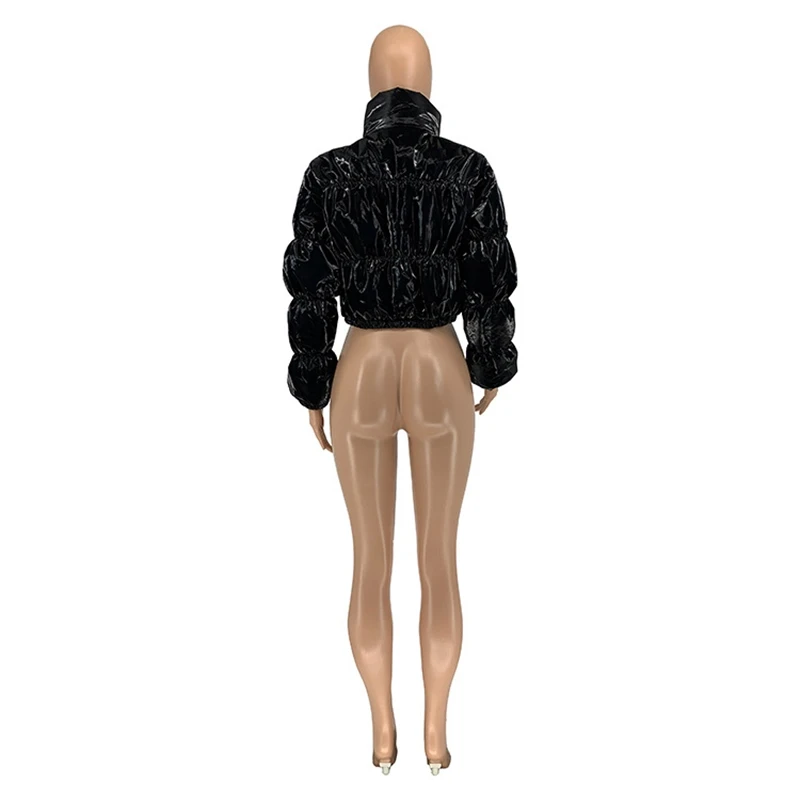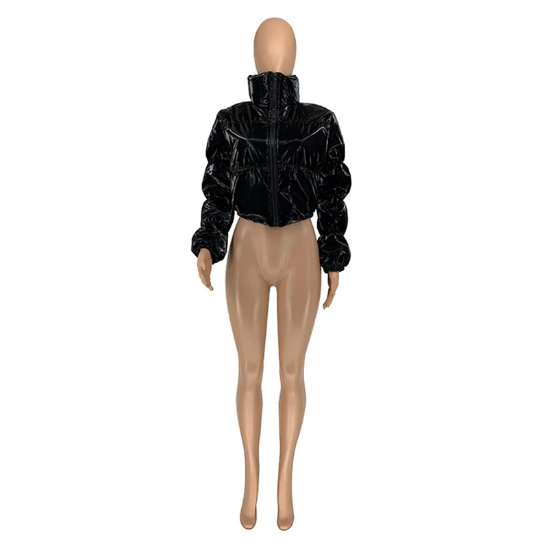HAOYUAN Bright PU Leather Bubble Coat Winter Clothes Women Fashion Cropped Puffer Jacket Long Sleeve Warm Parkas Fashion Coats