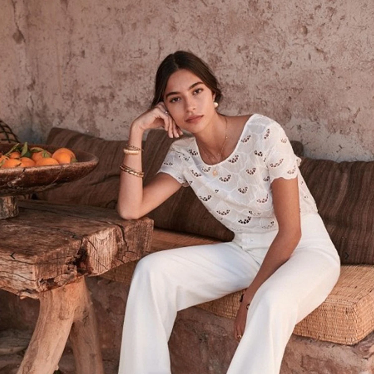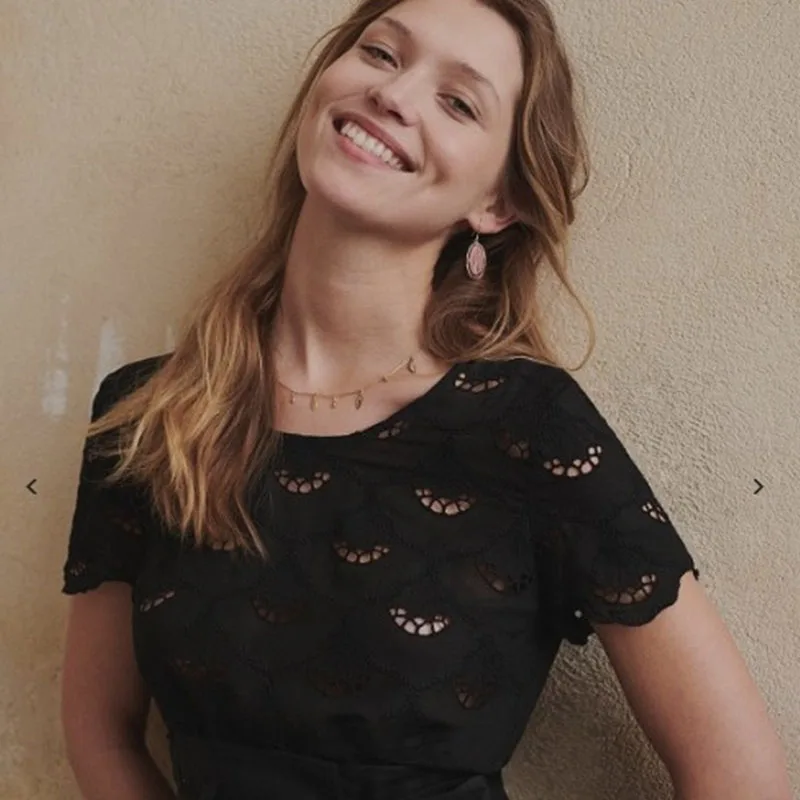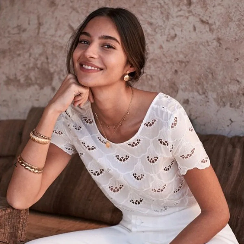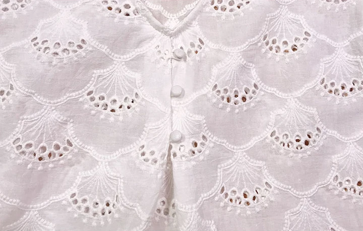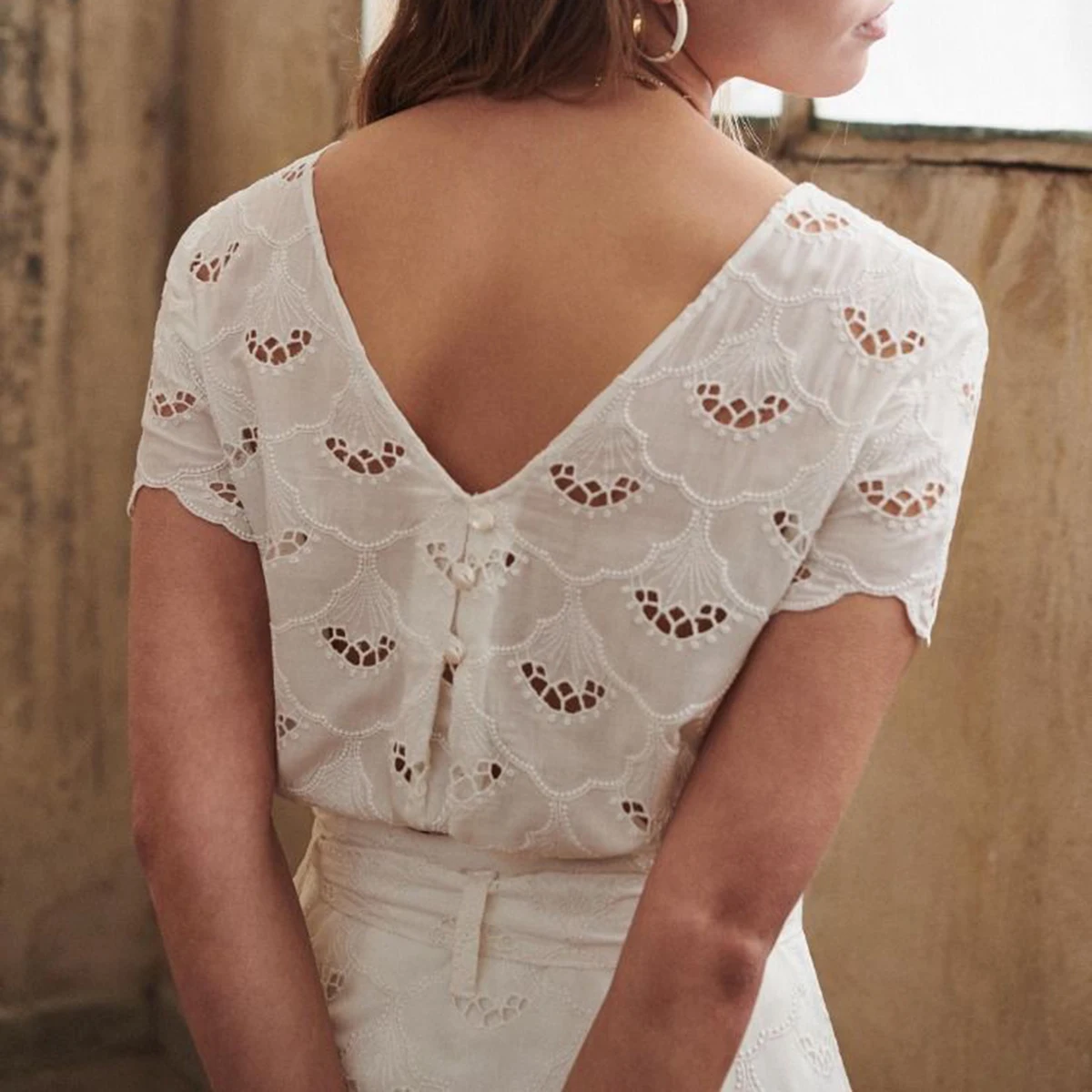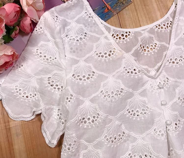 Hollow Out Deep V Backless Blouses Floral Embroidered Button Petal Sleeve O Neck Shirt Women Casual Vintage Tops Summer 2020