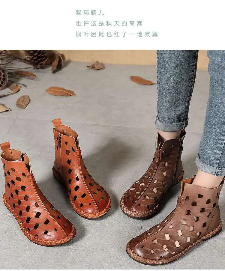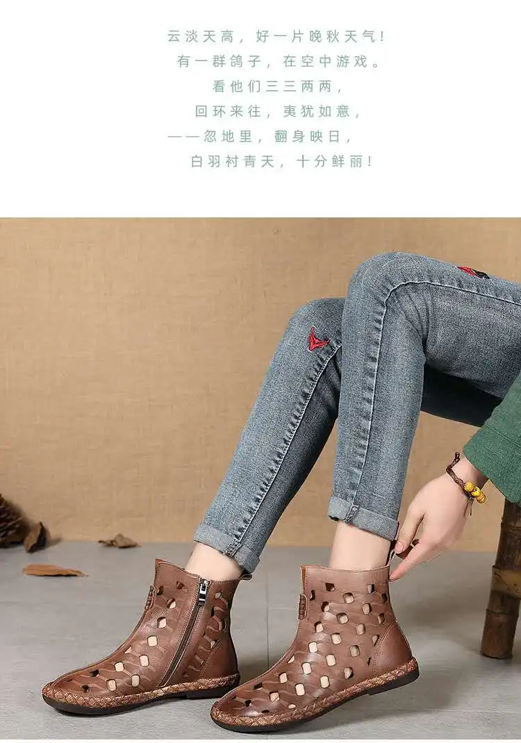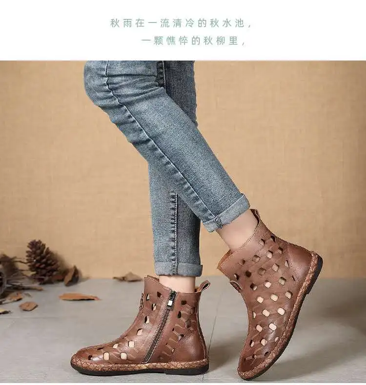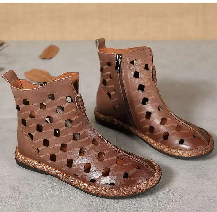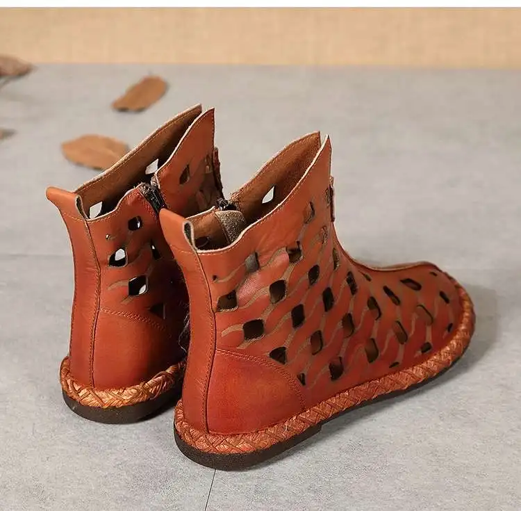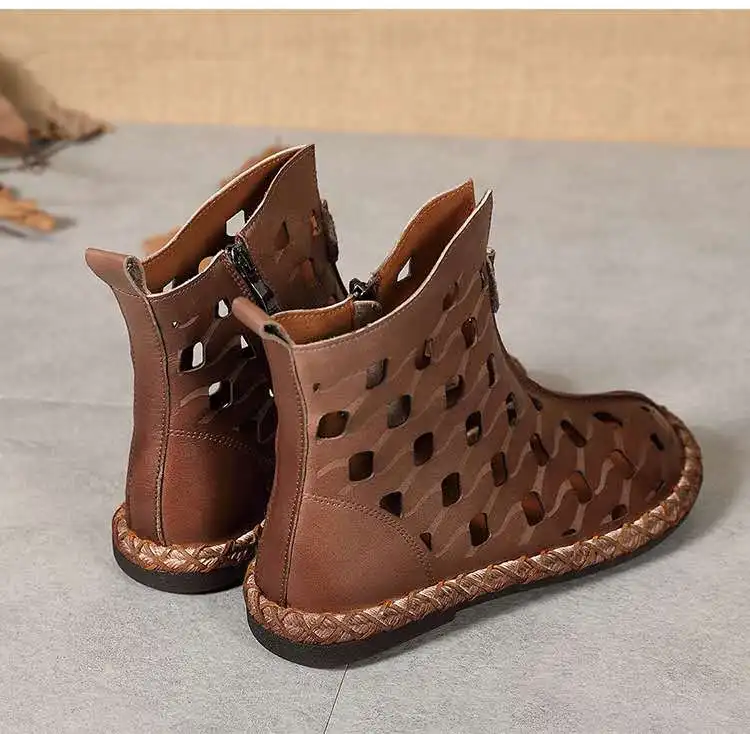 HOT Summer Women Ankle Boots Handmade Genuine Leather Hollow out Sandals Wedge Women's Shoes Soft Bottom Women Boots Zip