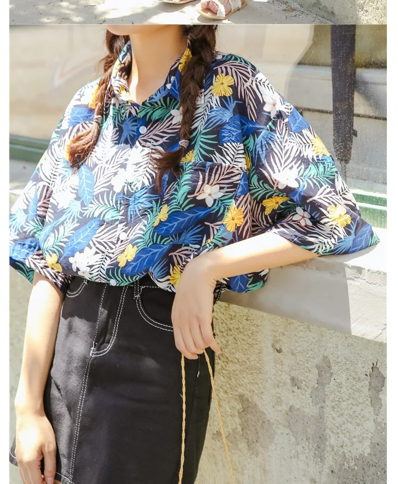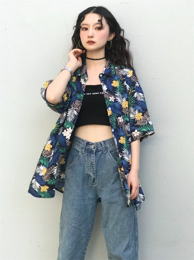 HOUZHOU Hawaiian Shirts Harajuku Vintage Women's Beach Shirt Button Up Cardigan Short Sleeve Chiffon Blouse Summer Top