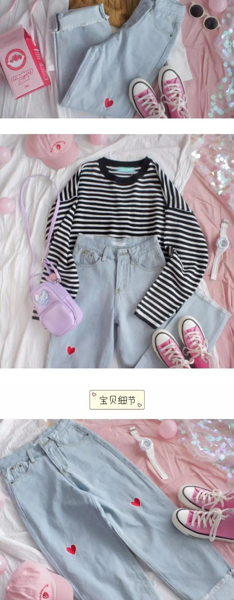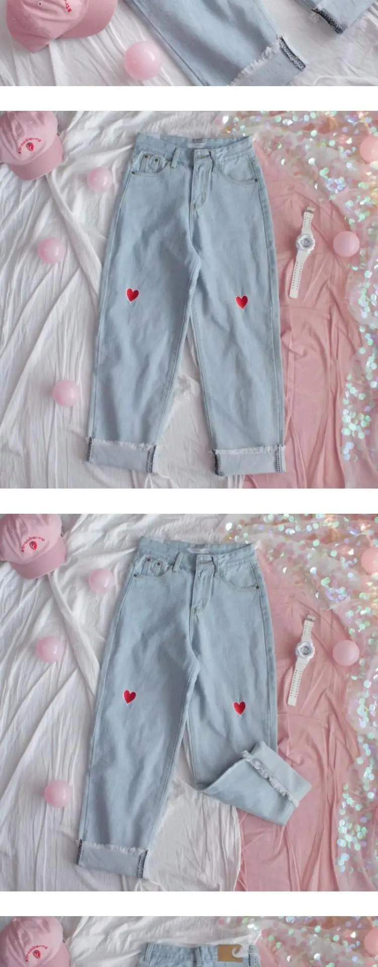 Japanese Lolita Women Blue Jeans Harajuku High Waist Heart Embroidery Tassel Trousers Vintage Washed Cotton Denim Wide Leg Pants