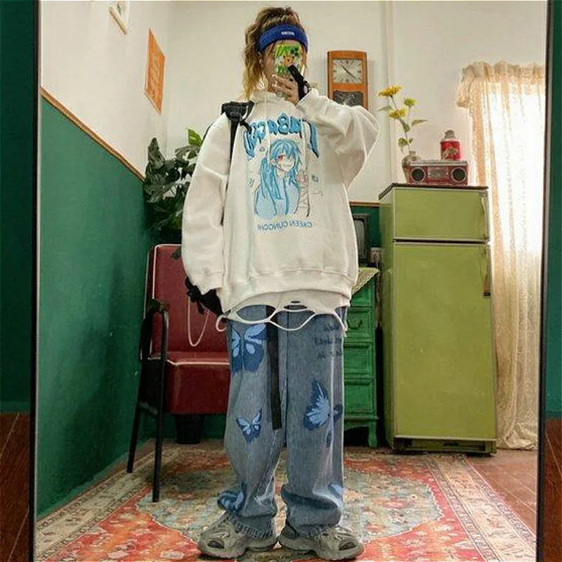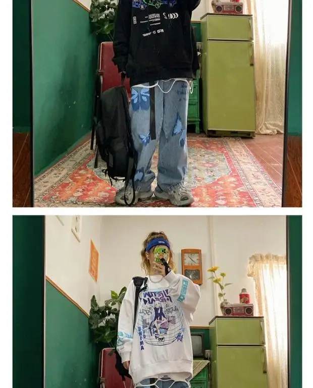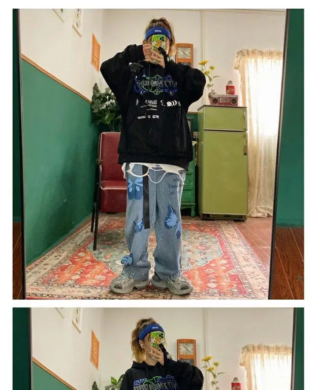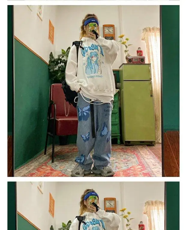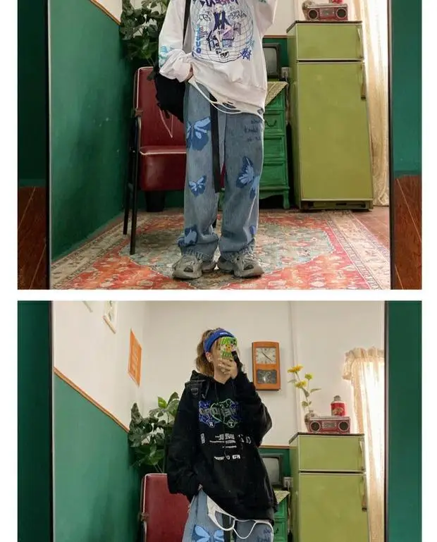 Jeans Women Baggy Denim Couple Streetwear Chic Popular High Waisted Butterfly Pattern Pockets Full Length Straight Trouser Daily