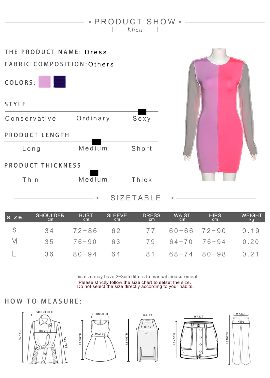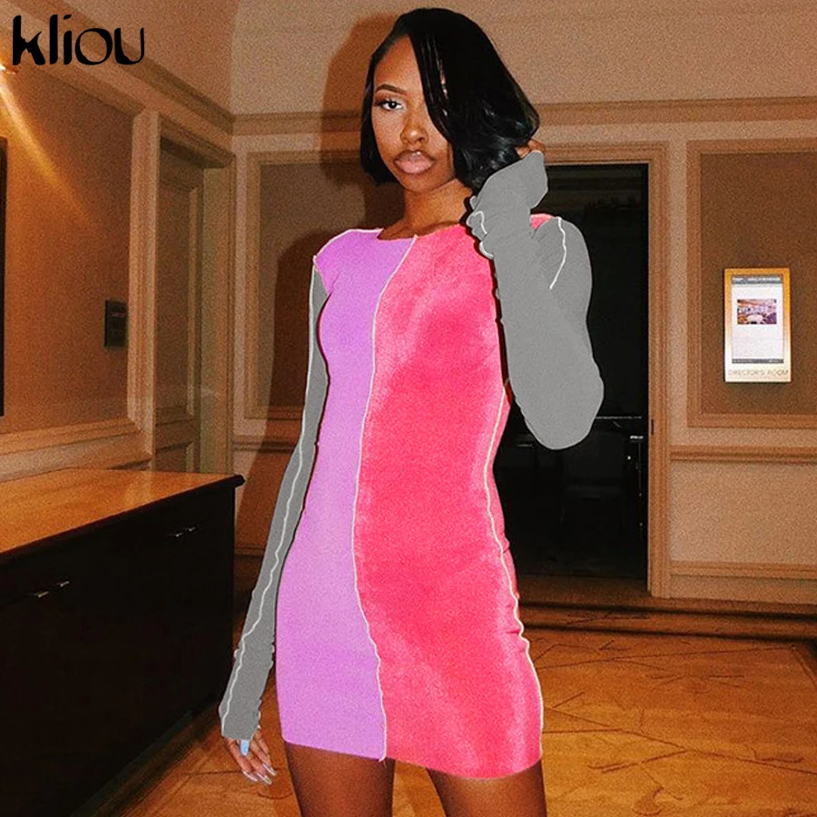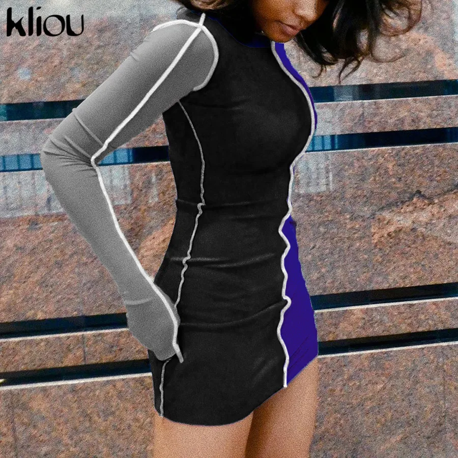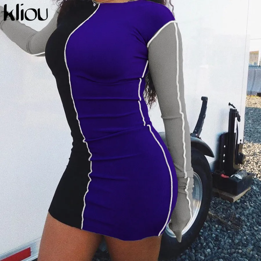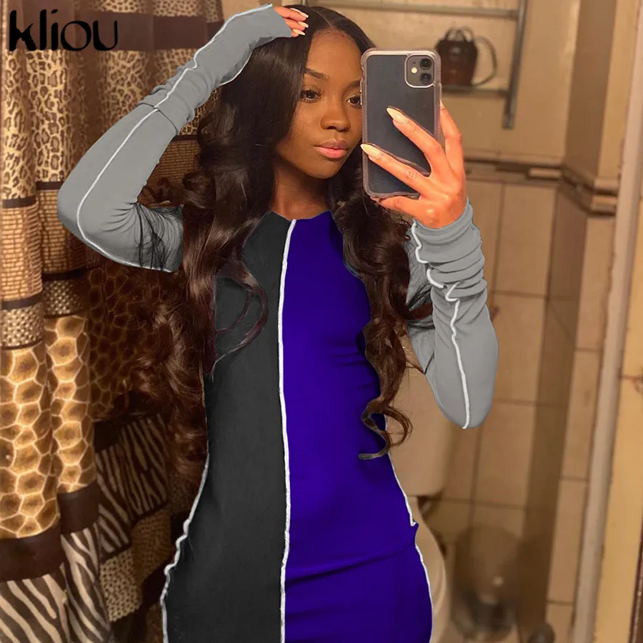 Kliou women striped patchwork bodycon long sleeve dress fitness stretchy skinny o-neck mini fashion streetwear casual dresses
