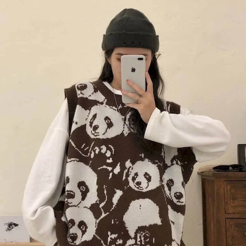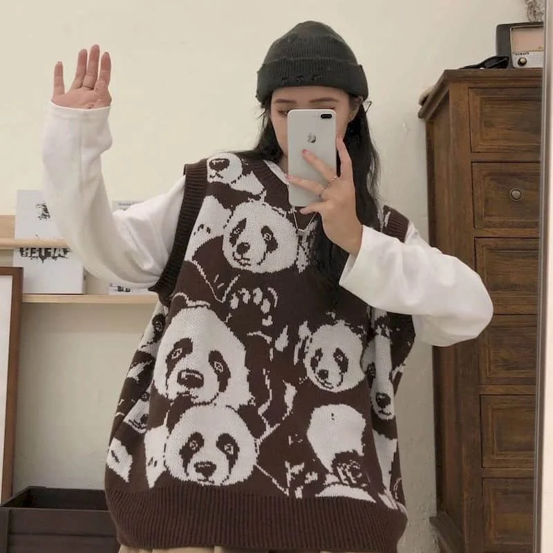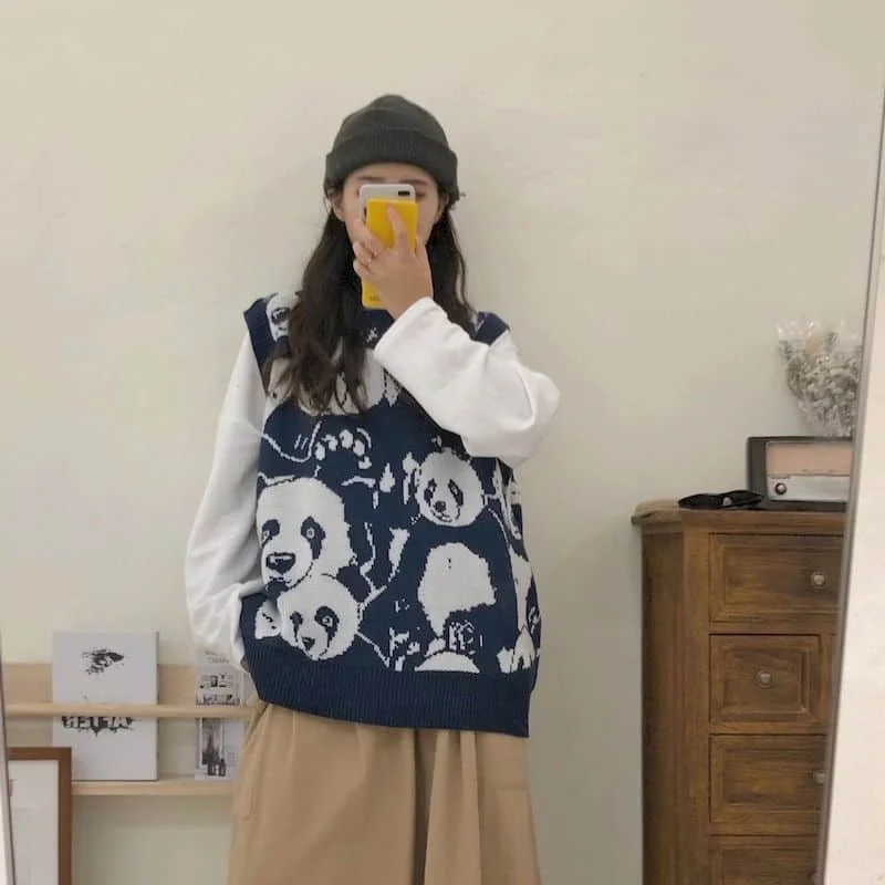 Knitted Vest Sweater Female Autumn And Winter New Style Japanese Cute Panda Jacquard Student Sleeveless Kawaii Sweater Women