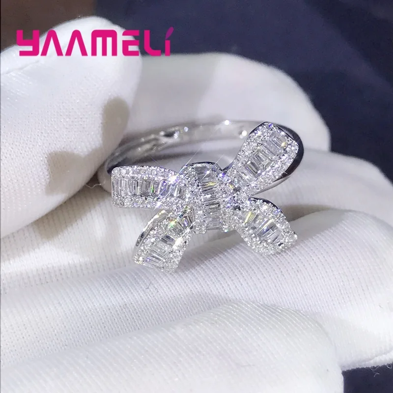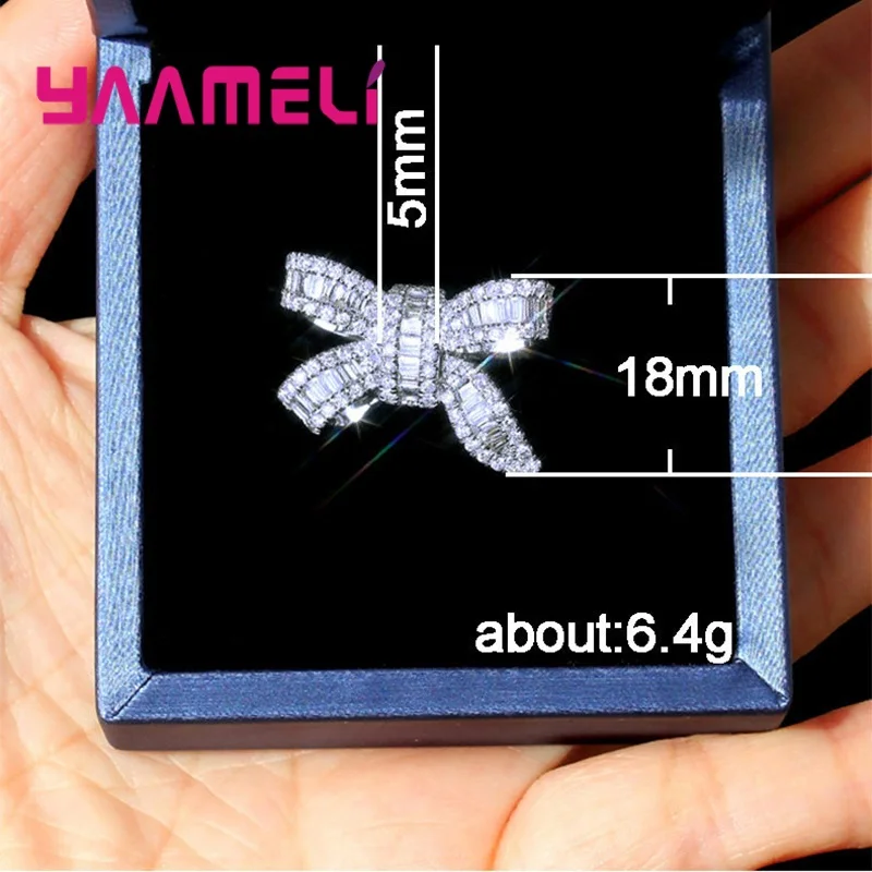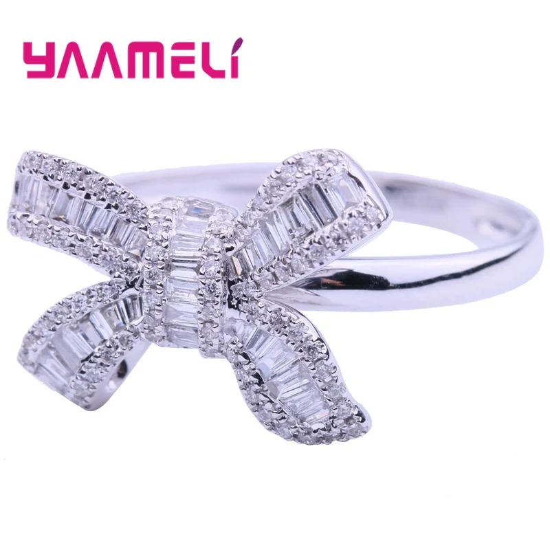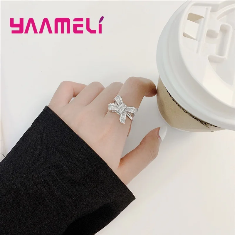 Korean Stylish Princess Queen Ladies Ring Luxury Sterling Silver 925 Rhinestone Bowknot Charming Jewelry for Wedding