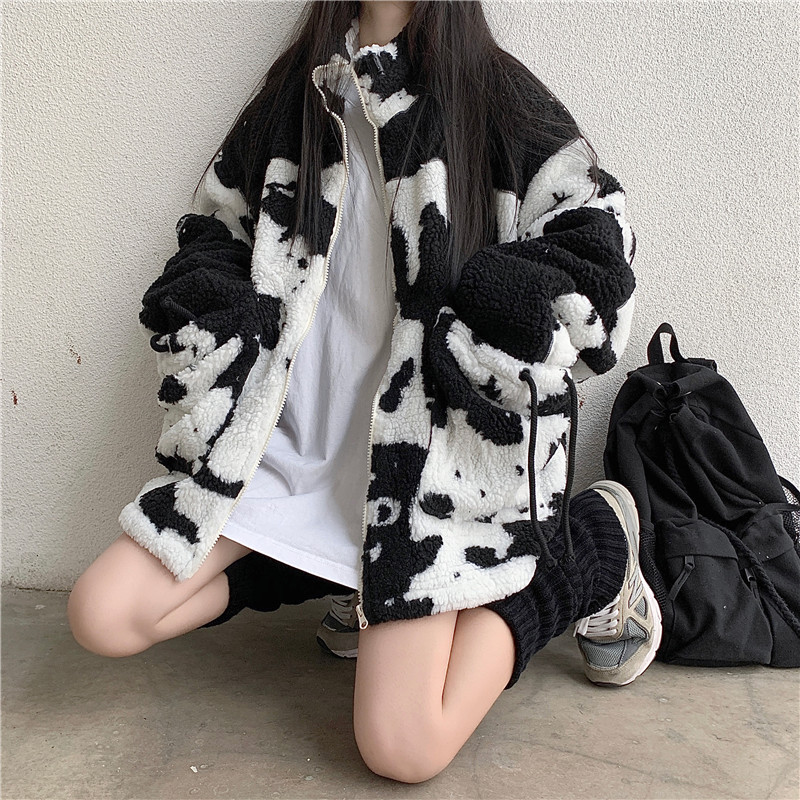 Korean Winter New Coat Harajuku Style Cows Printing Loose Full Sleeve Lambswool Jacket Vintage Keep Warm Thicken Cotton Clothes