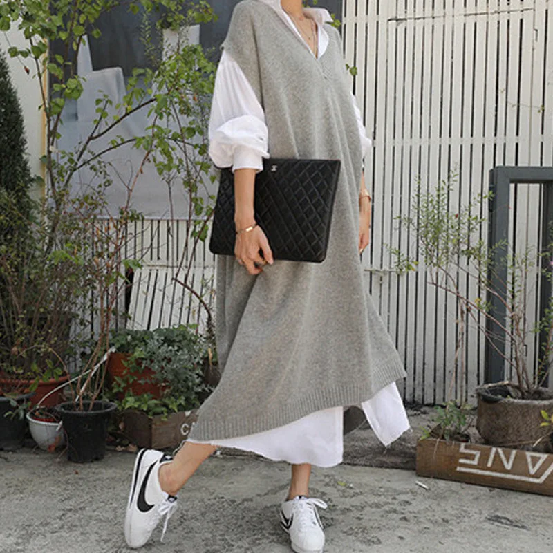LANMREM Long vest coat over knee Korean style loose large size student sweater bfwind bat sleeve sweater dress trendy