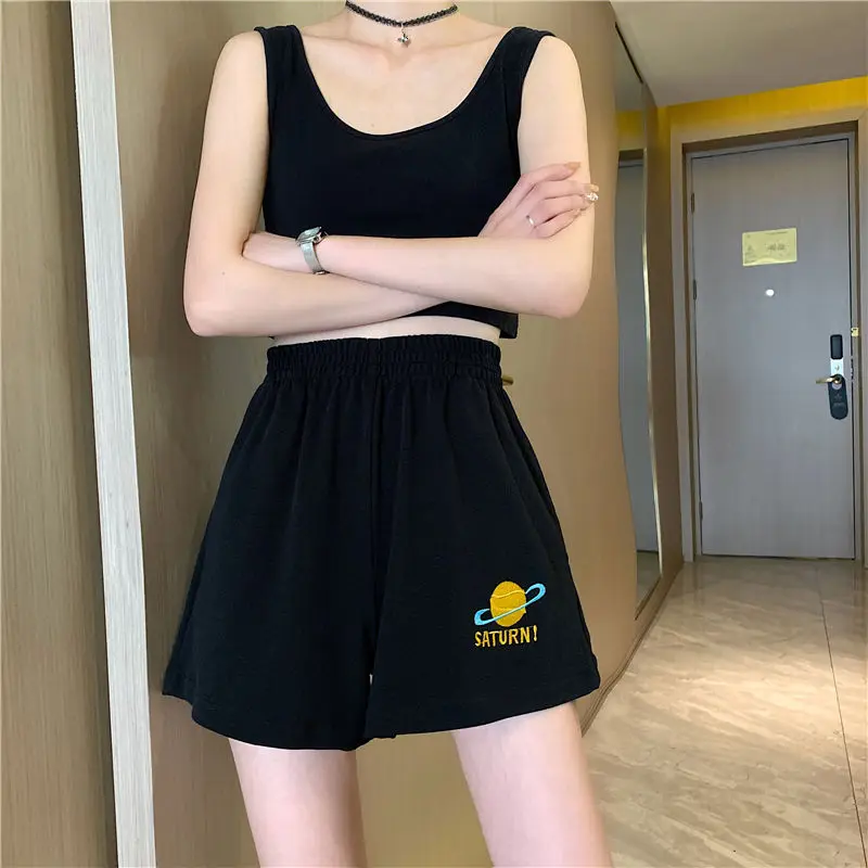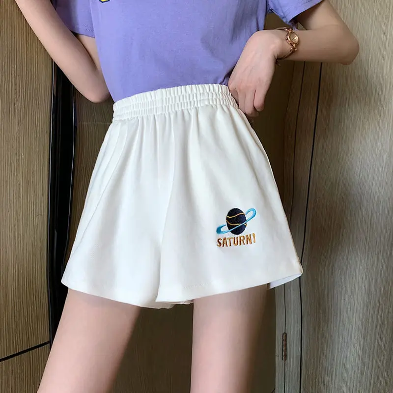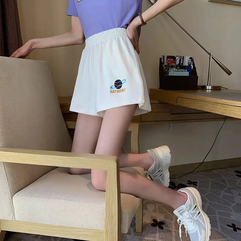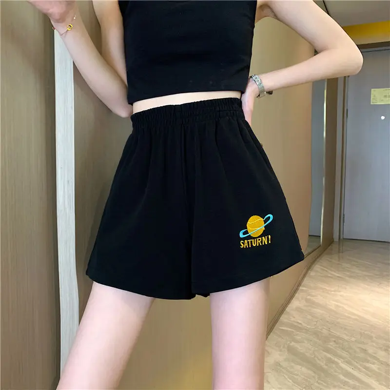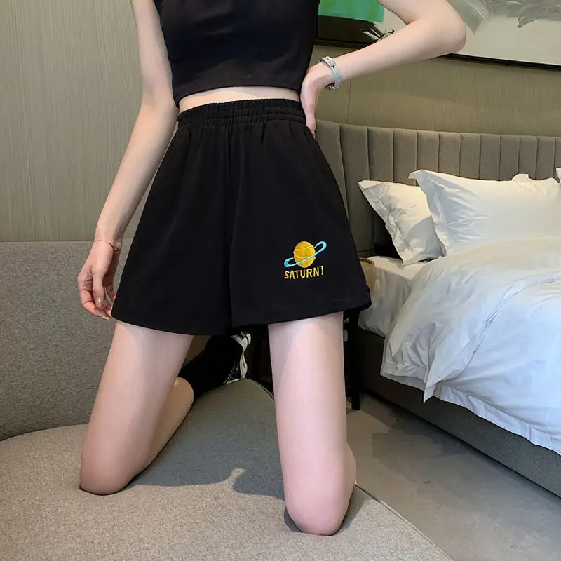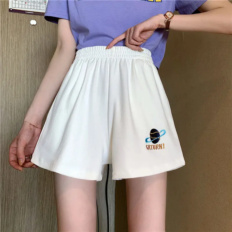 Loose Solid Wide-leg Harajuku Casual Simple Ins Trendy All-match Женские штаны Straight Planet embroidery Shorts Women Summer