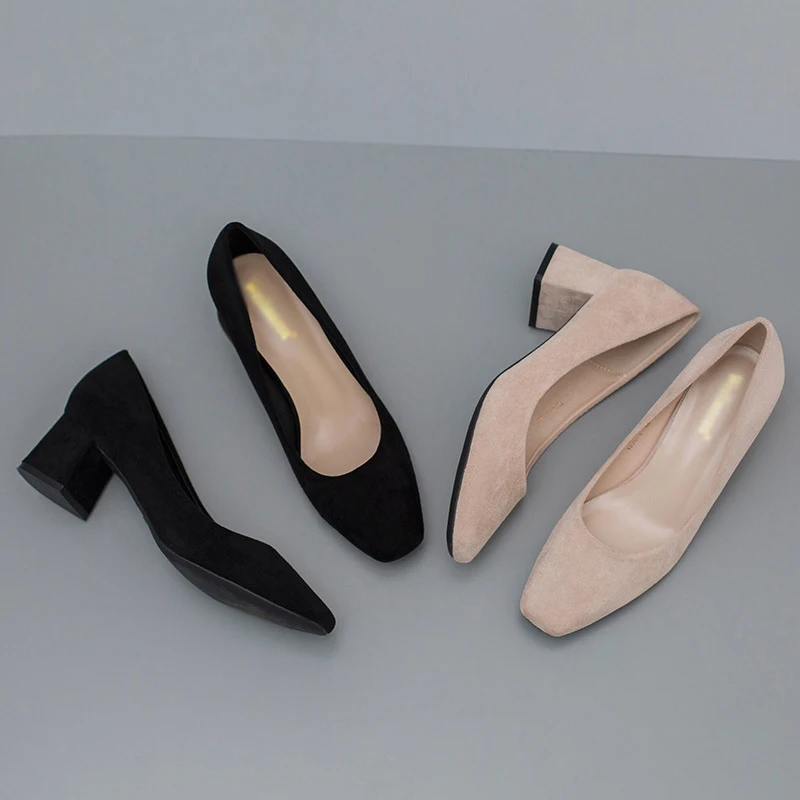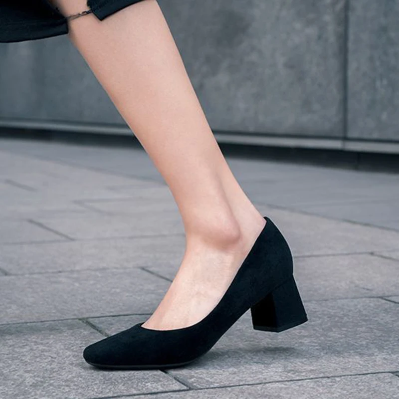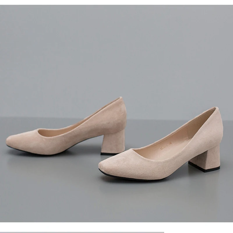 MAIERNISI Women Pumps Thick High Heels 5cm Dress Work Ladies Shoes Rough Flock Ankle Thick Heel Women Shoes Square Heel Shoes