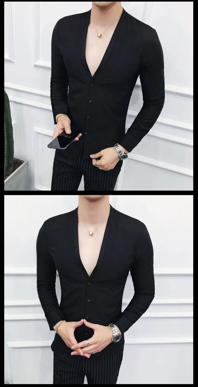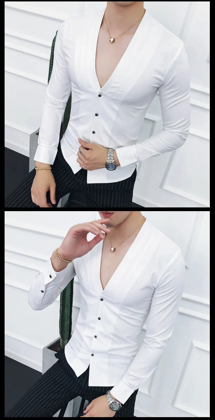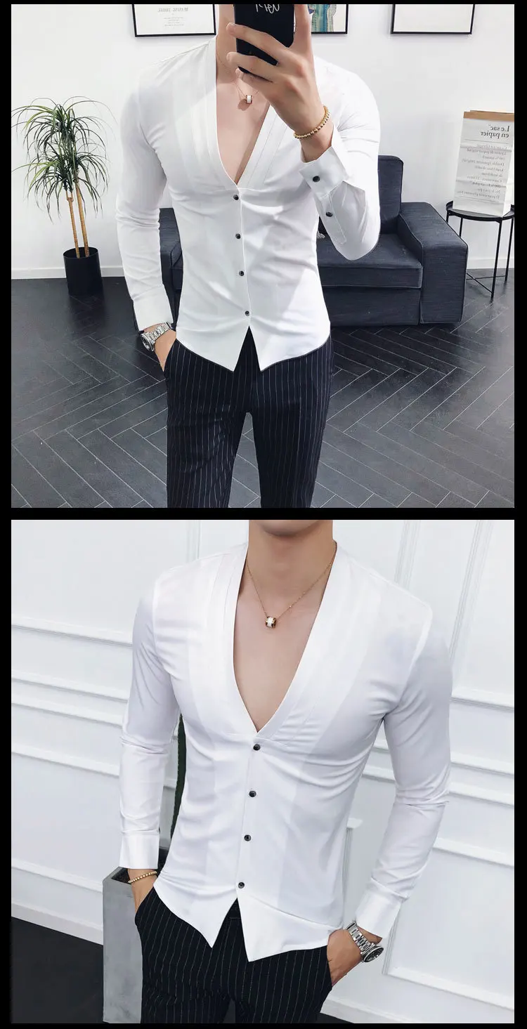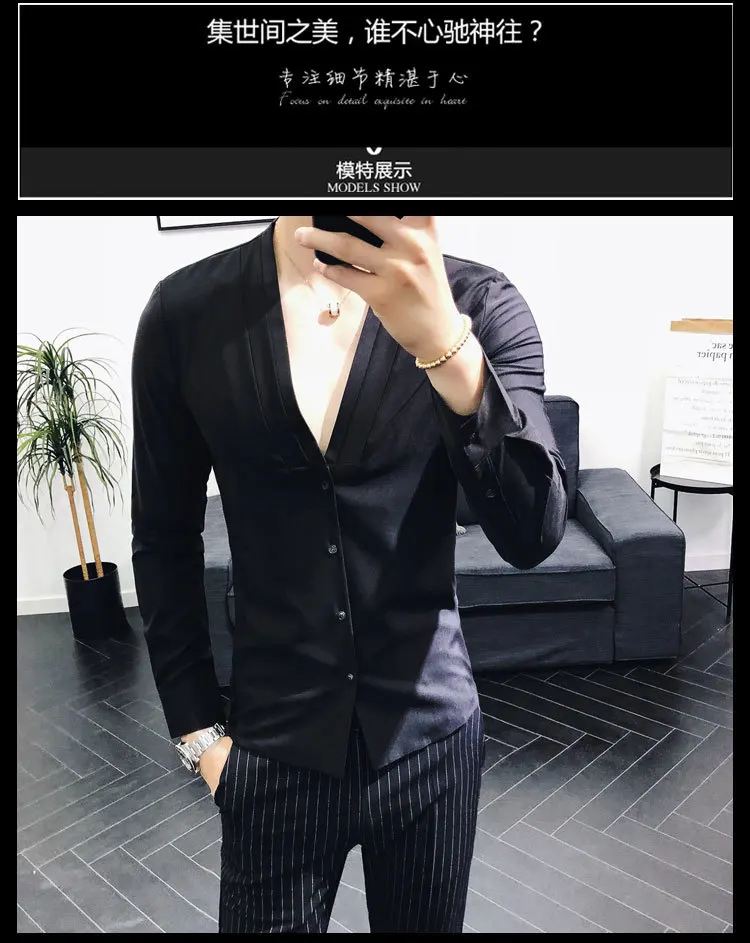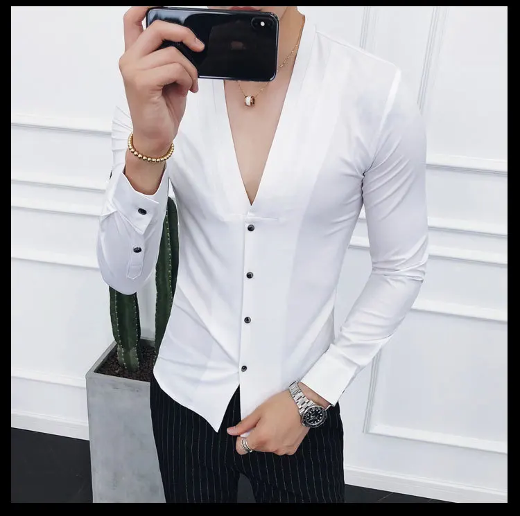 Men Sexys Deep V Collarless Shirt 2020 Mens Long Sleeve Slim Fit V Neck Pleating Solid Dress Mens Shirts
