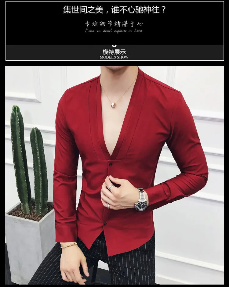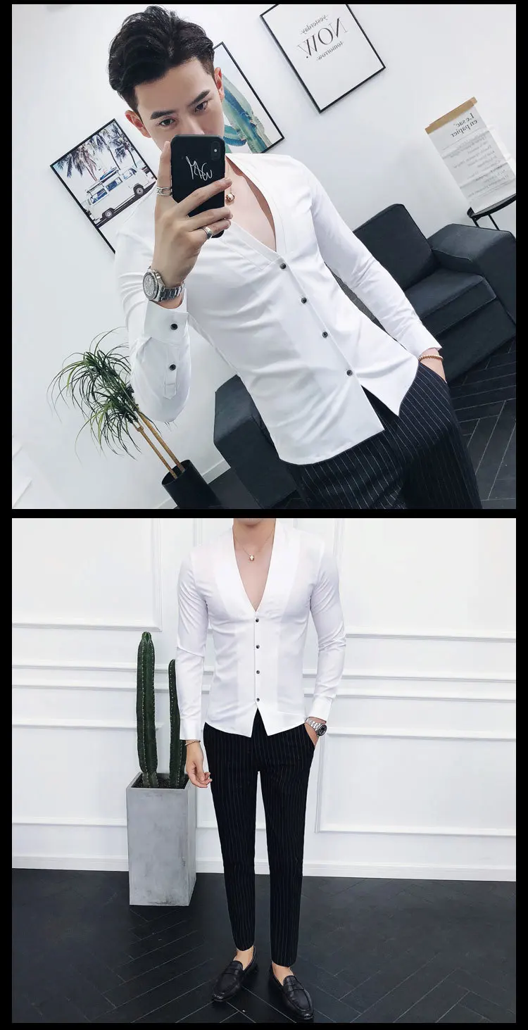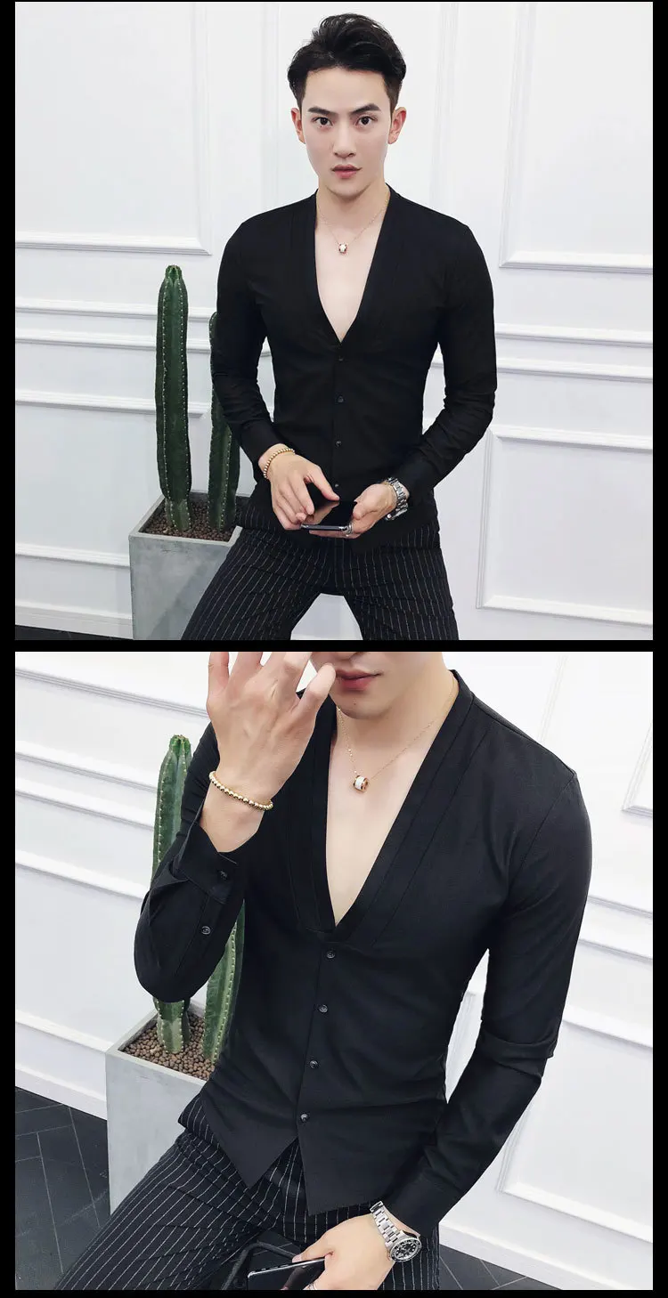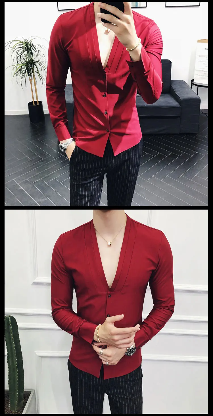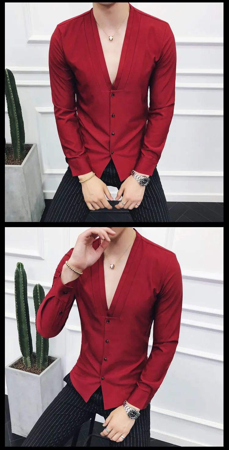 Men Sexys Deep V Collarless Shirt 2020 Mens Long Sleeve Slim Fit V Neck Pleating Solid Dress Mens Shirts