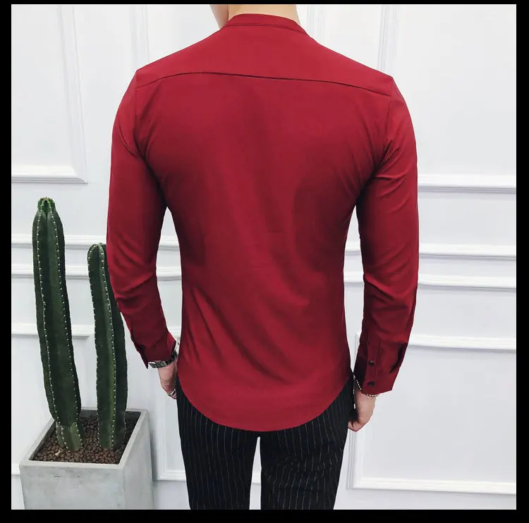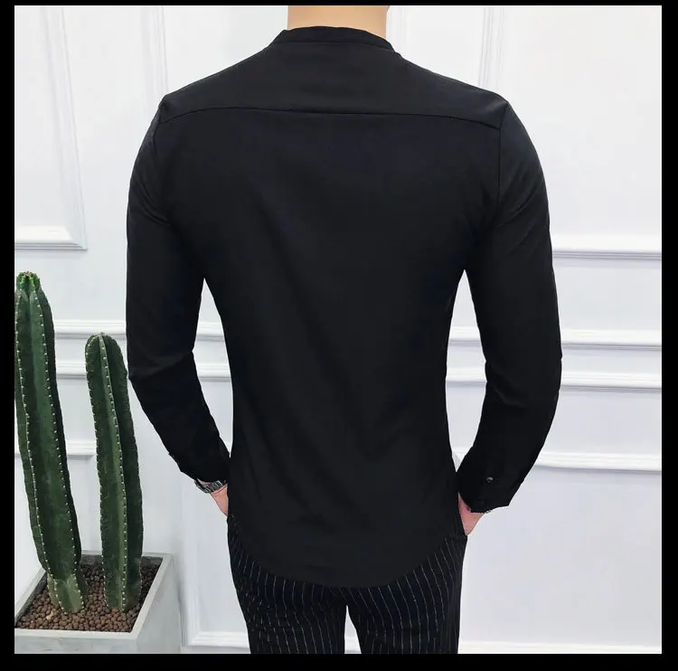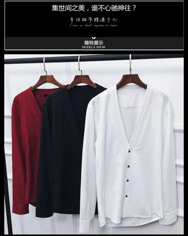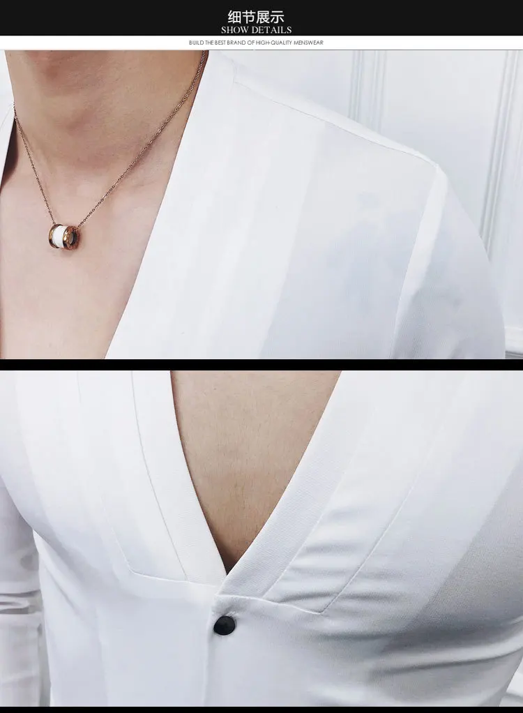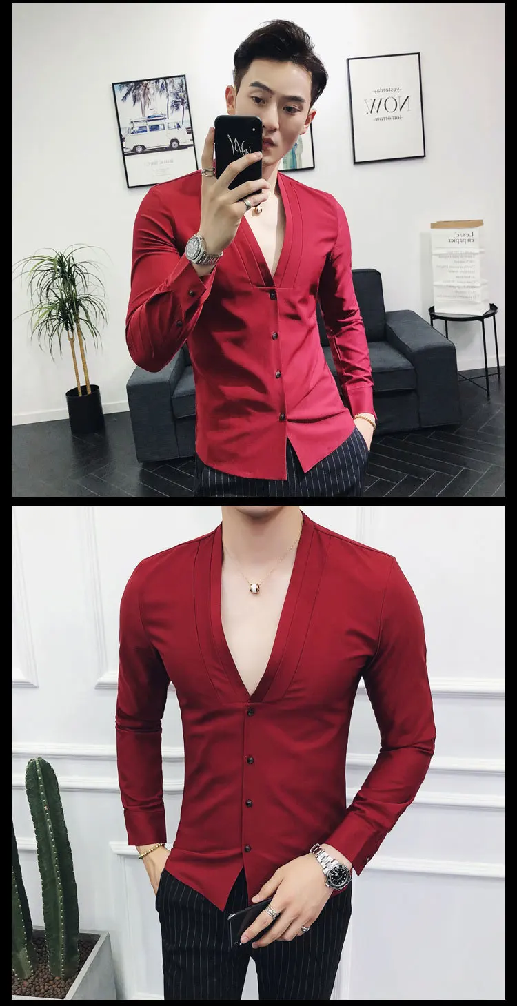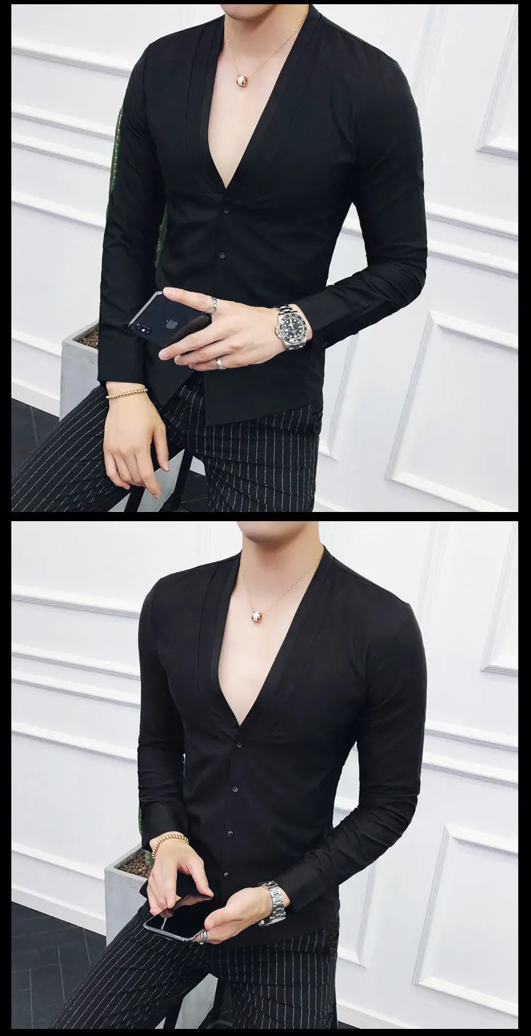 Men Sexys Deep V Collarless Shirt 2020 Mens Long Sleeve Slim Fit V Neck Pleating Solid Dress Mens Shirts