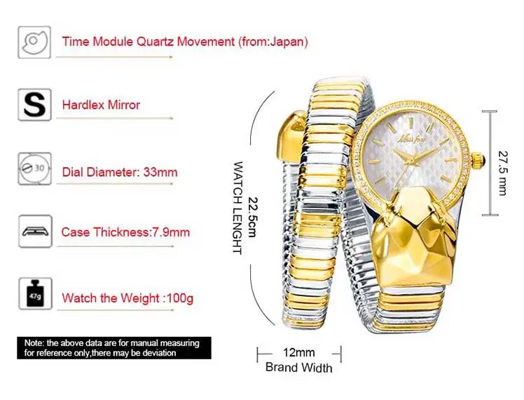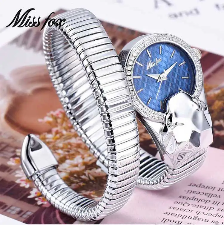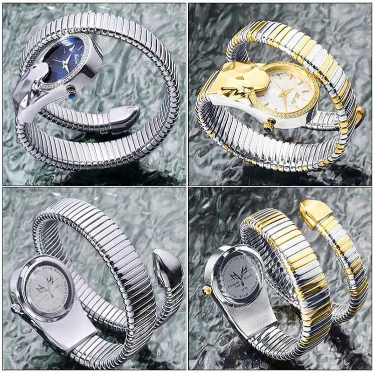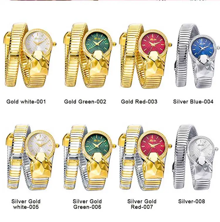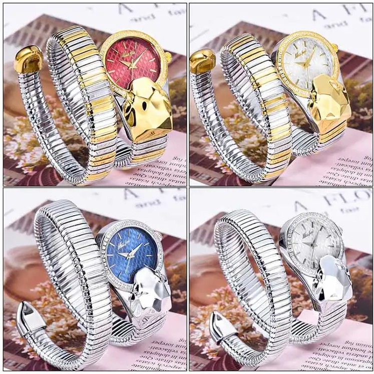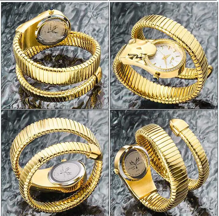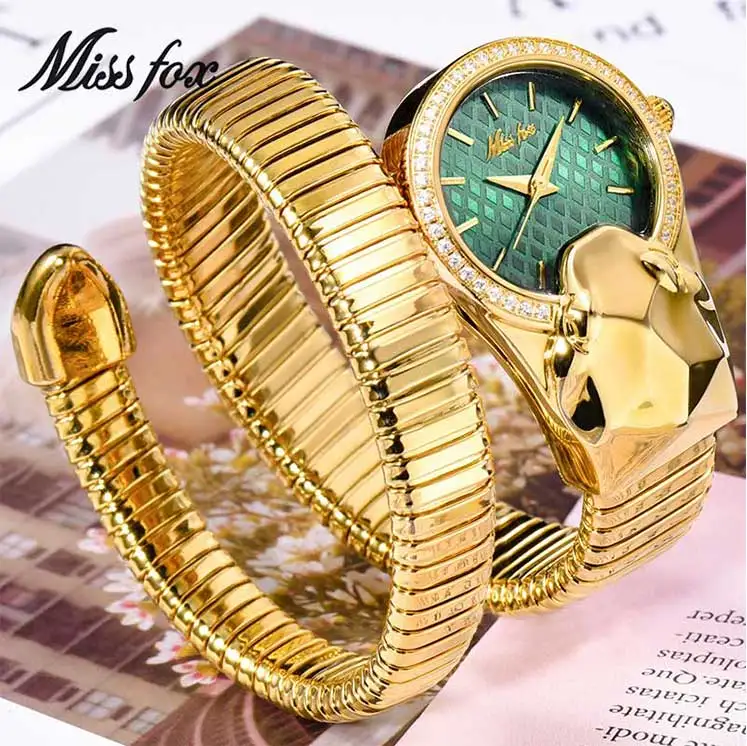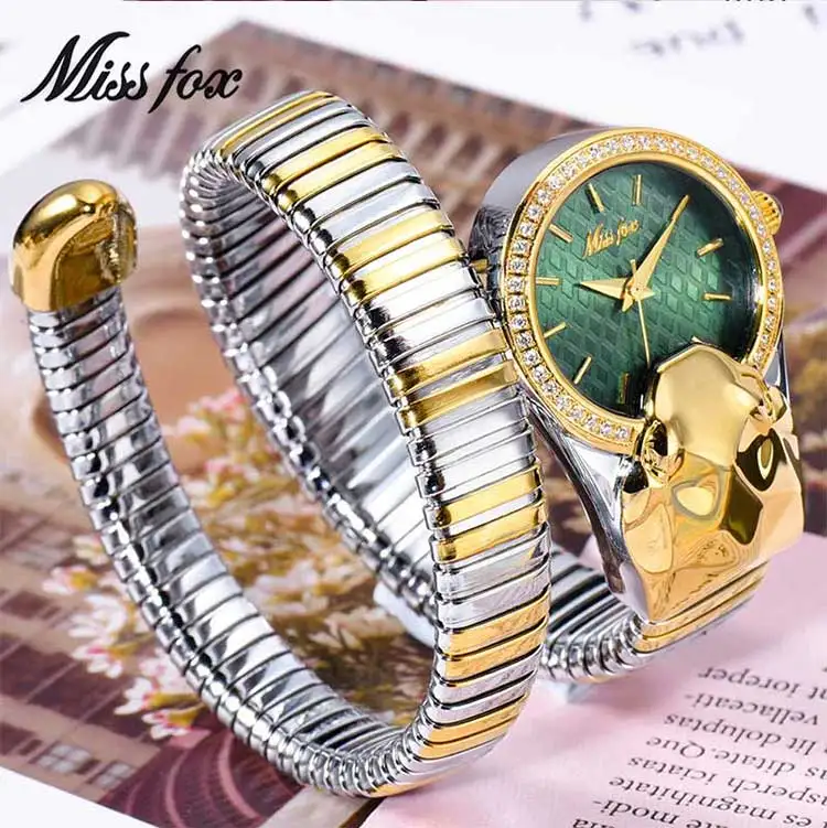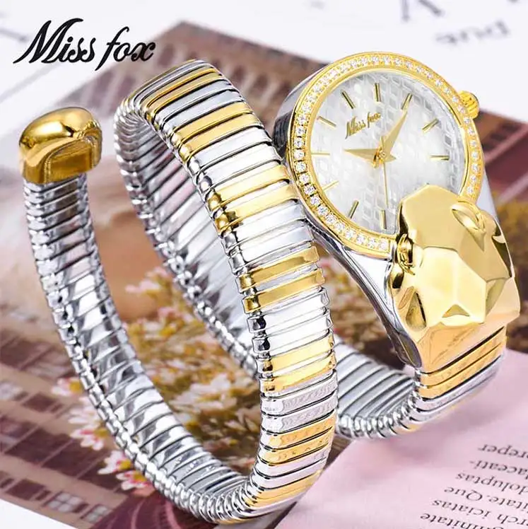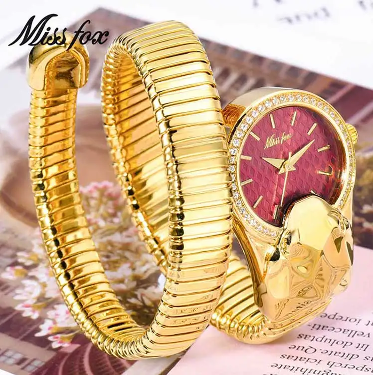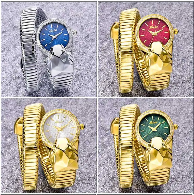 MISS FOX Gold Snake Shape Quartz Wristwatch Clock Round dial Watch Multiple Colour Automatic shrink strap