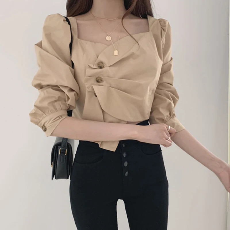 Neploe Chic High Waist Slim Fit Short Blouse Pleated Irregular Solid Blusas Mujer Sexy Exposed Collarbone Shirt