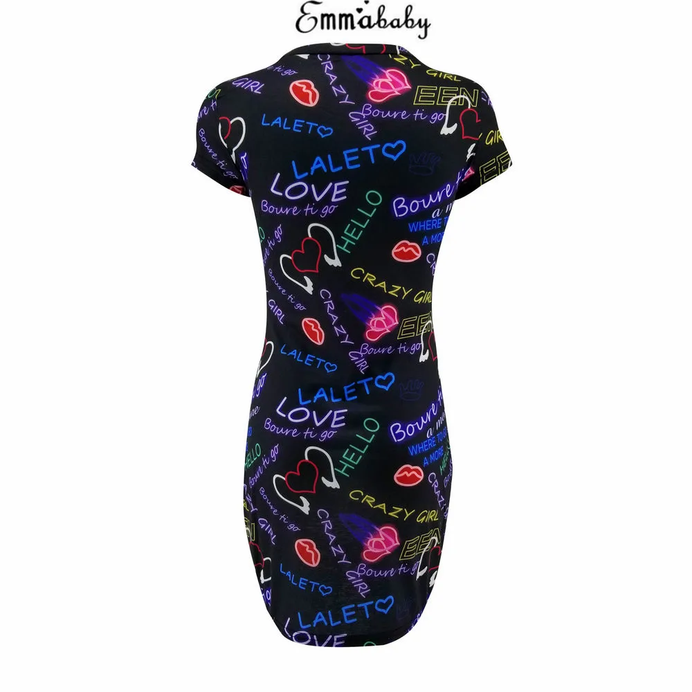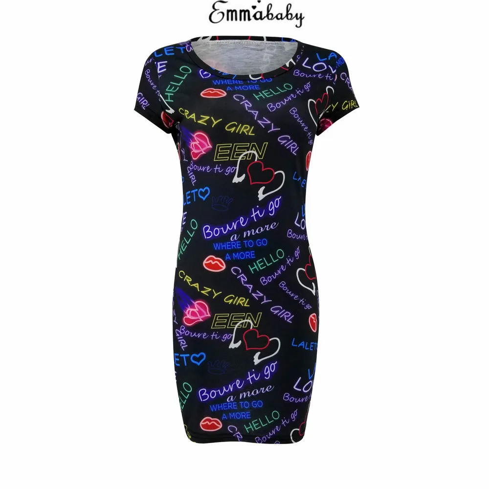 New Fashion Women Ladies Bodycon Short Sleeve O neck Letter Printed Party Club Summer Short Mini Dress