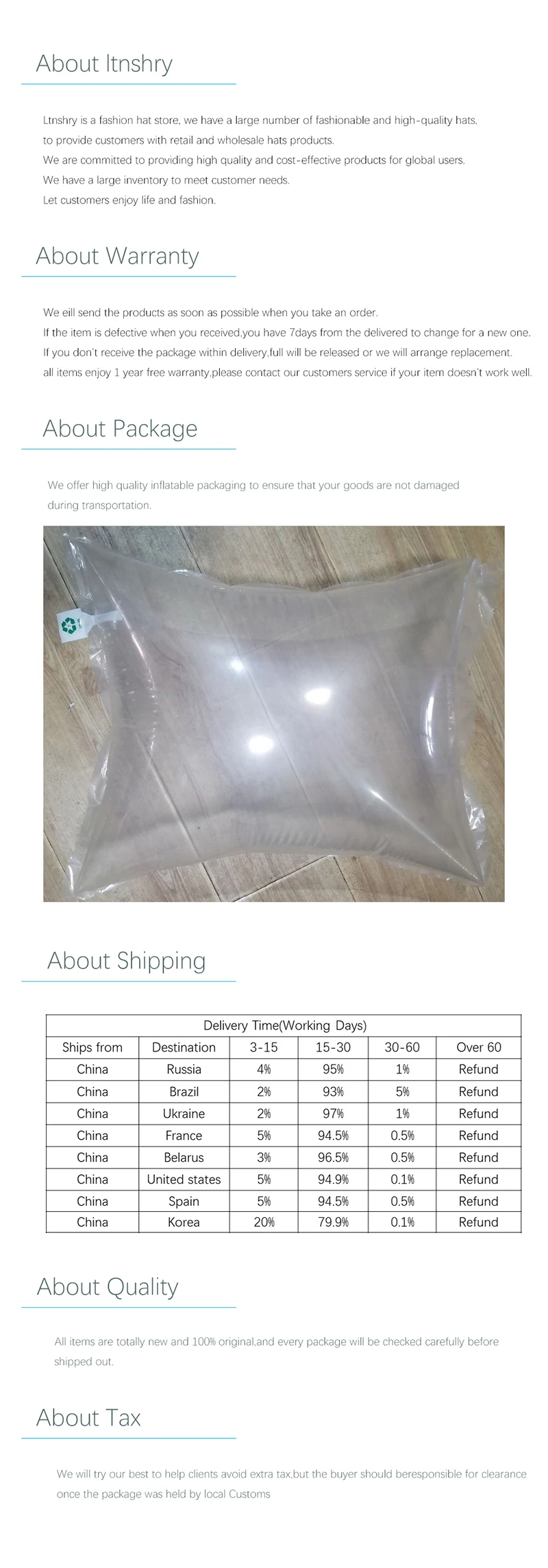 Hello, dear friends, welcome to our shop, we are a professional hat shop, our main purpose is to provide customers with cost-effective hats, so that customers can buy their favorite hats at the best price, we are transporting inflatable packaging will Provided to guests during this process. If there is a leak in the transportation, you can contact our customer service, we will refund all the money or re-delivery for you. It is worth noting that there is no tracking information in our transportation mode (China Post Ordinary Small Package). If you need to check the shipping location of the goods, we recommend that you choose (AliExpress Standard Shipping) (China Post Registered Air Mail) (ePacket). If you have any other questions, you can contact our customer service and wish you a happy day!
