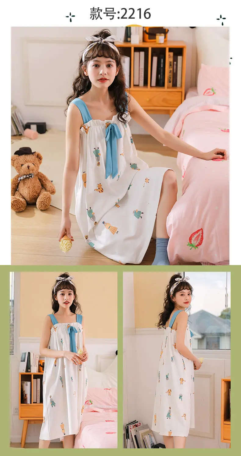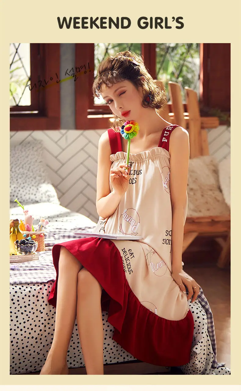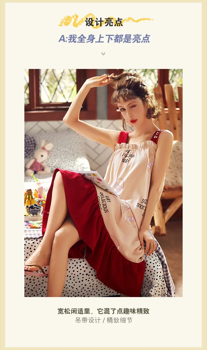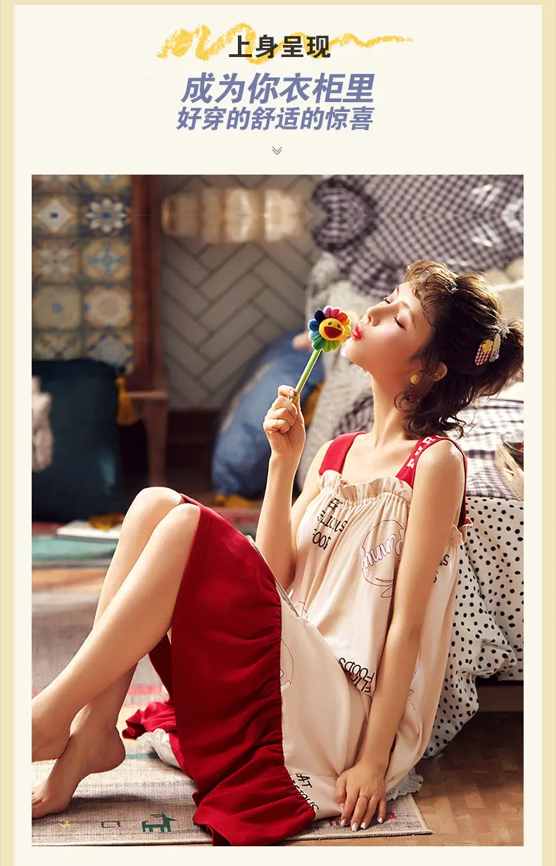 Nightgowns Women Strappy Ruffles Printed Sleeveless Sleep-shirts Baggy Soft Comfortable Lovely Girls Trendy Leisure Nightwear