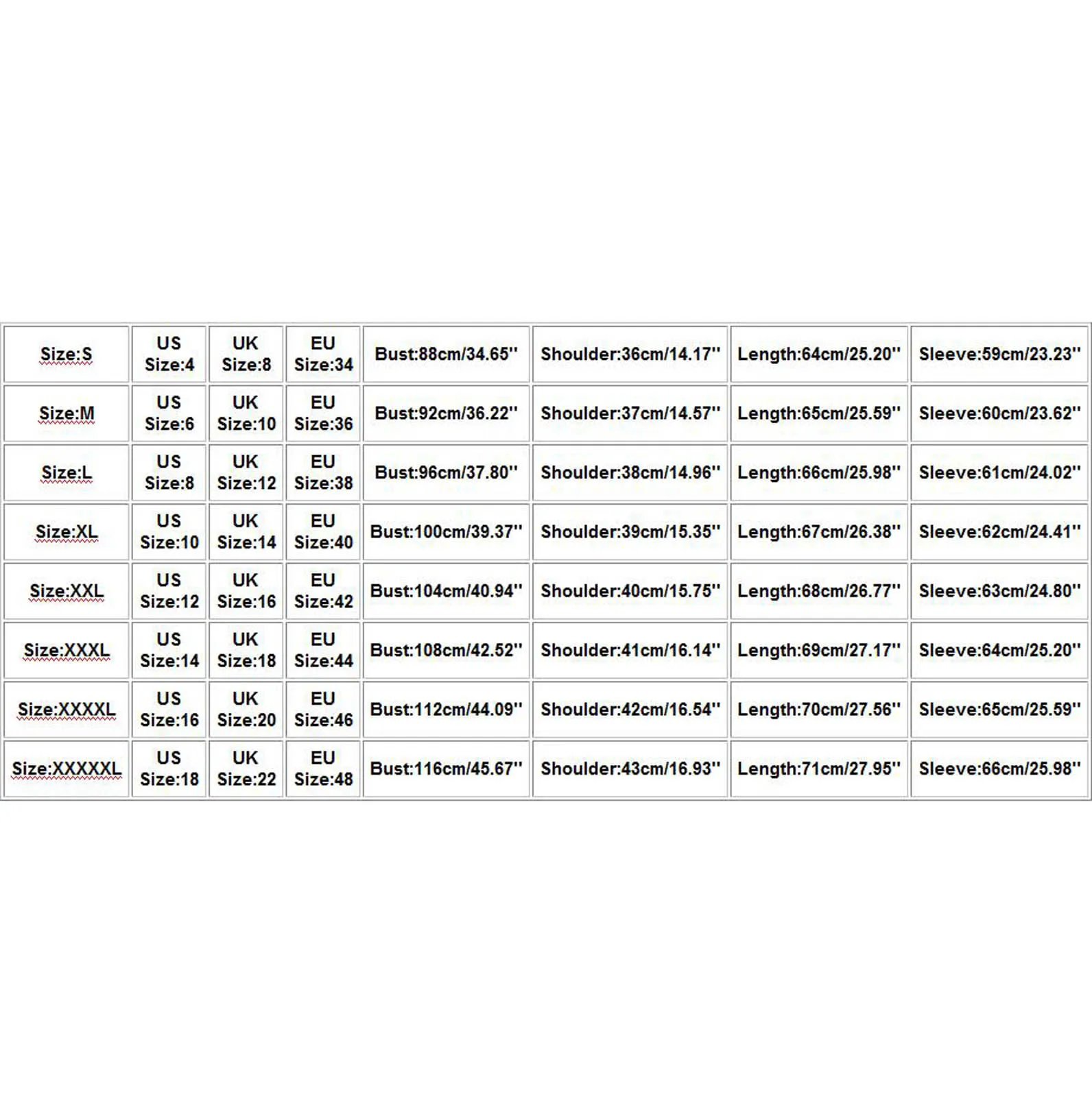 | Size | US Size | UK Size | EU Size | Bust | Shoulder | Length | Sleeve |