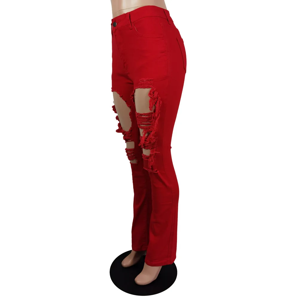 Red/yellow Big Hole Hollow Plus Size Jean Women High Waist Side Tassel Patchwork Flare Pant Streetwear Bell Bottom Denim Capris