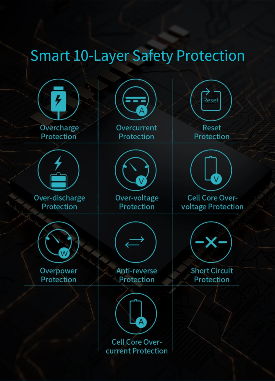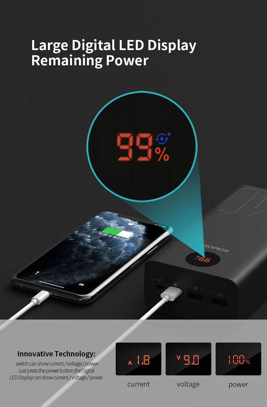 This portable power bank has a full-view LED display, it presents available battery percentage exactly and it can show the current and voltage as well.