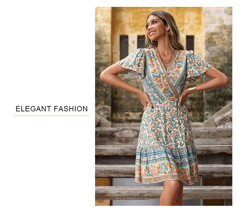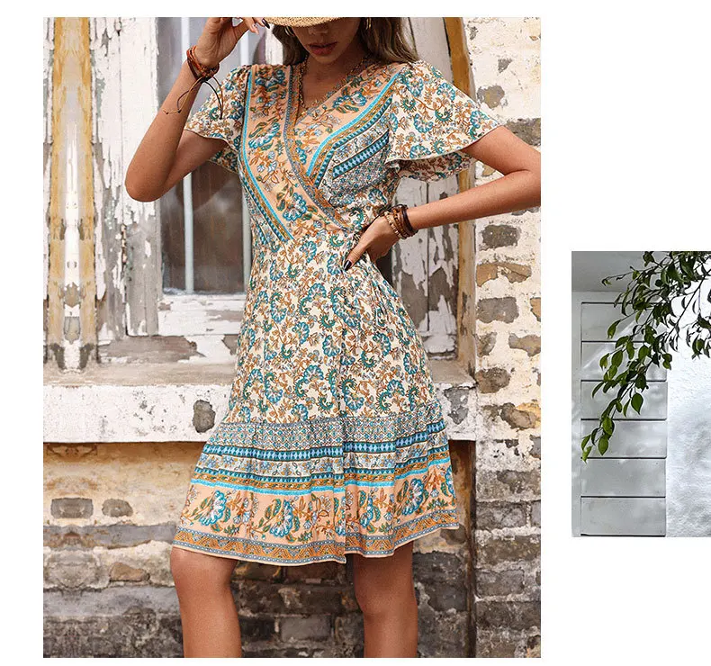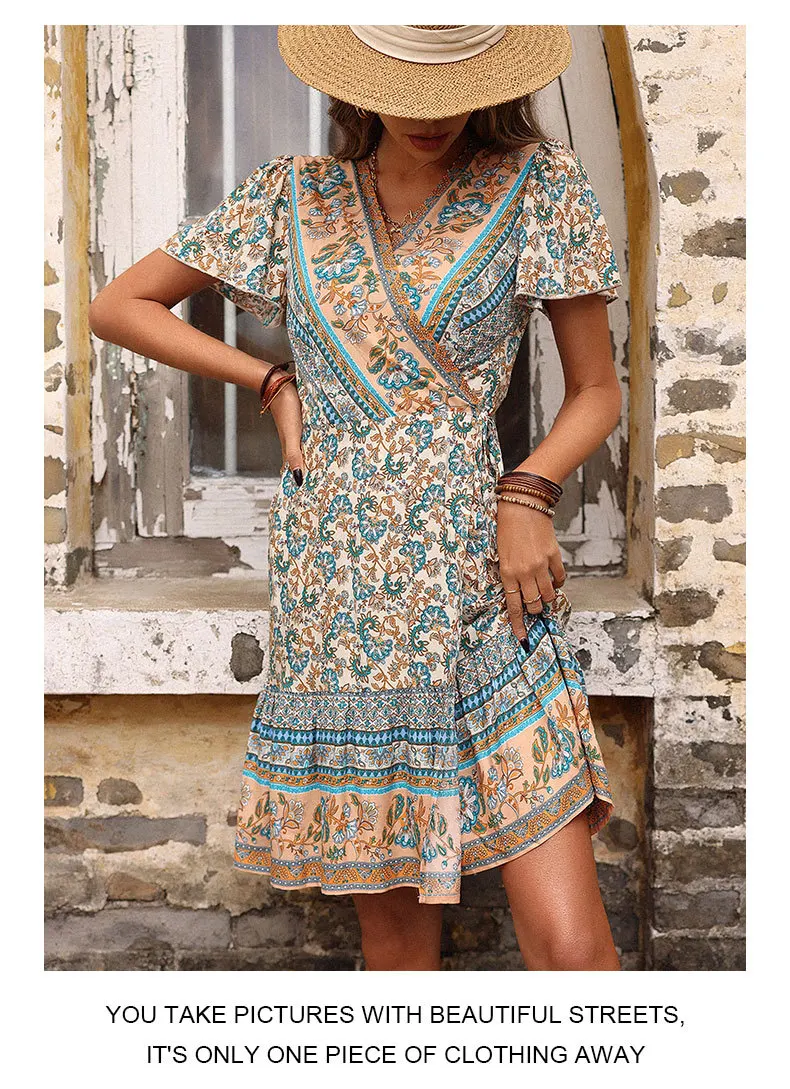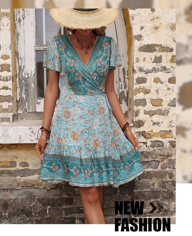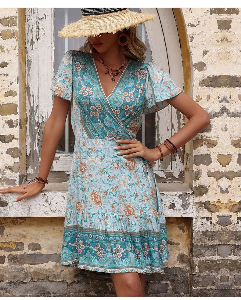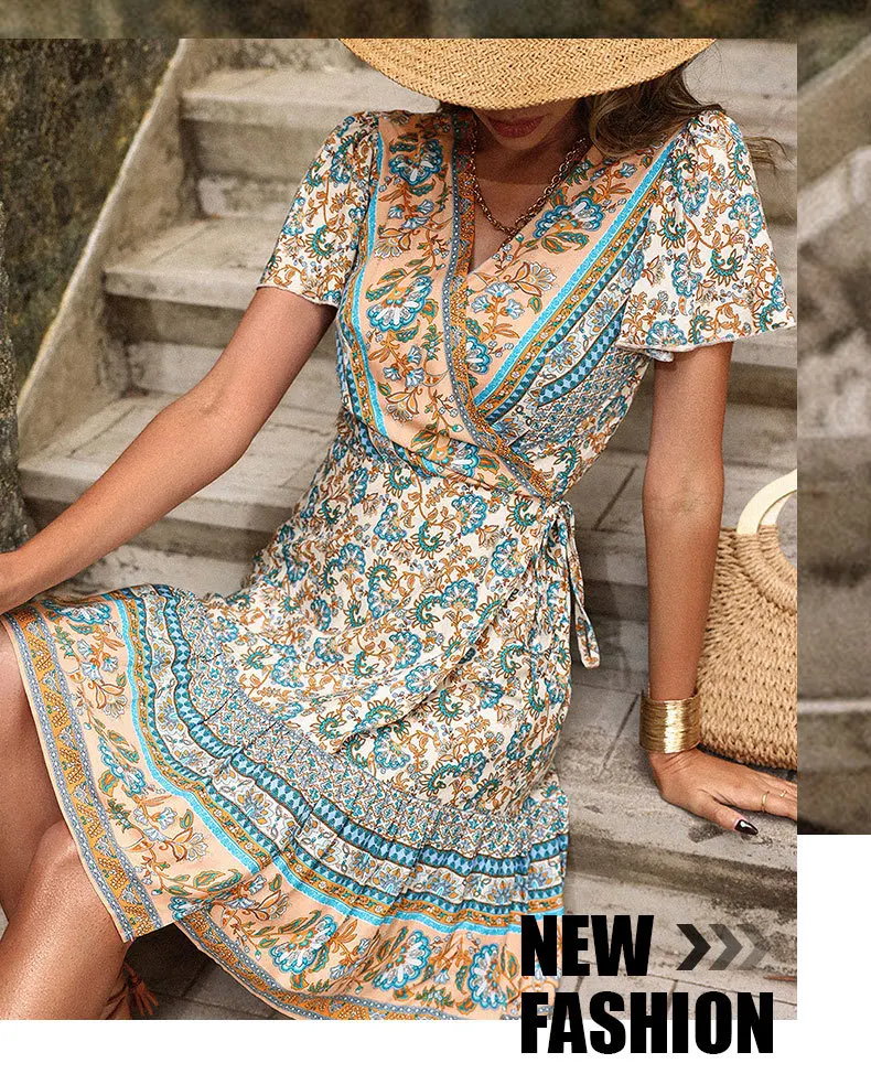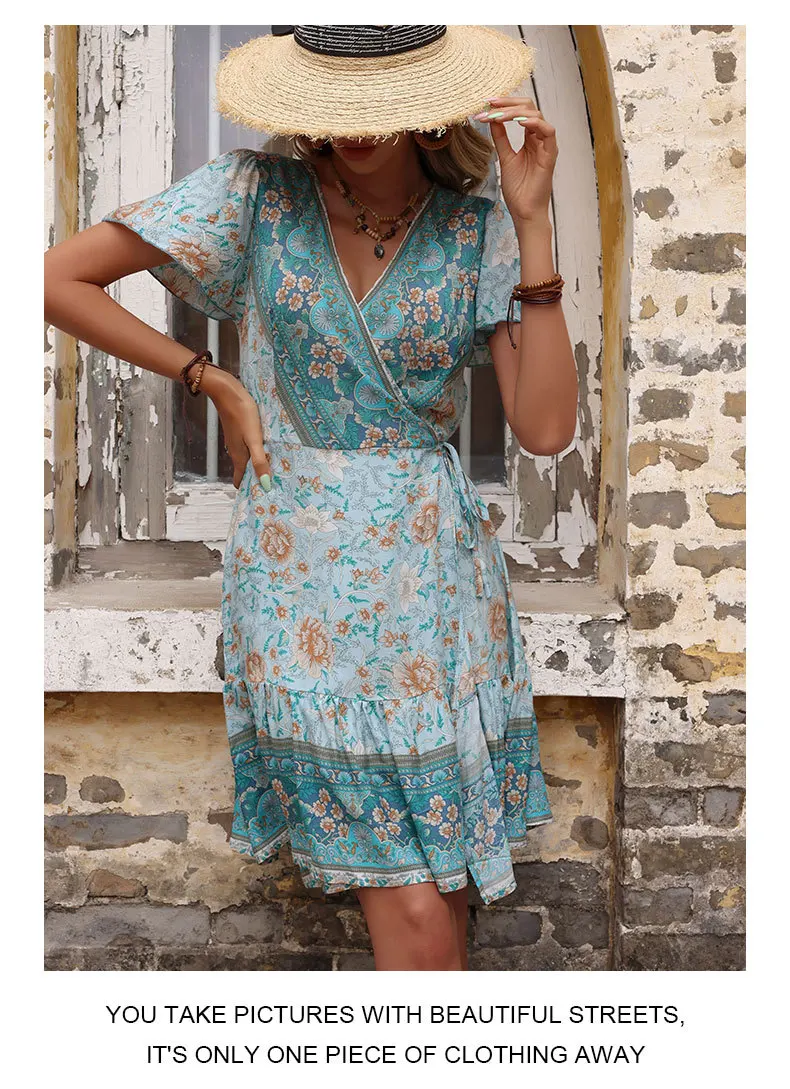 Short Wrap Dress for Women Elegant Floral Midi Vacation Party Ladies Dresses Wholesale Dropshipping Beach Outfits