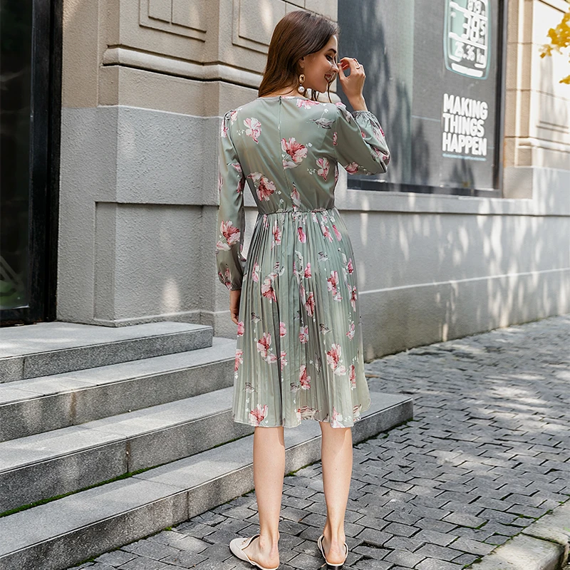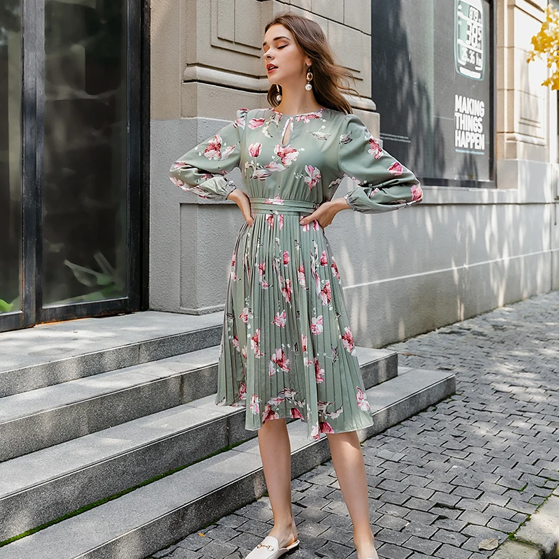 Simplee Elegant floral print long dress women round neck long sleeve ruffled holiday dress middle waist autumn winter dresses