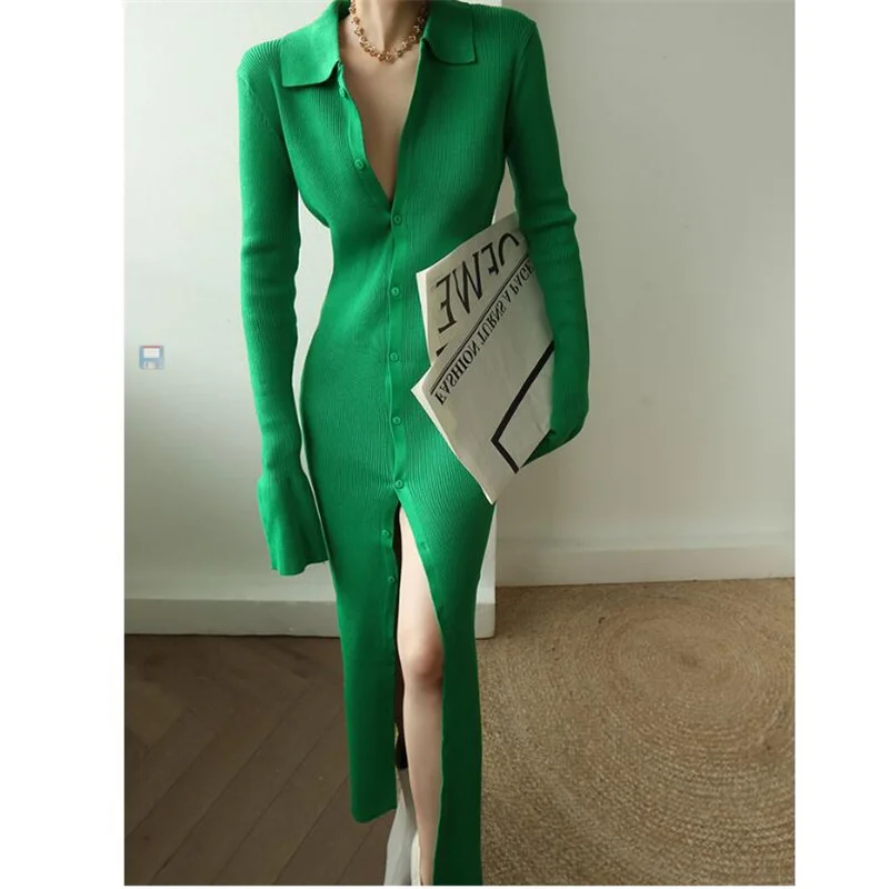 Spring and Summer Cheongsam Style Loose Knitting Dress Women V-neck Striped Ribbed Dresses Vestidos De Mujer Casual
