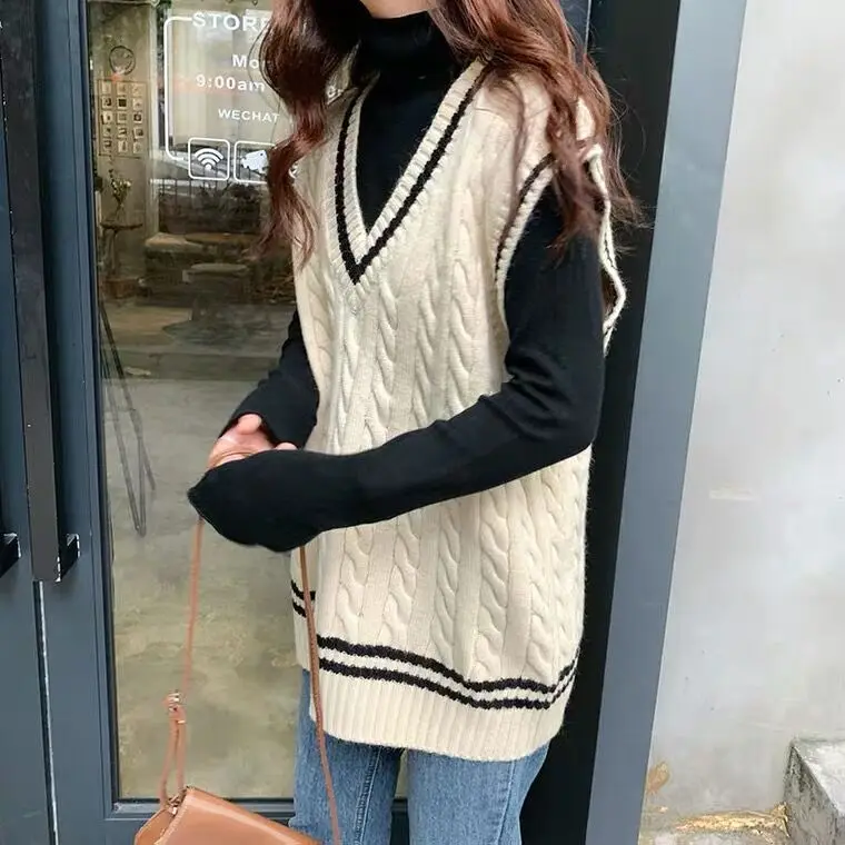 Spring Autumn Women's Preppy Style V-neck Knitted Sleeveless Vest Coat Sweet Women Pullovers Striped Hemp Flowers Waistcoat Cozy
