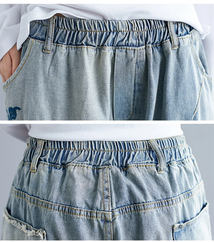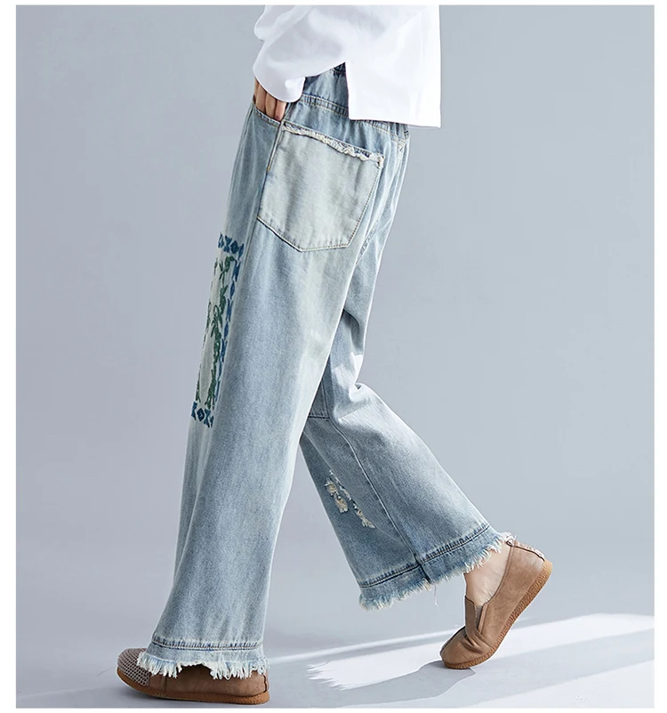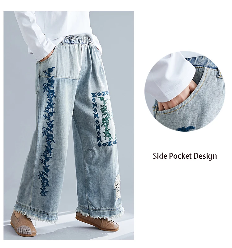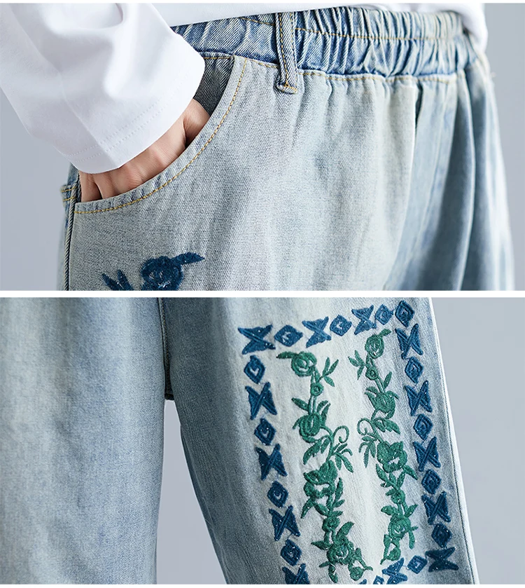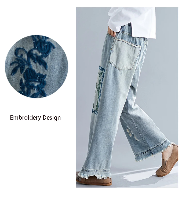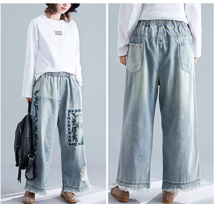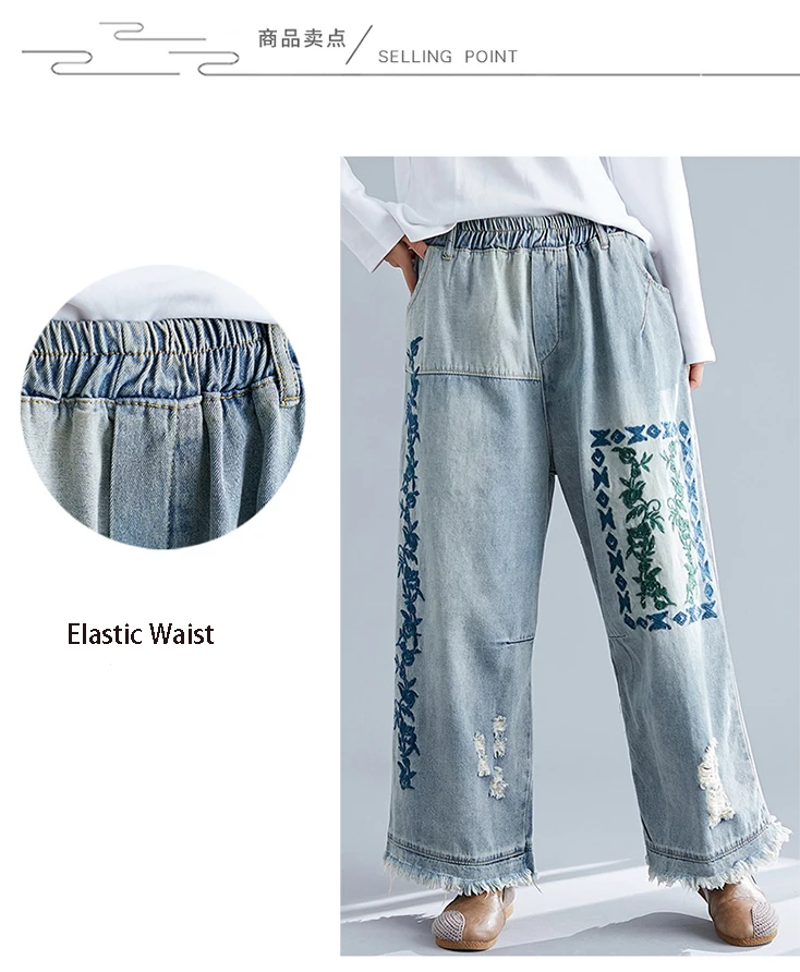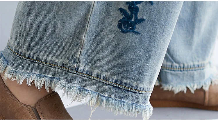 Spring Ripped Jeans Women Elastic High Waist Denim Cropped Pants Straight Wide Leg Pants Female Vintage Embroidery Jean Trousers