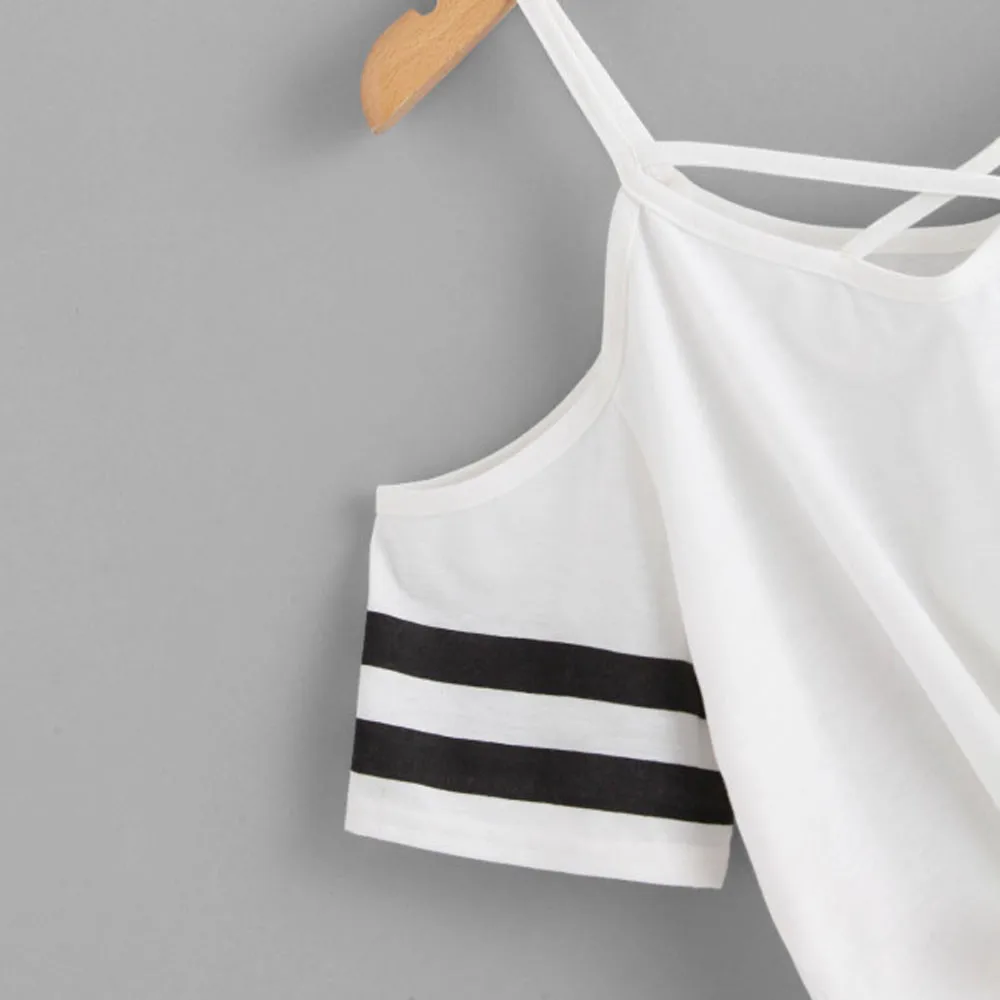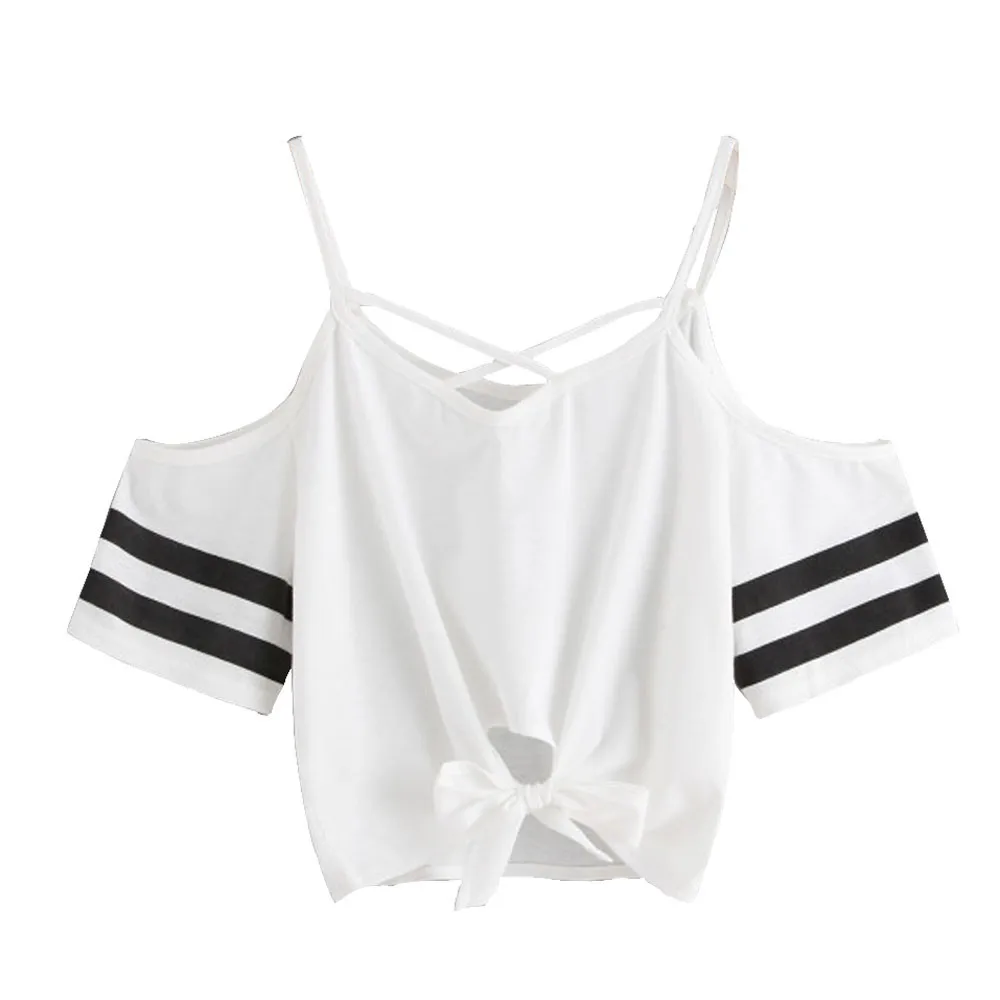 Streetwear Short Sleeve Crop Top Women T Shirt Sexy Off Shoulder Striped Patchwork T-shirt Hollow Out Tee Shirts Mujer Camisetas