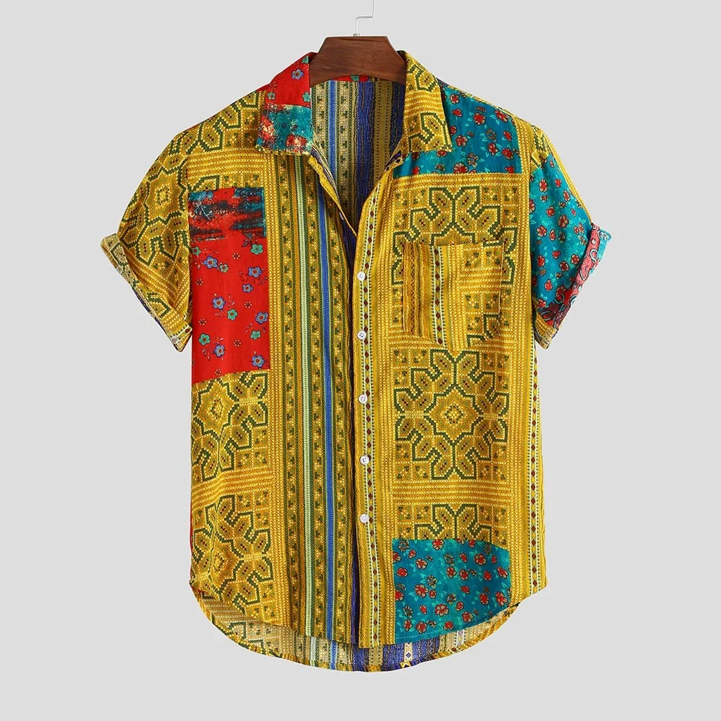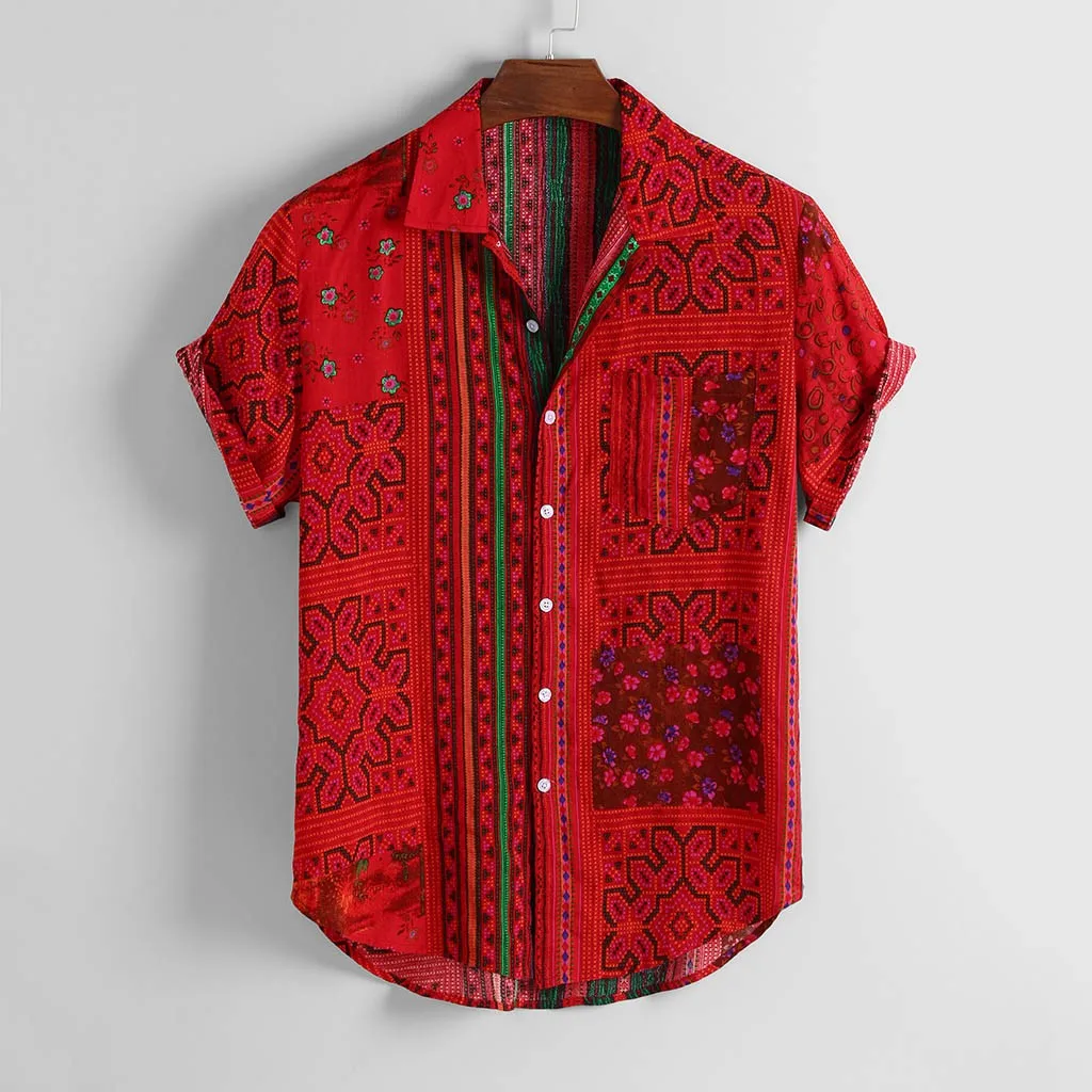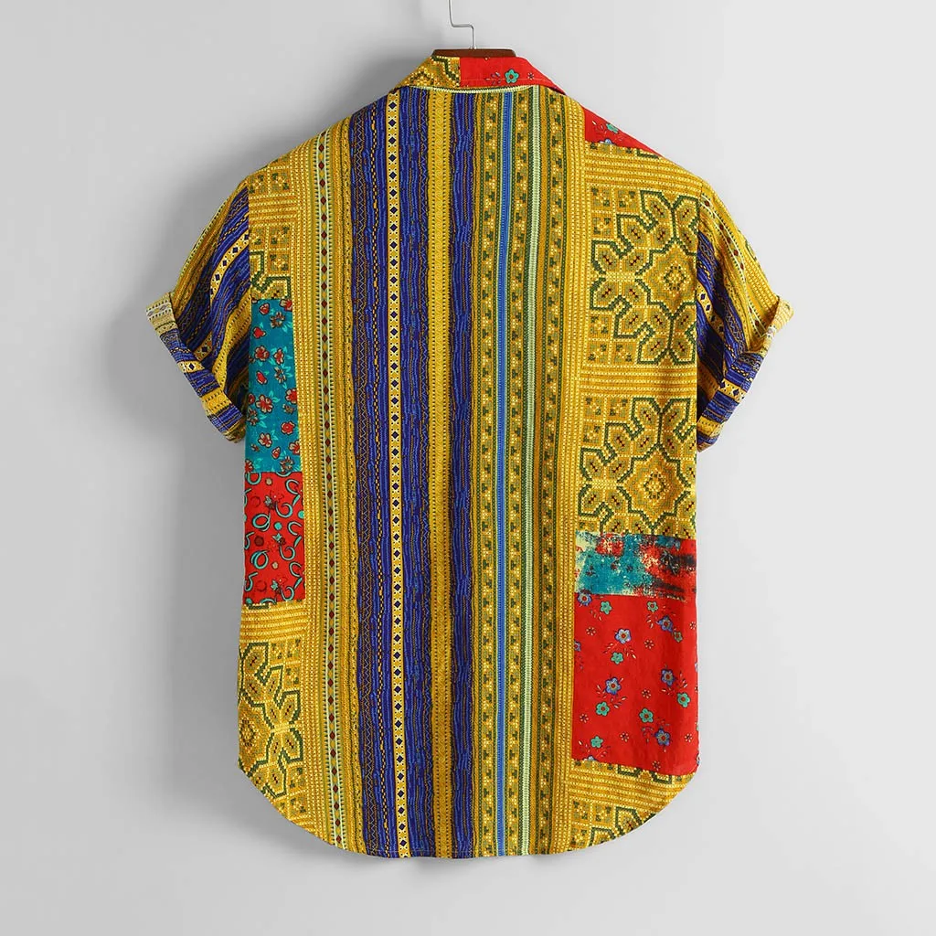 Mens Vintage Ethnic Printed Turn Down Collar Short Sleeve Loose Casual Shirts
