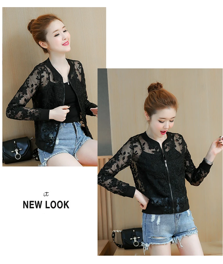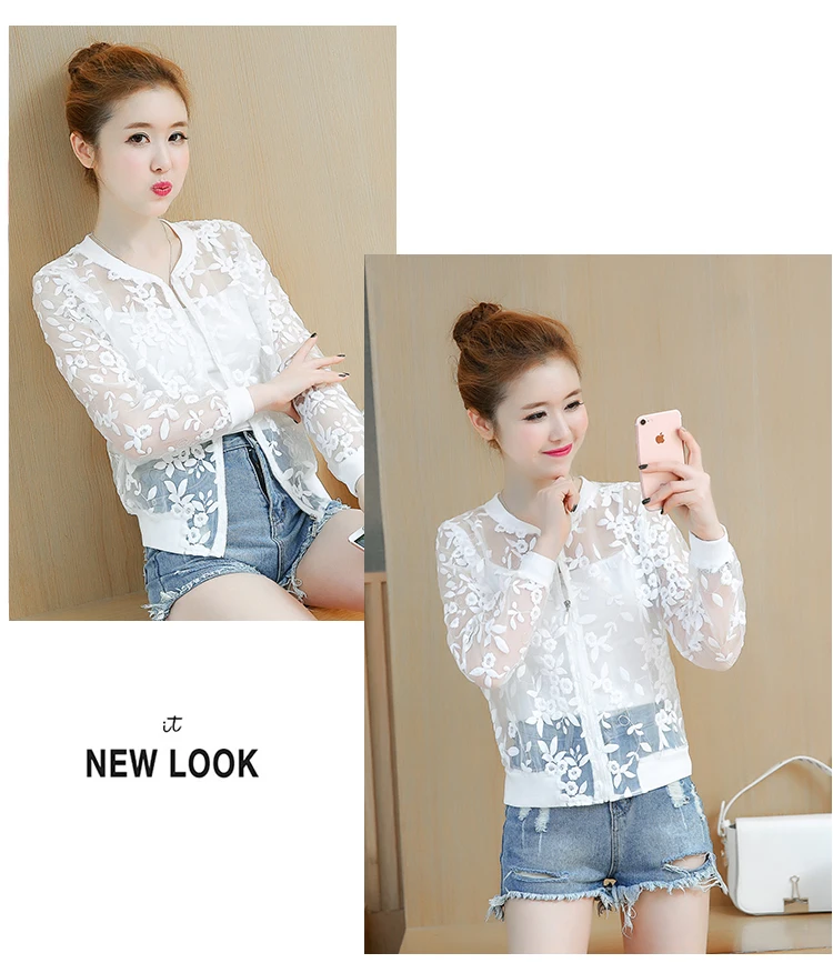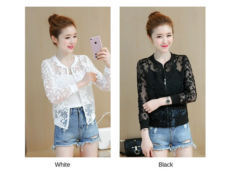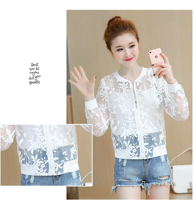 Summer White Lace Thin Baseball Jacket Women Casual Long-sleeve Transparent Bomber Tops Breathable Sunscreen Cardigan Loose Coat