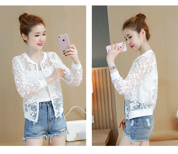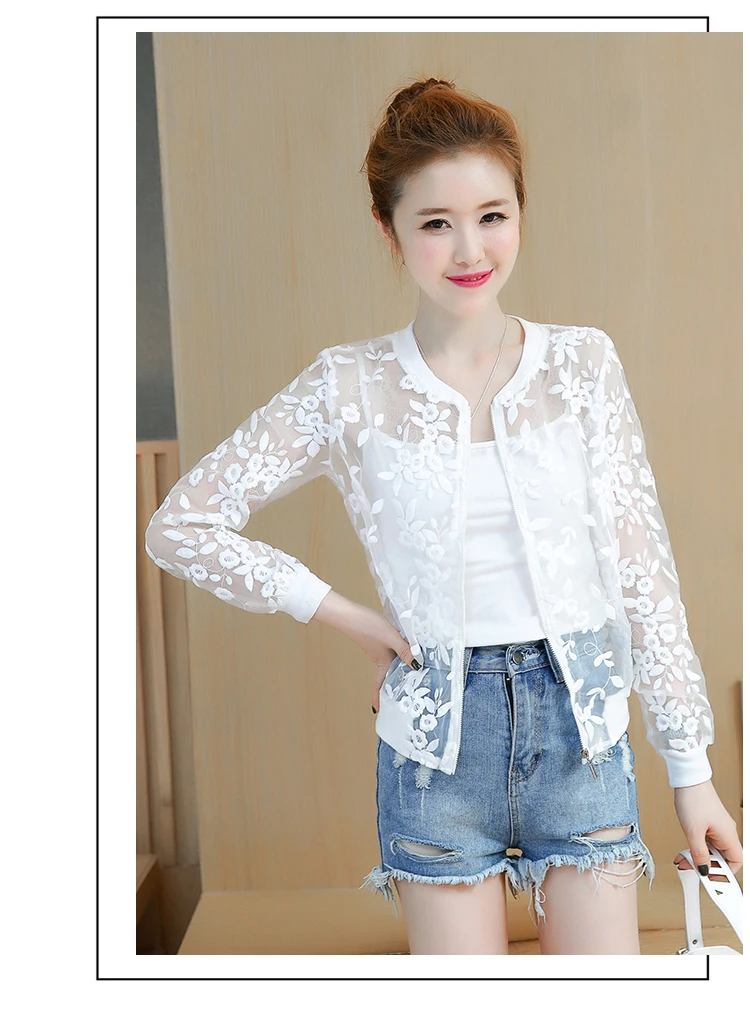 DROWYD 2020 Summer New Arrival Summer White Lace Thin Baseball Jacket Women Casual Long-sleeve Transparent Bomber Tops Breathable Sunscreen Cardigan Loose Coat