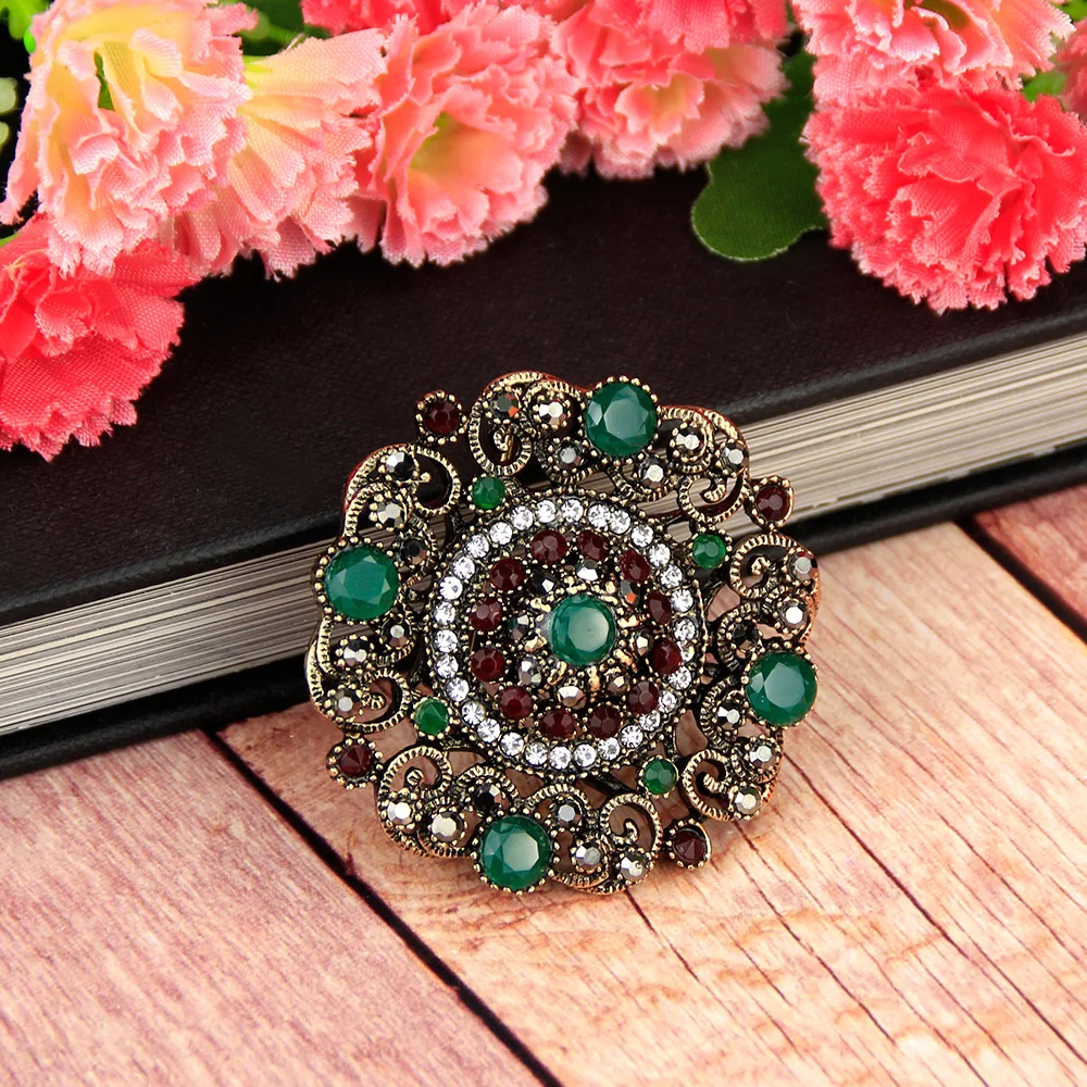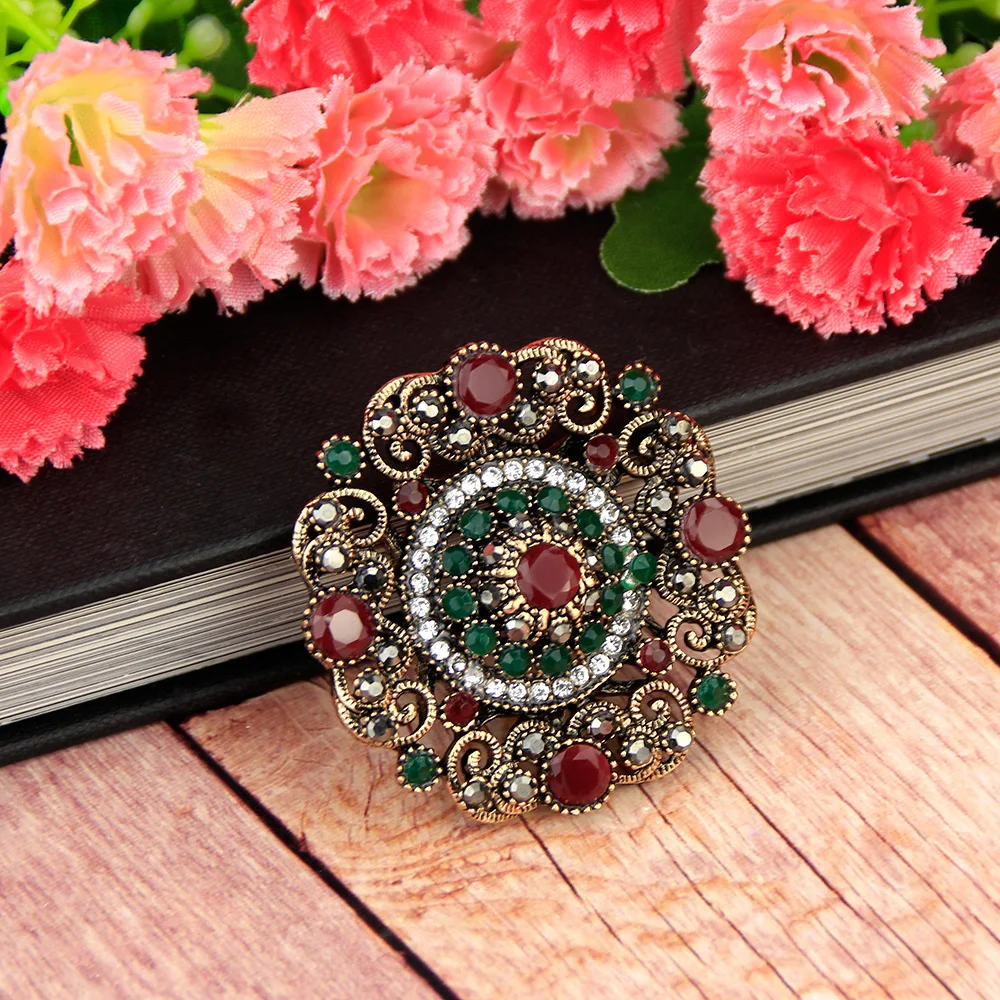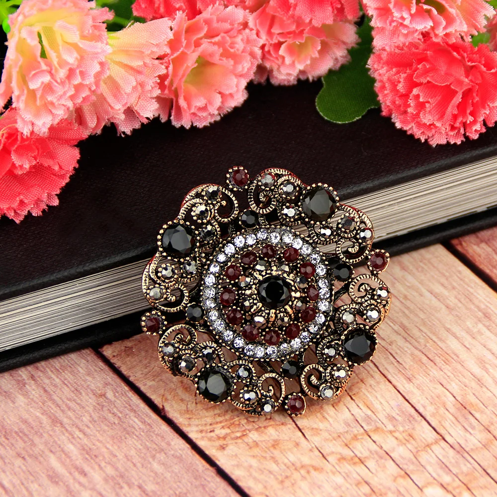 Turkish Brooch Pin For Women Antique Gold Color Vintage Round Resin Flower Arabesque Rhinestone Lapel Scarf Jewelry Gift