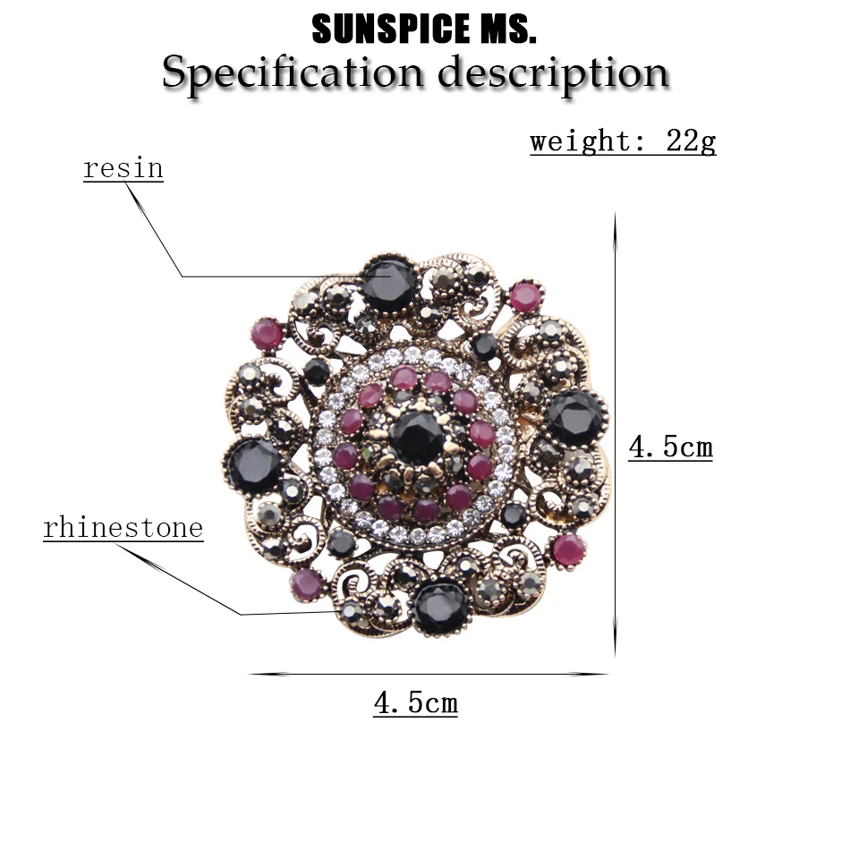 “Product Description: 2020 Turkish Brooch Pin For Women Antique Gold Color Vintage Round Resin Flower Arabesque Rhinestone Lapel Scarf Jewelry Gift”