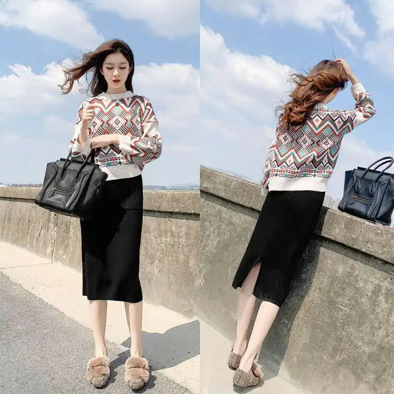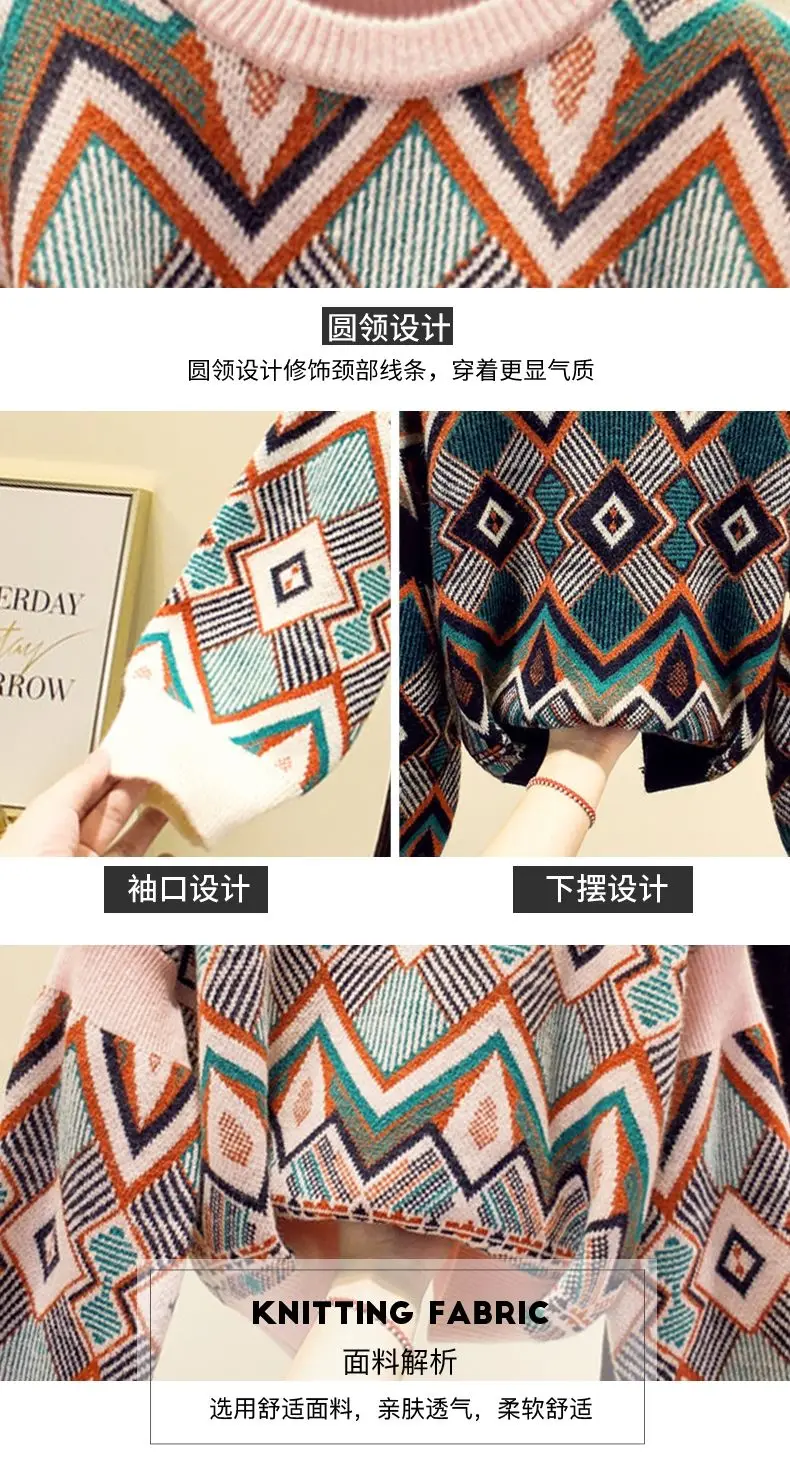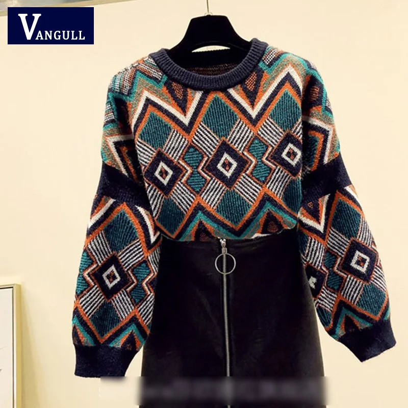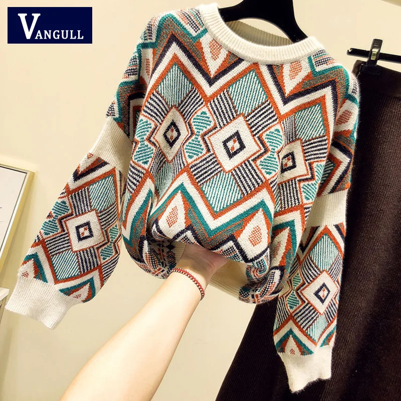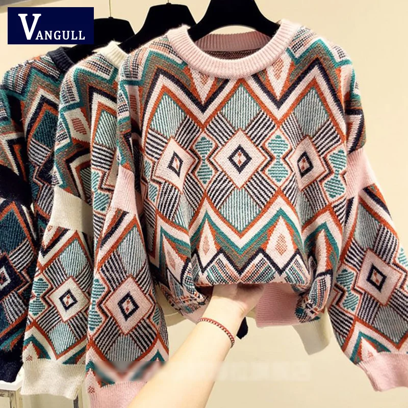 VANGULL high quality Sweater Spring Autumn Loose Knitted Sweater Geometric Embroidery Pullover Women O-Neck Sweater female Tops