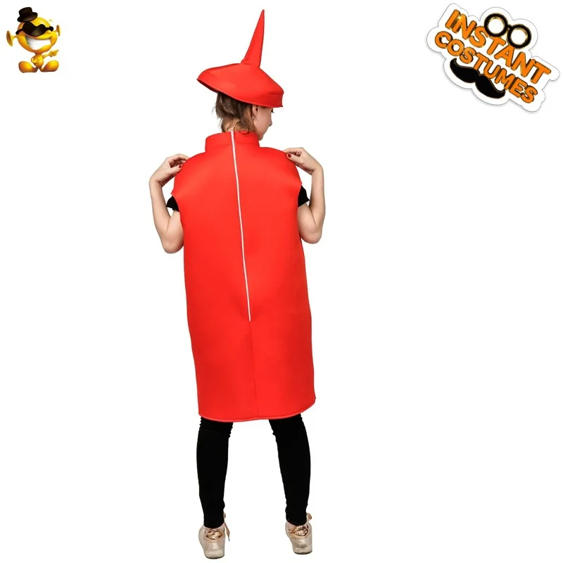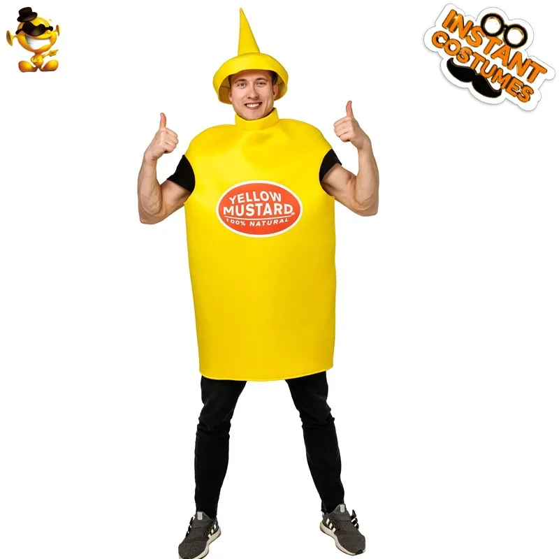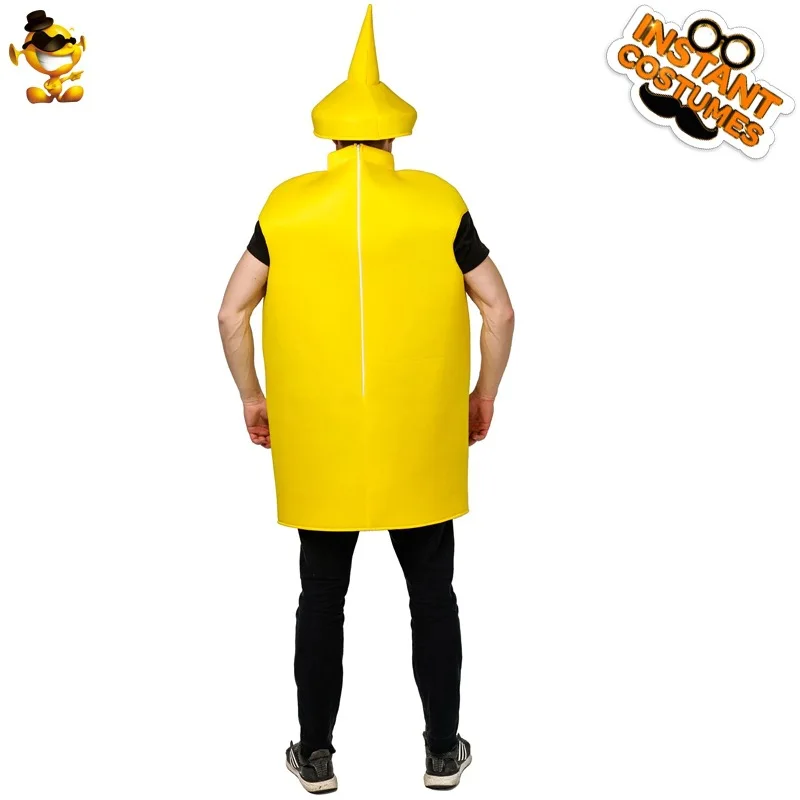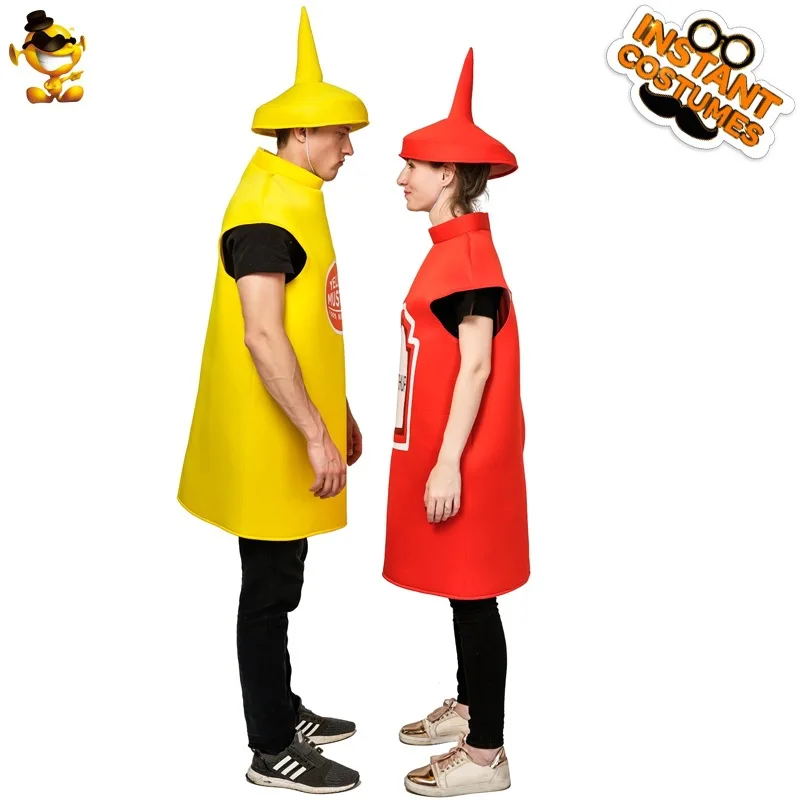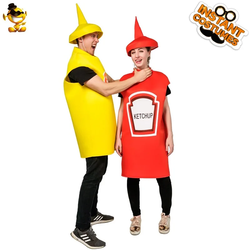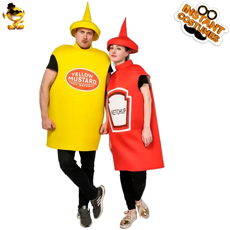 VIP FASHION Unisex Cosplay Costume Halloween Adult Couple Mustard Ketchup Jumpsuit with Cap Women Men Party Funny Food Outfit
