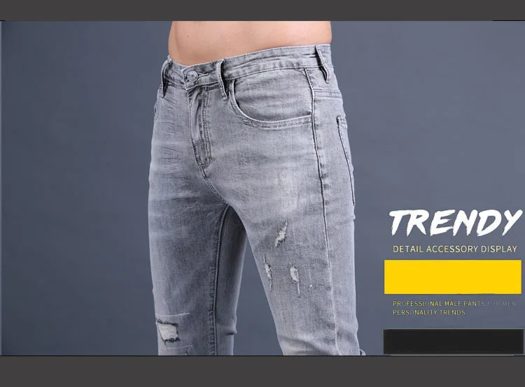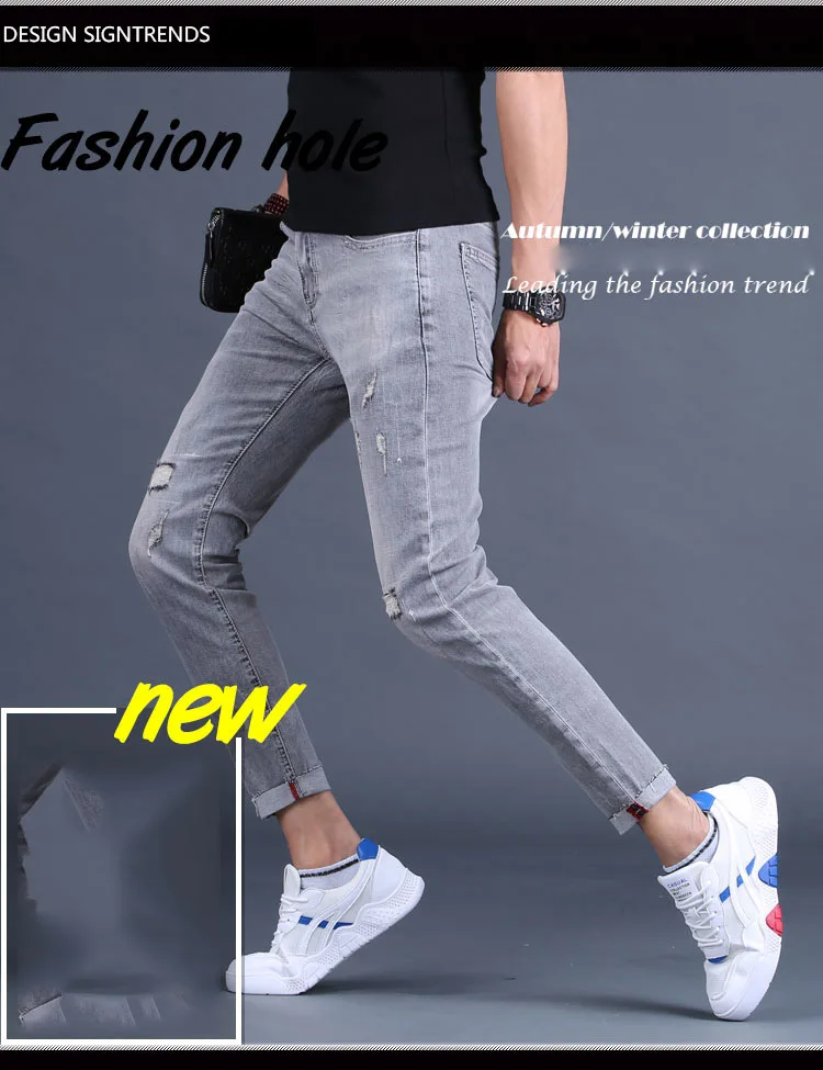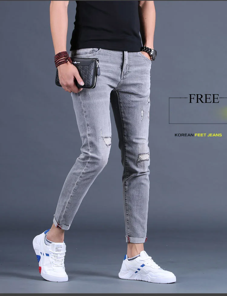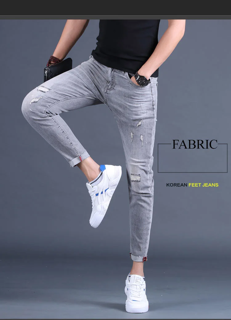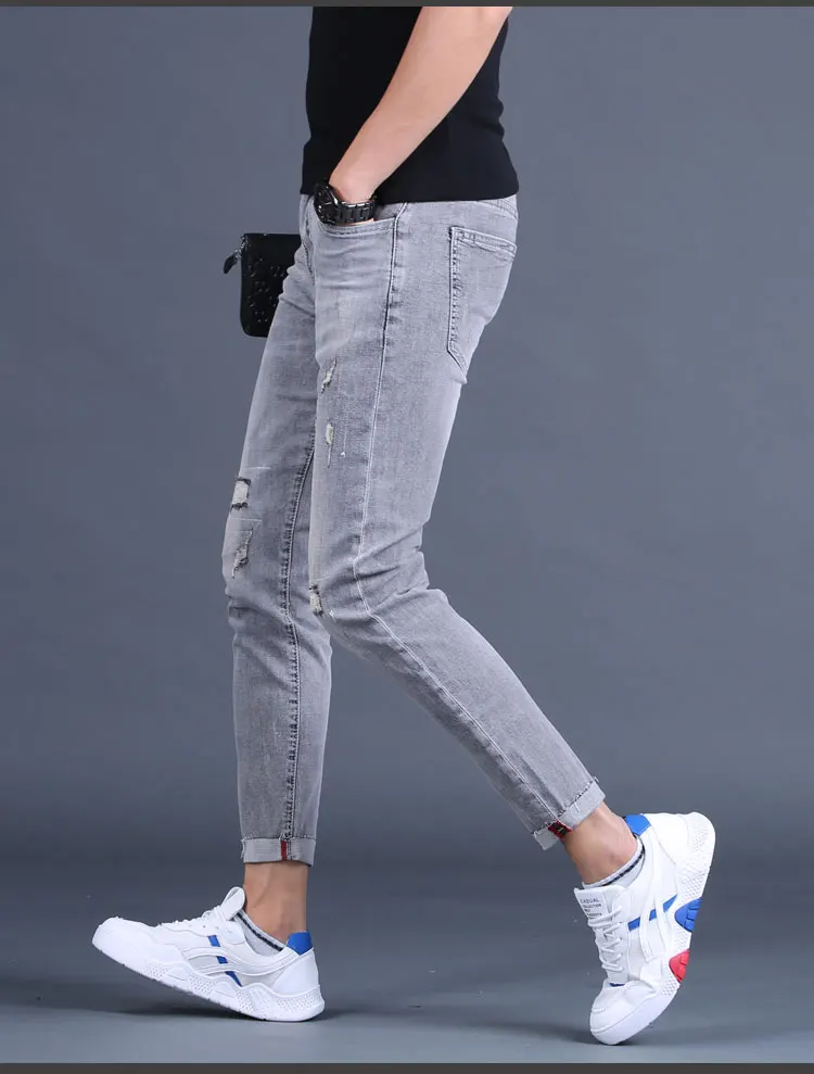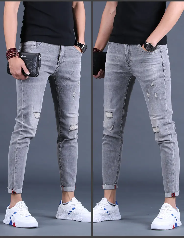 Wholesale 2020 Washing Smoke gray jeans men's ankle length pants brand Slim feet summer ripped holes Korean casual pencil pants