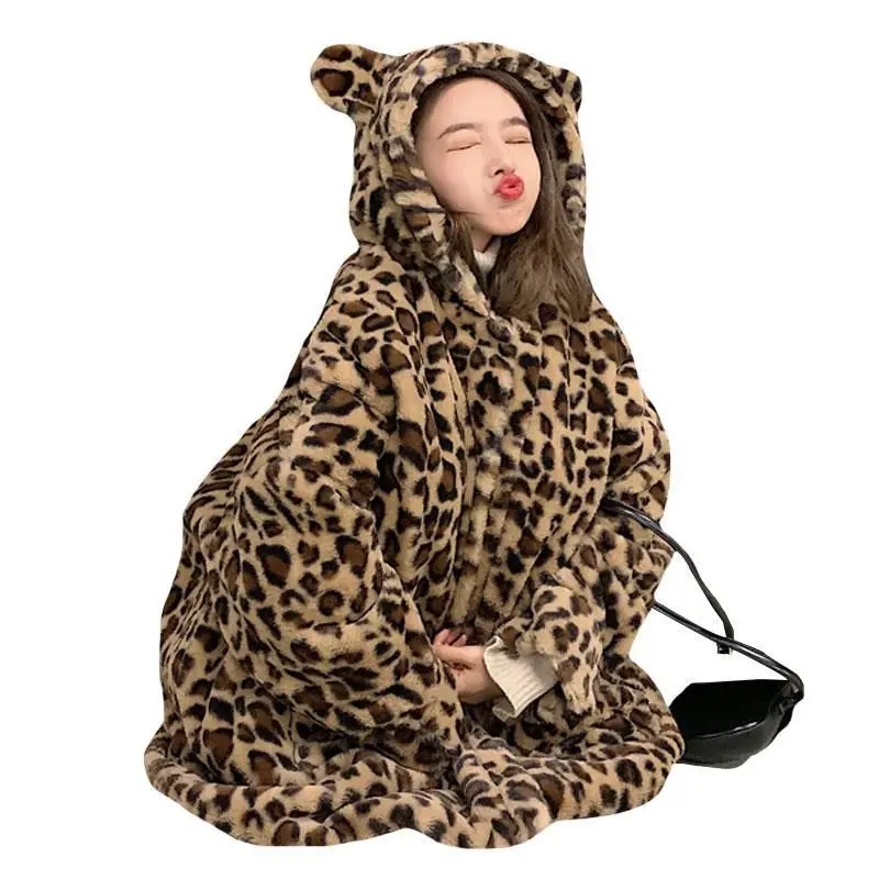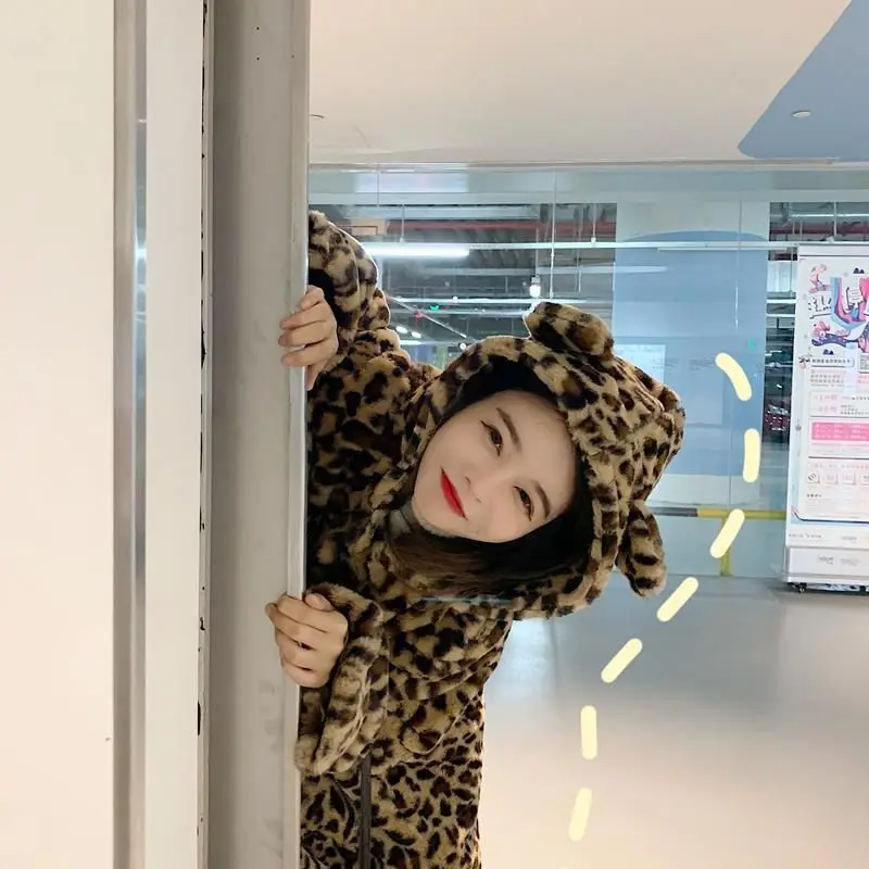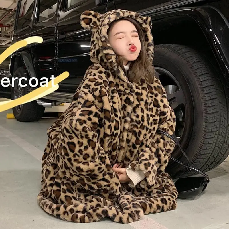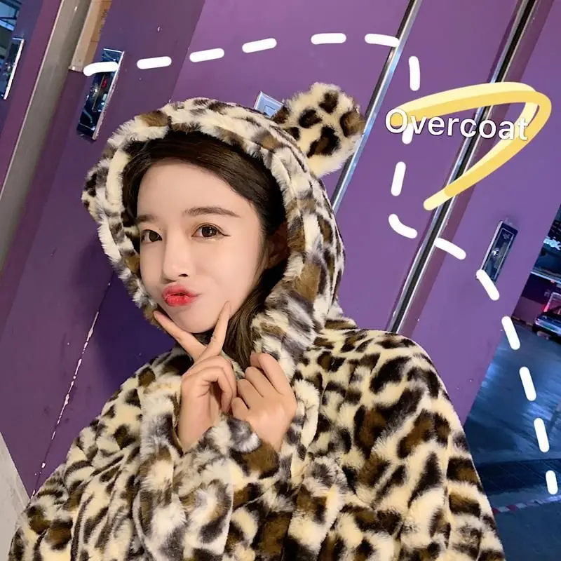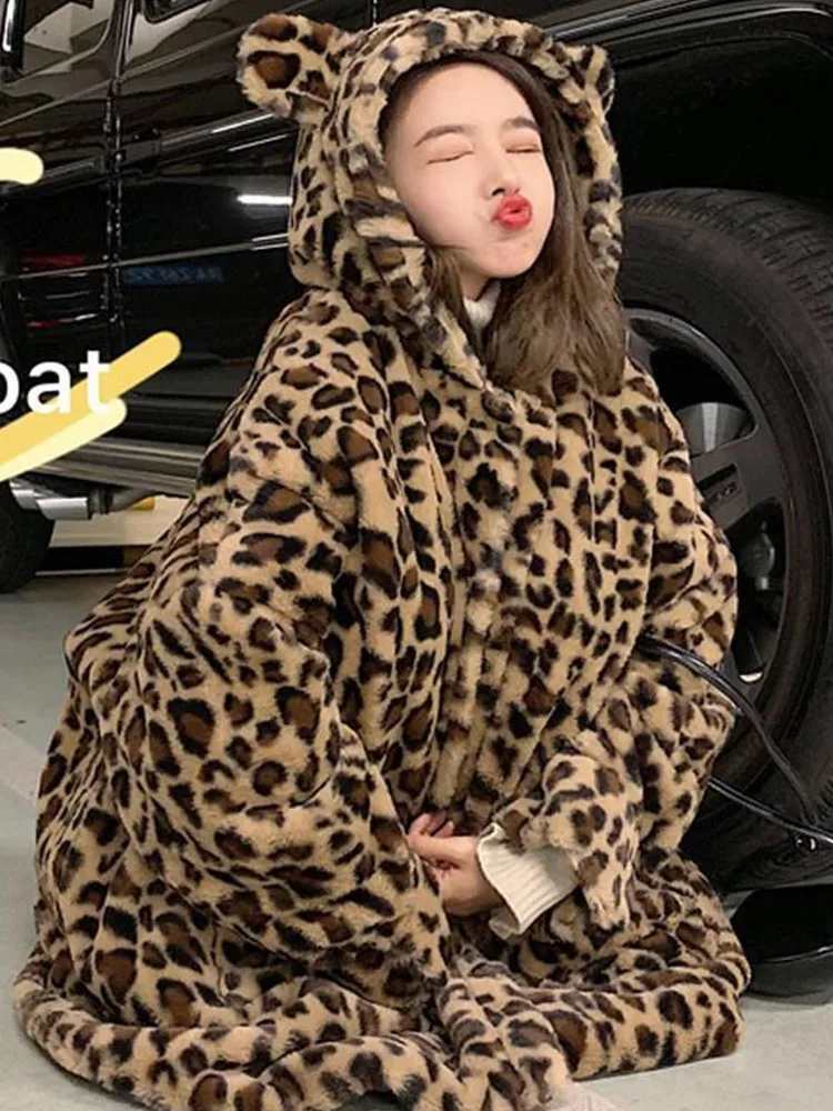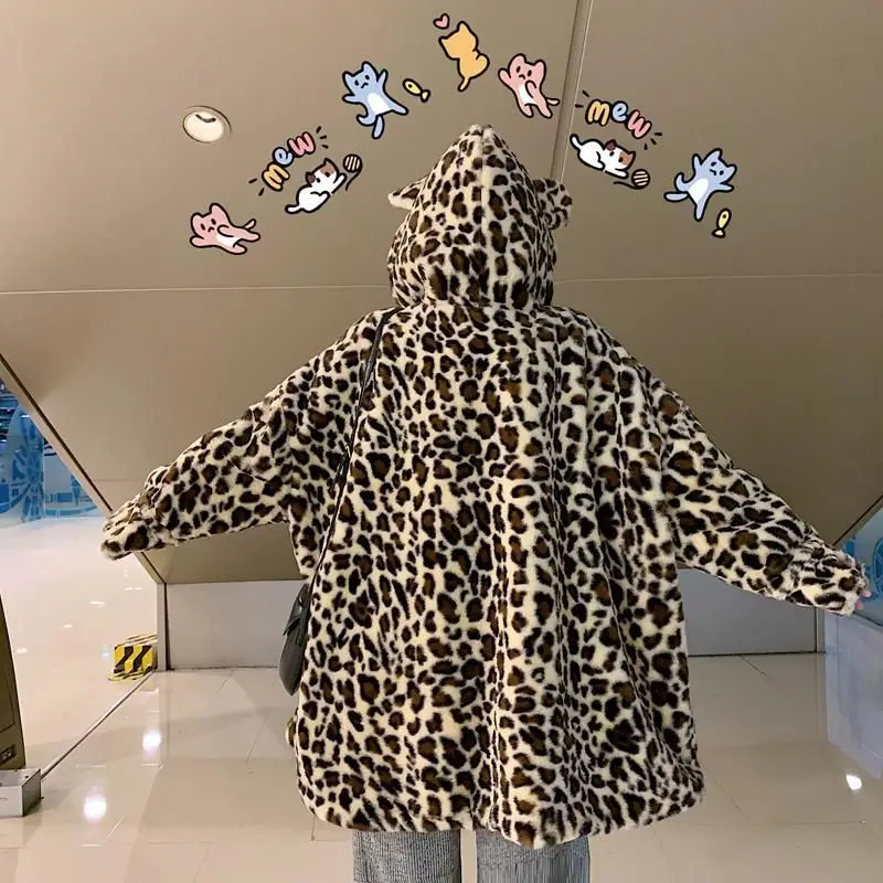 Winter coat for women Korean hooded thick quilted loose leopard print plush padded jacket Woman clothing street girls Coats