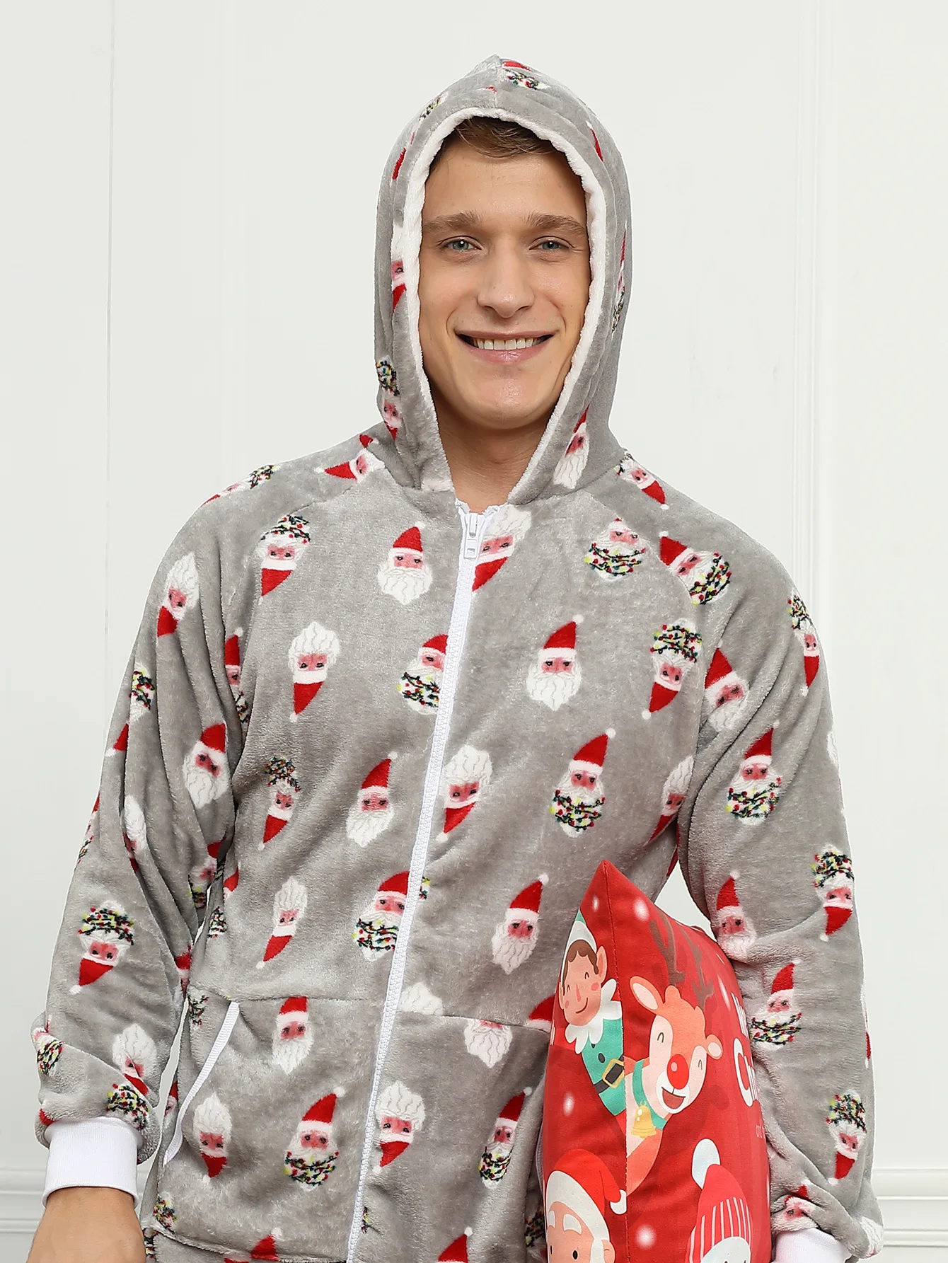 Winter Men Hooded Onesies Flannel Sleepwear Overalls Christmas Grey Print One Piece Pajamas Cosplay Costume