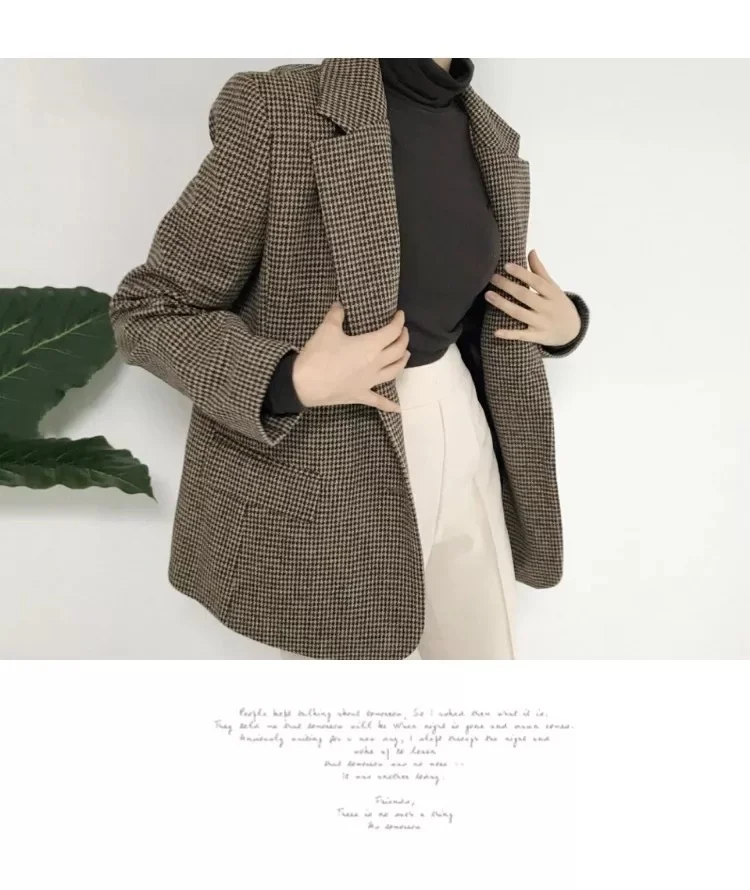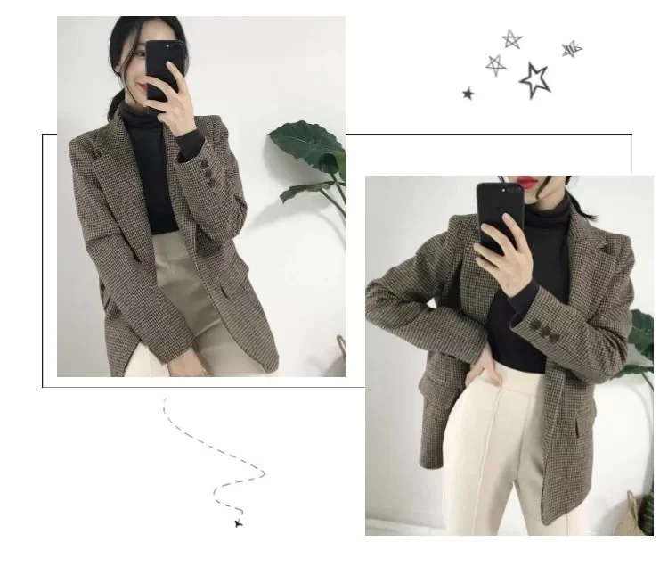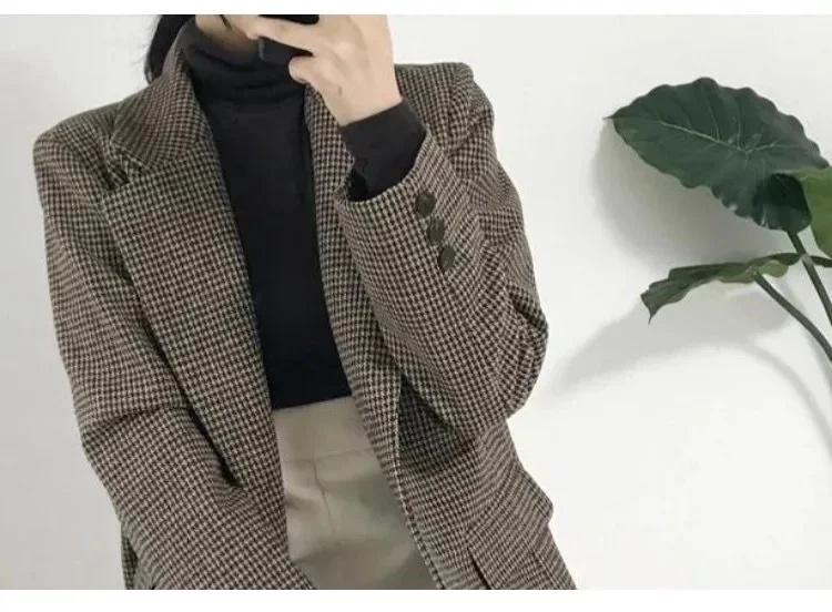 Women Houndstooth Blazer Female Long Sleeve Casual Lady Blazers Formal Suits Single Breasted Coat Vintage Female Pockets Tops