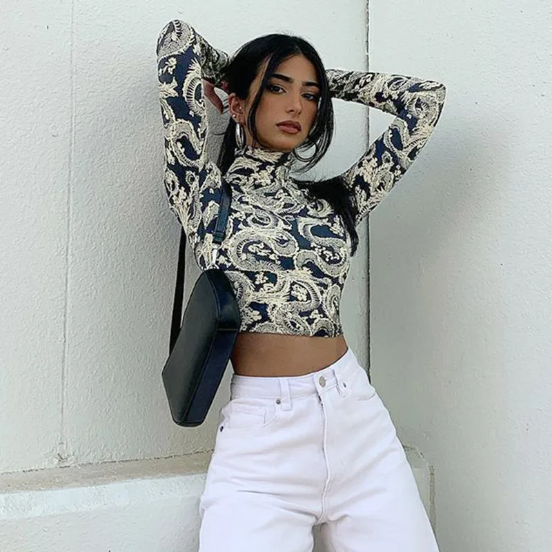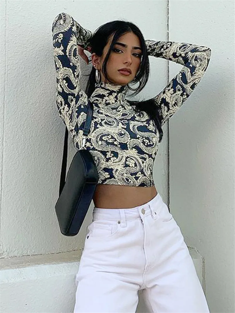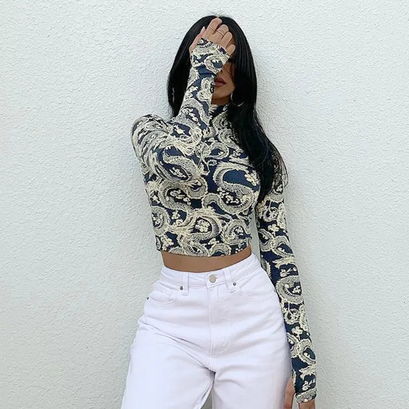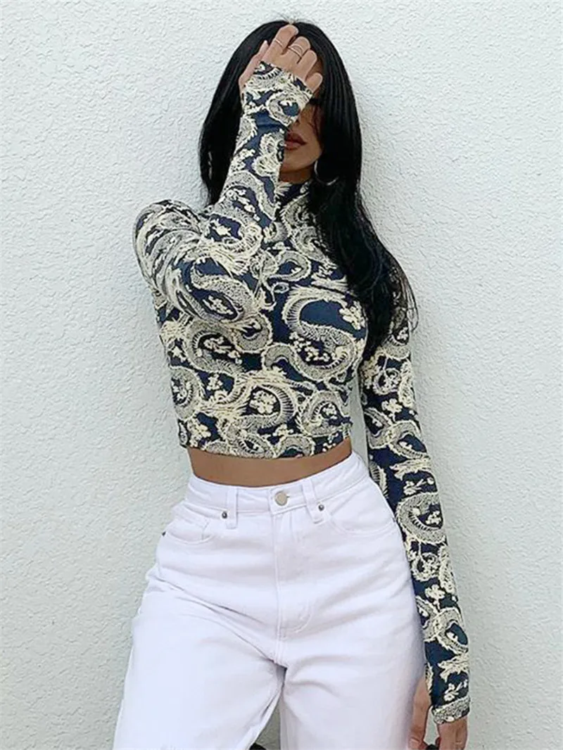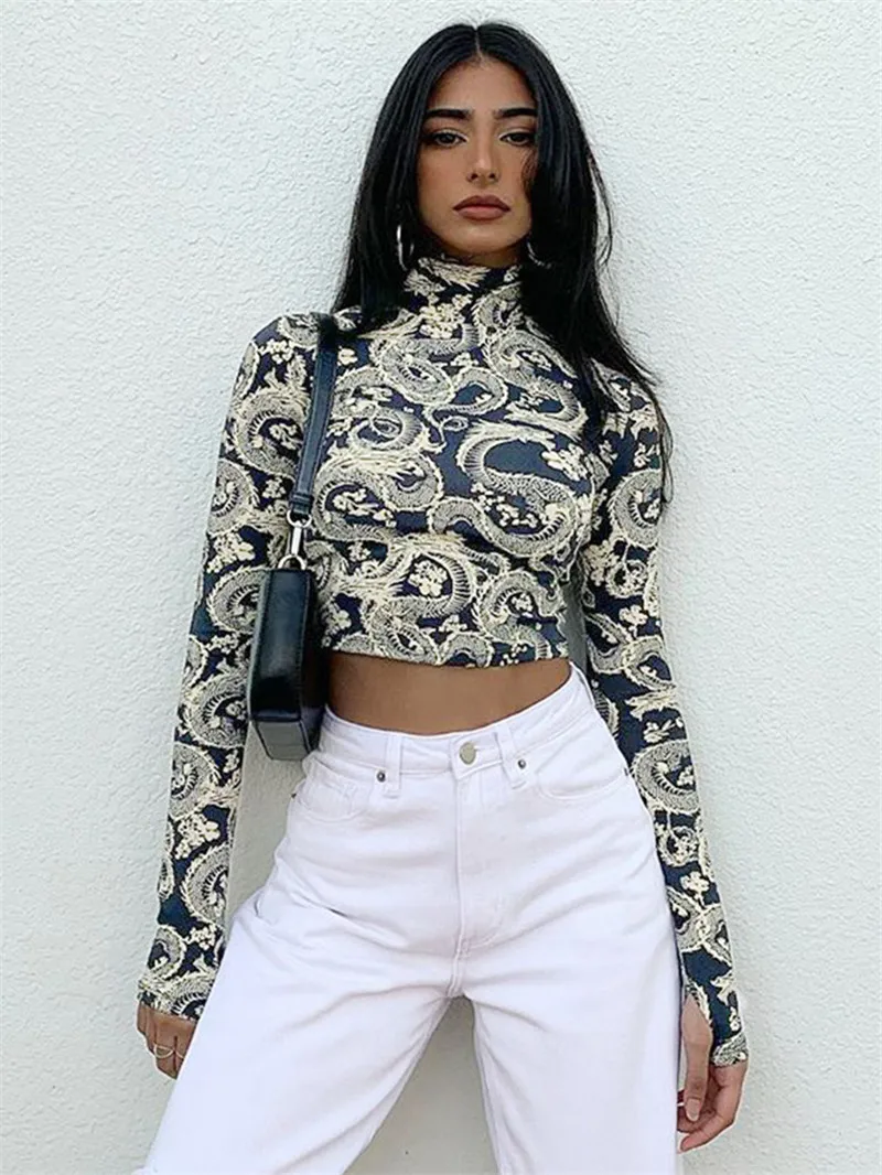 Women's Dragon Printed Crop Tops, Long Sleeve High Collar Short Slim T-shirt for Spring and Autumn