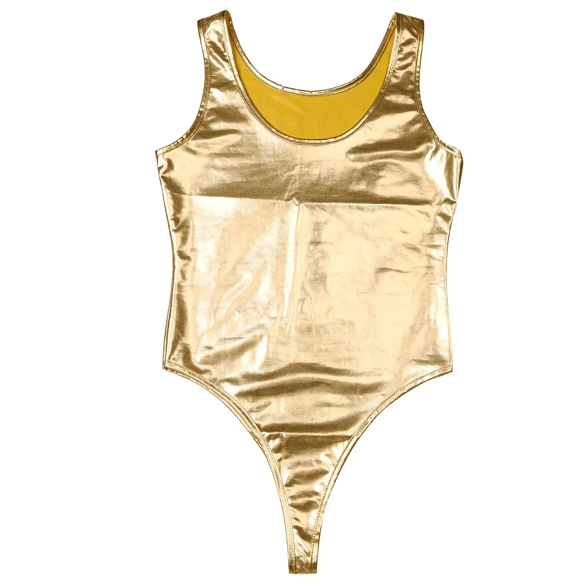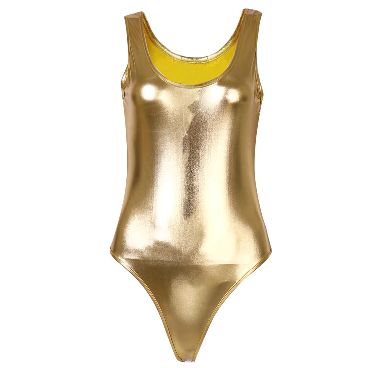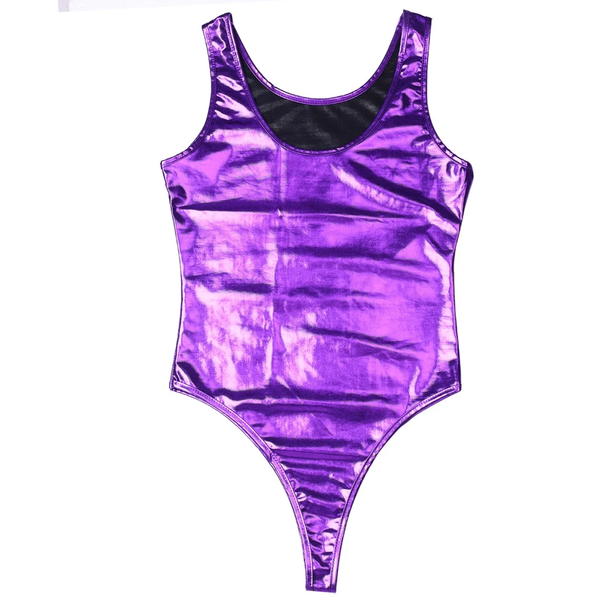Women's Latex Swimsuit Sleeveless High Cut Wetlook Patent Leather Thong Swimming Bodysuit Jumpsuit Gymnastics Leotard Dancewear