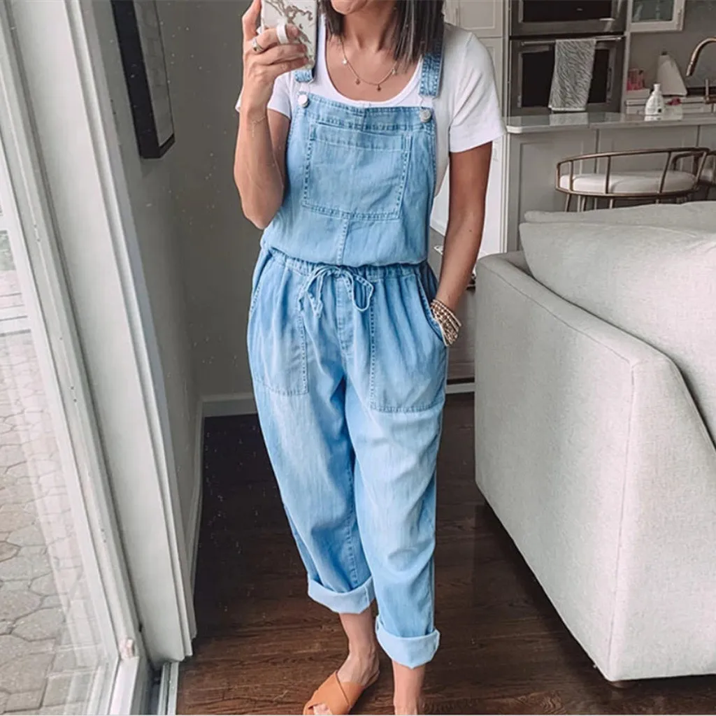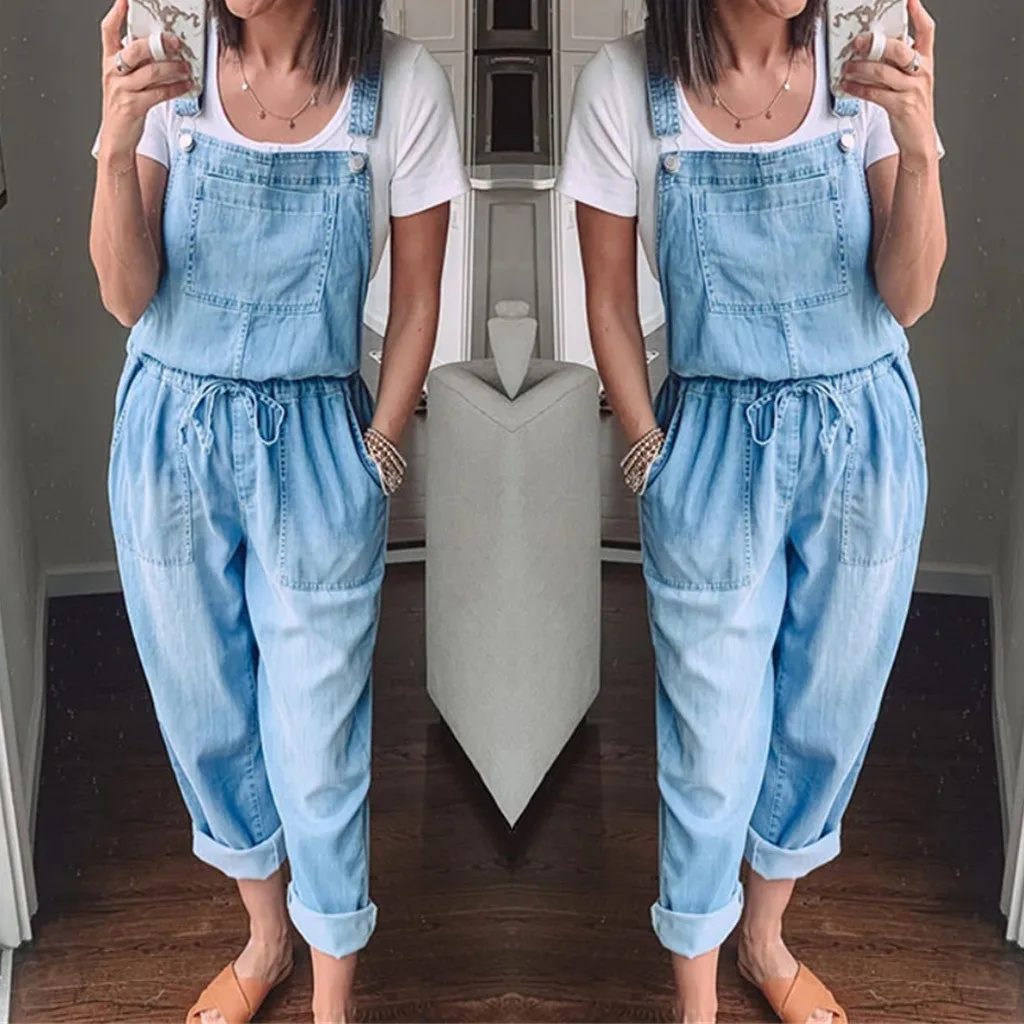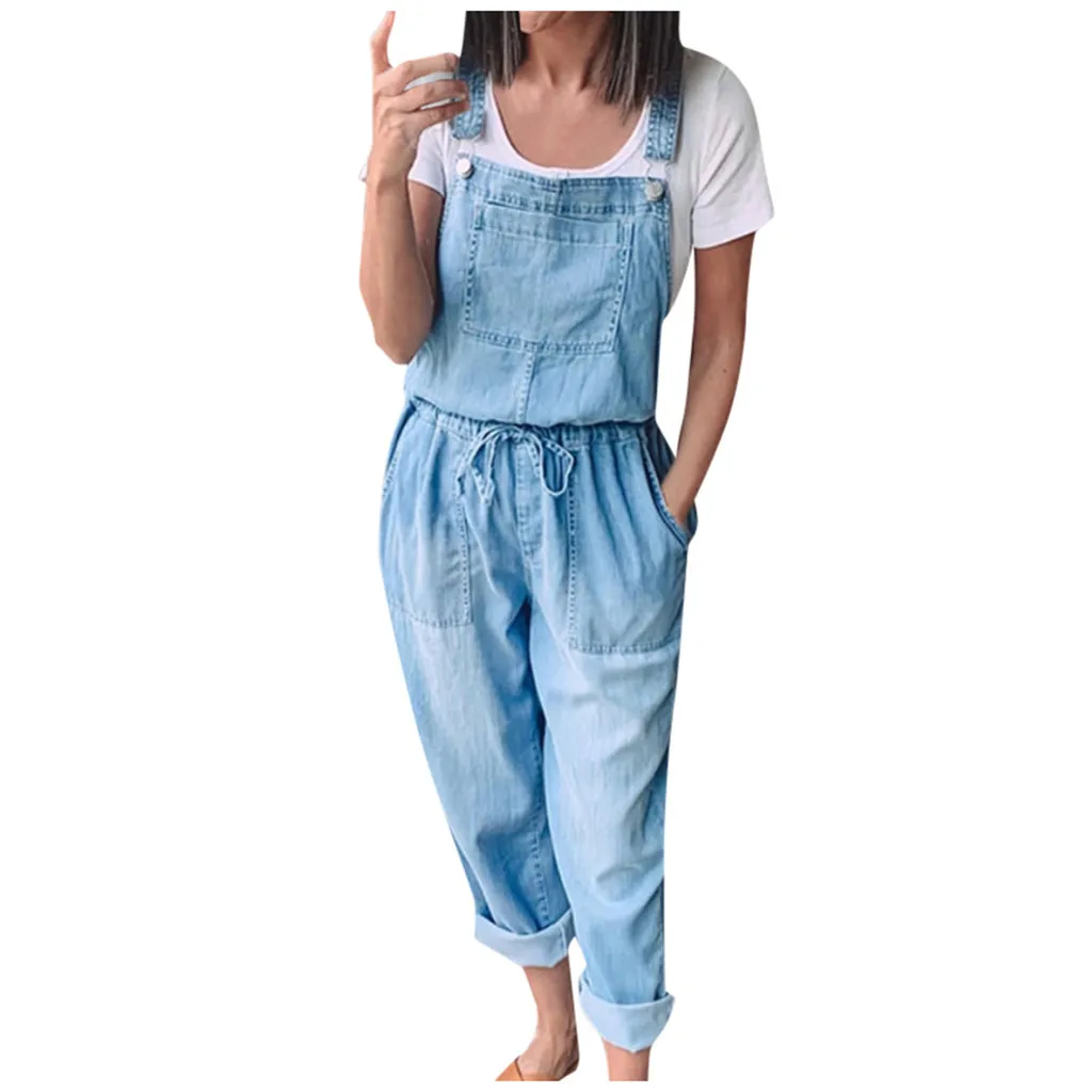 Women Sleeveless Denim High Waisted Wide Playsuits Beach Jumpsuit Solid Color Trousers Loose Casual Female Pockets Overalls